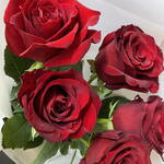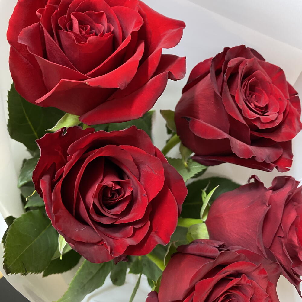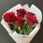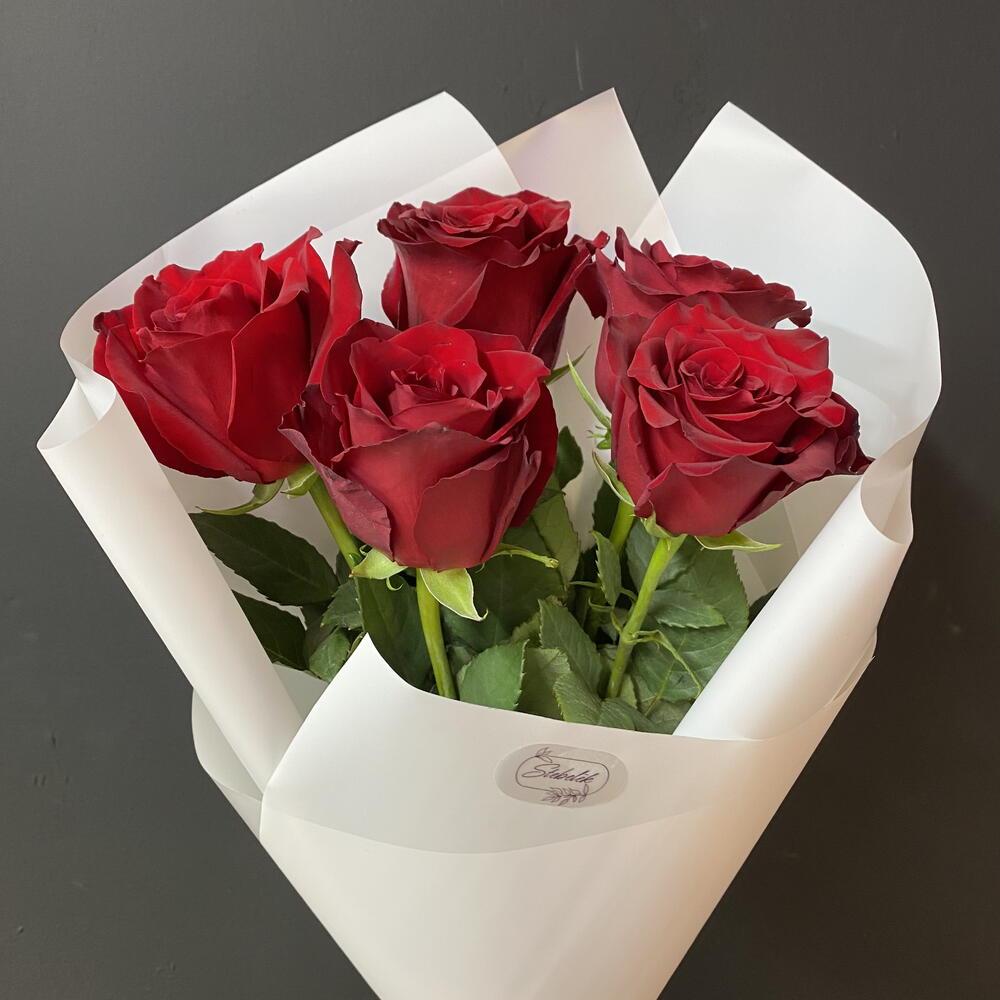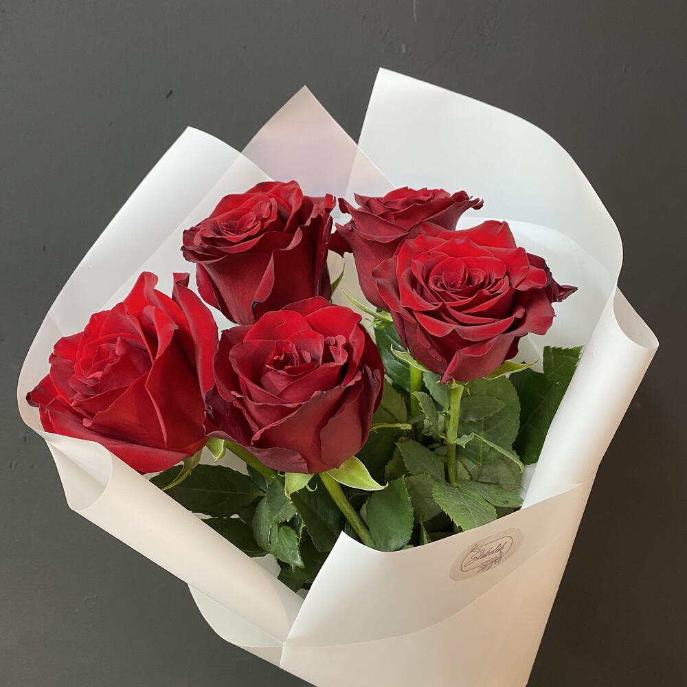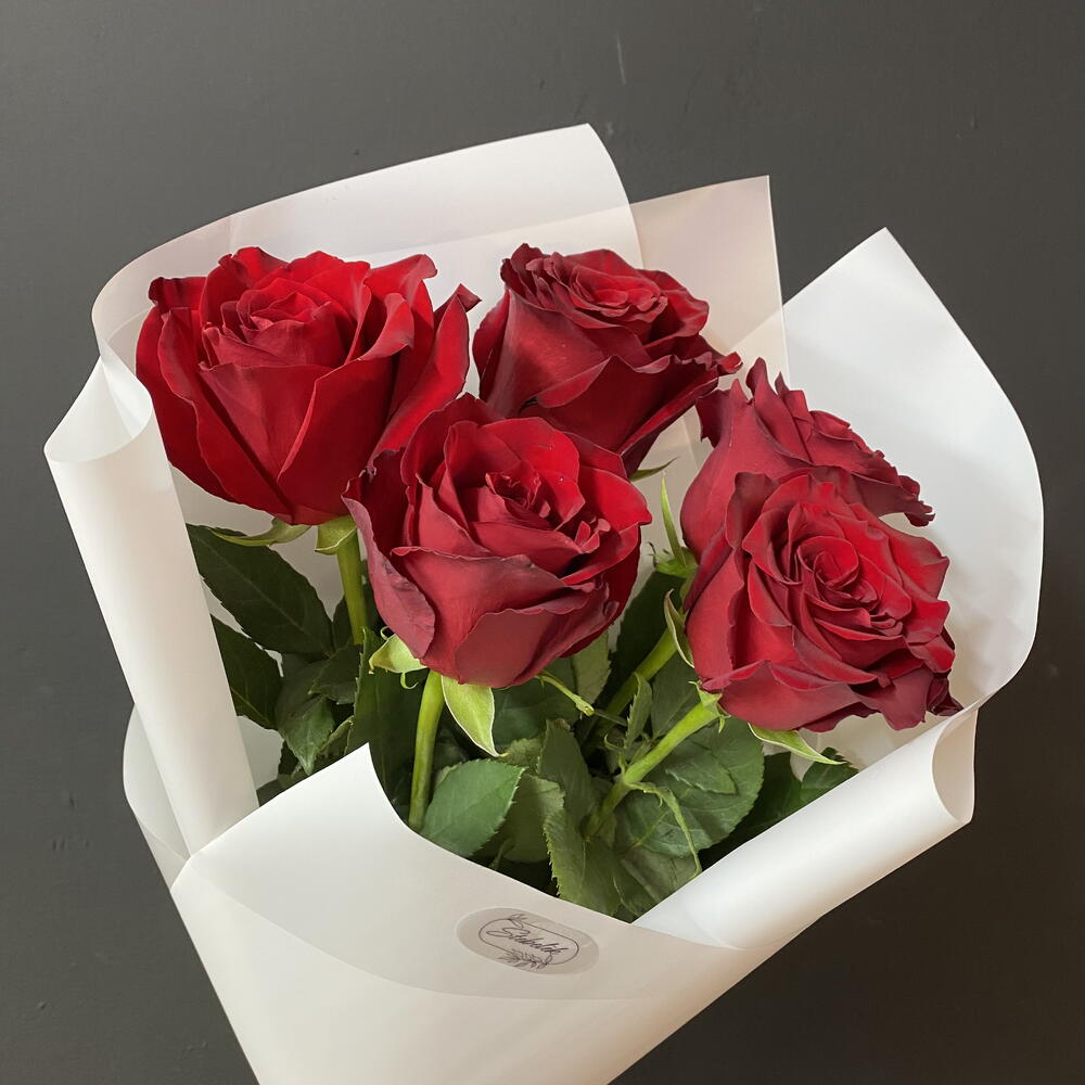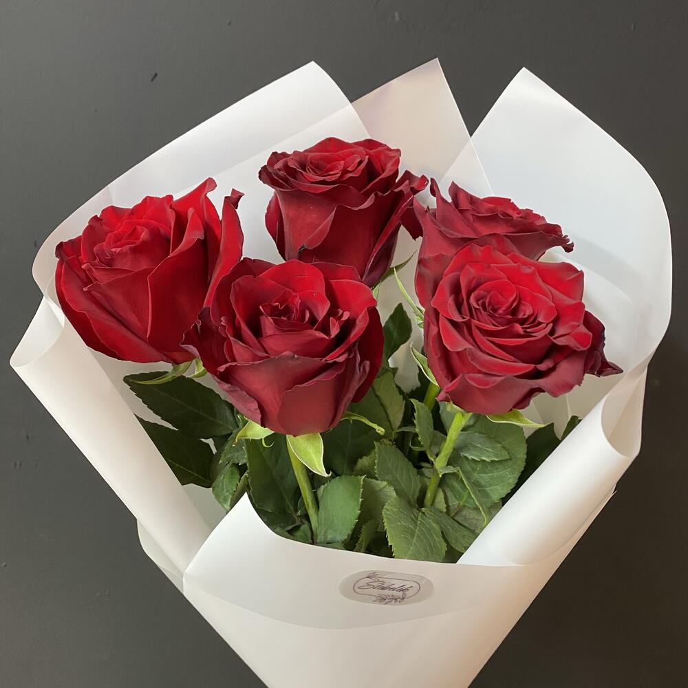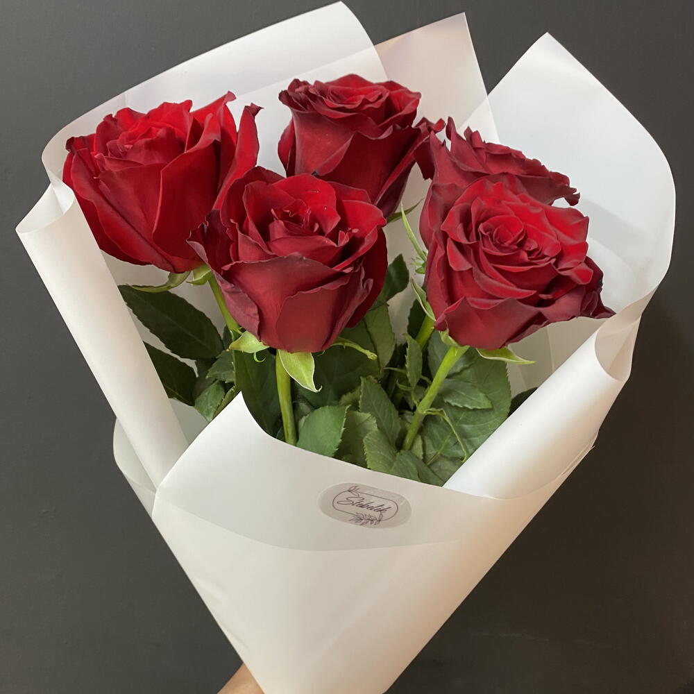 Лента атласная - 1 шт. Роза красная Эквадор - 5 шт. Упаковка дизайнерская - 3 шт.