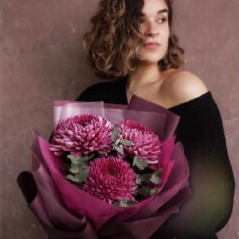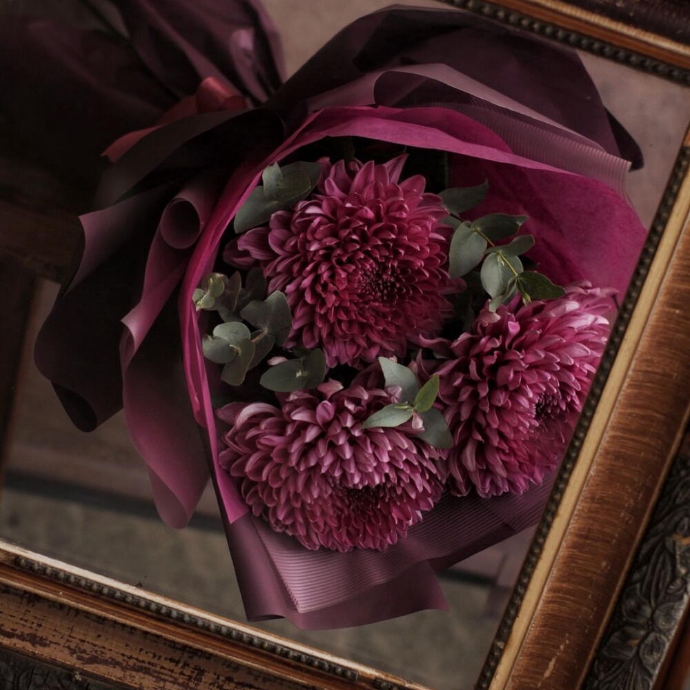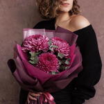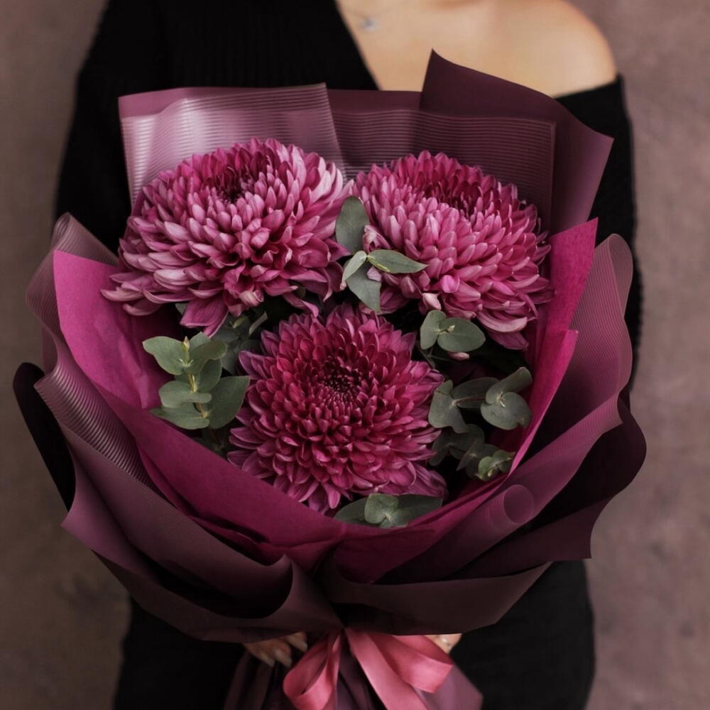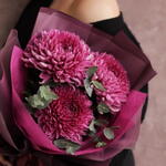 Букет-комплимент из винных хризантем сорта Бигуди и ароматными веточками эвкалипта. Красоту цветов подчеркнёт тёмно-сиреневая упаковка .