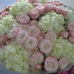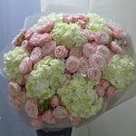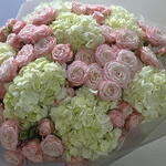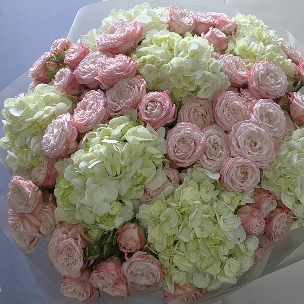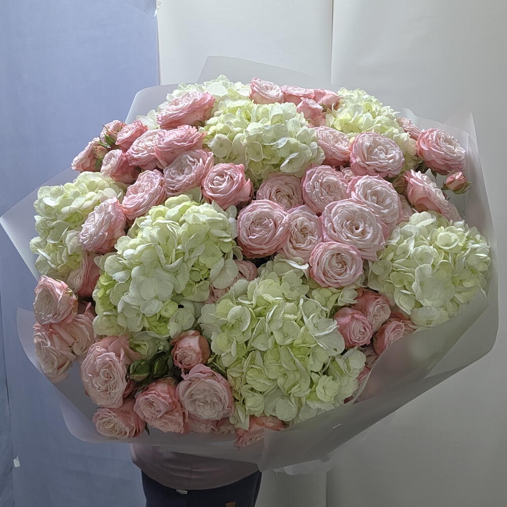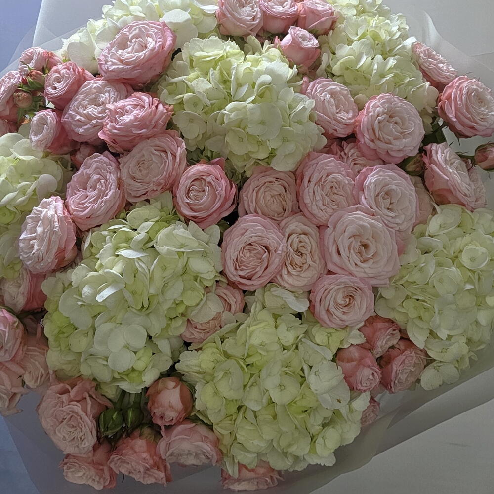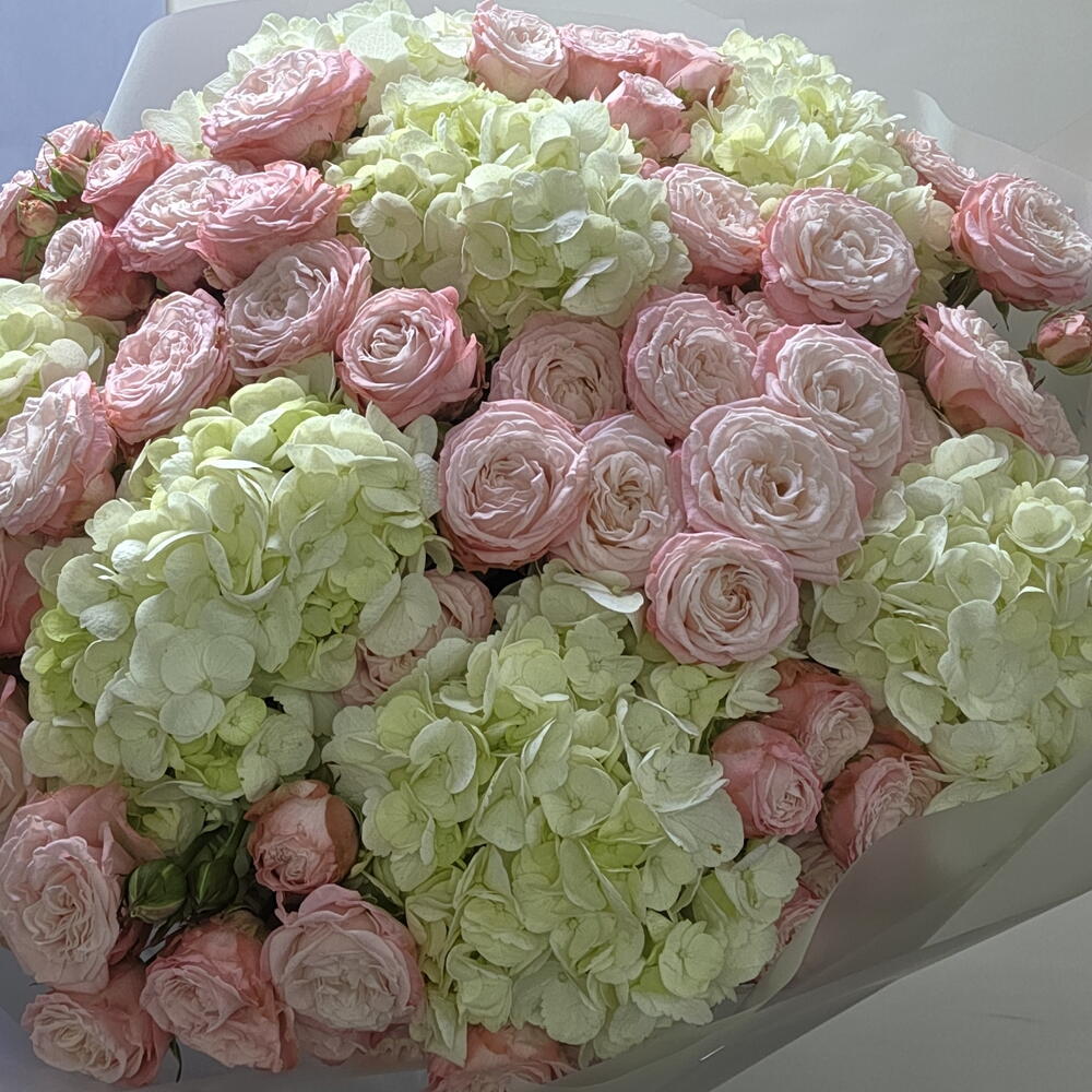 Гортензия - 7 шт. Упаковка - 7 шт. Лента атласная - 2 шт. Кустовая роза пионовидная - 16 шт.