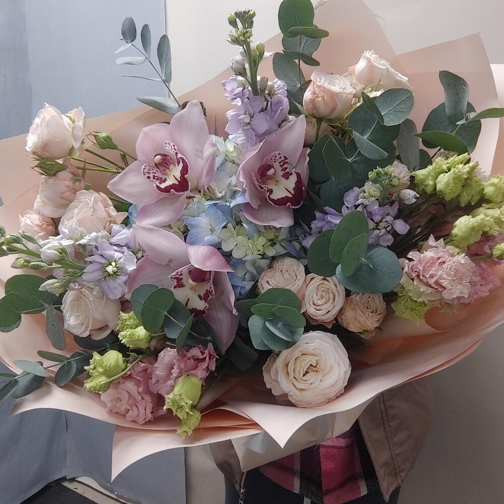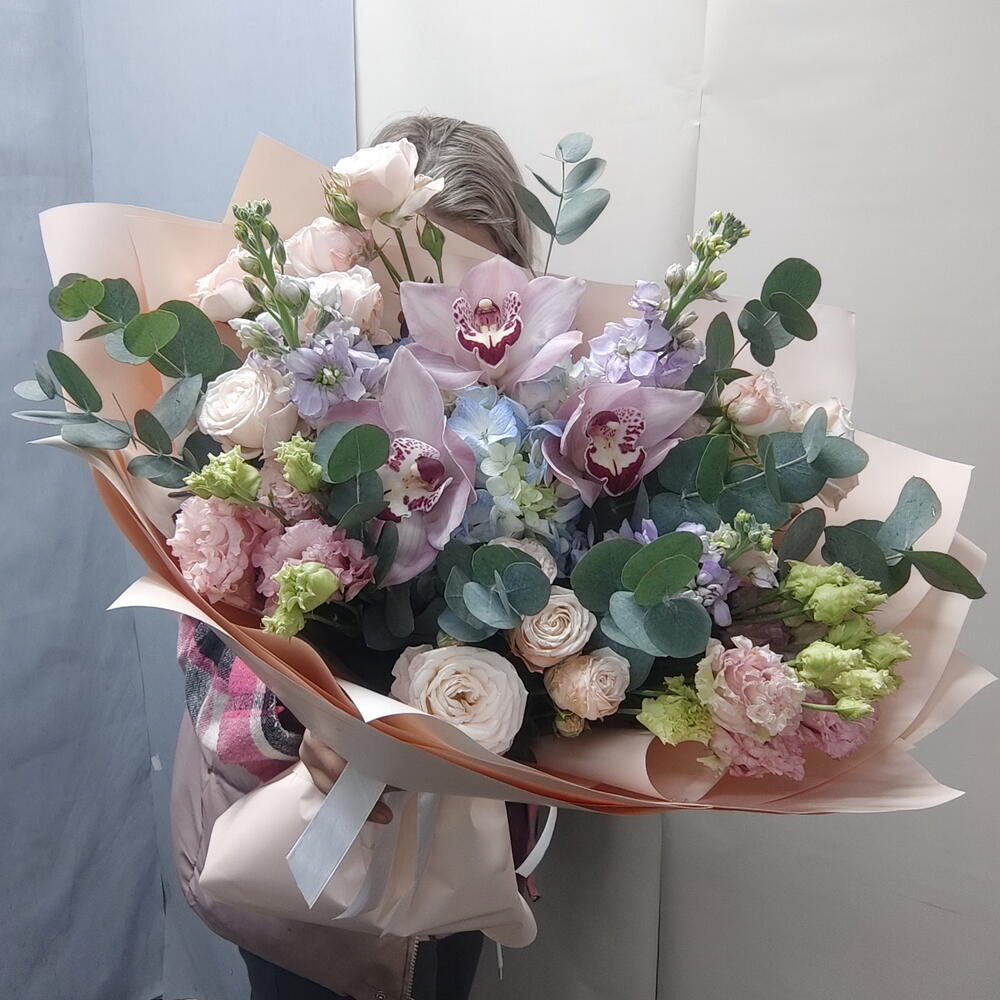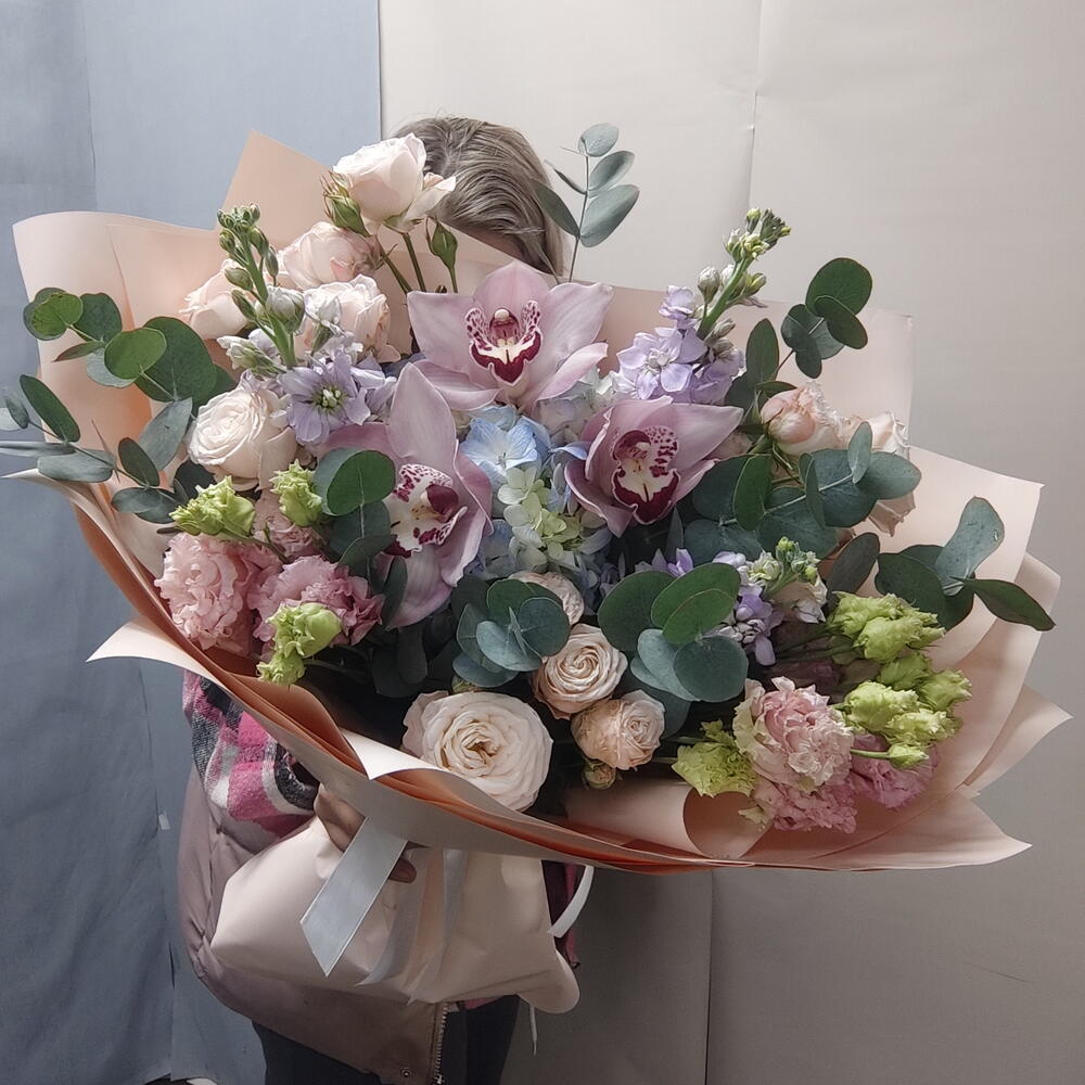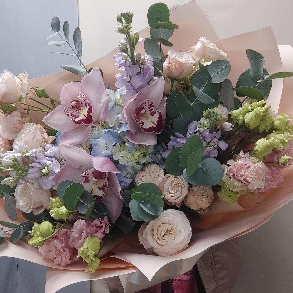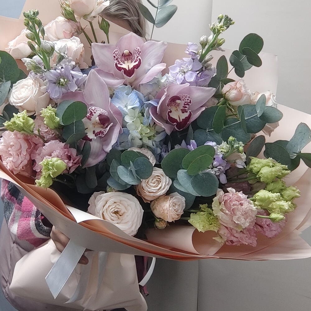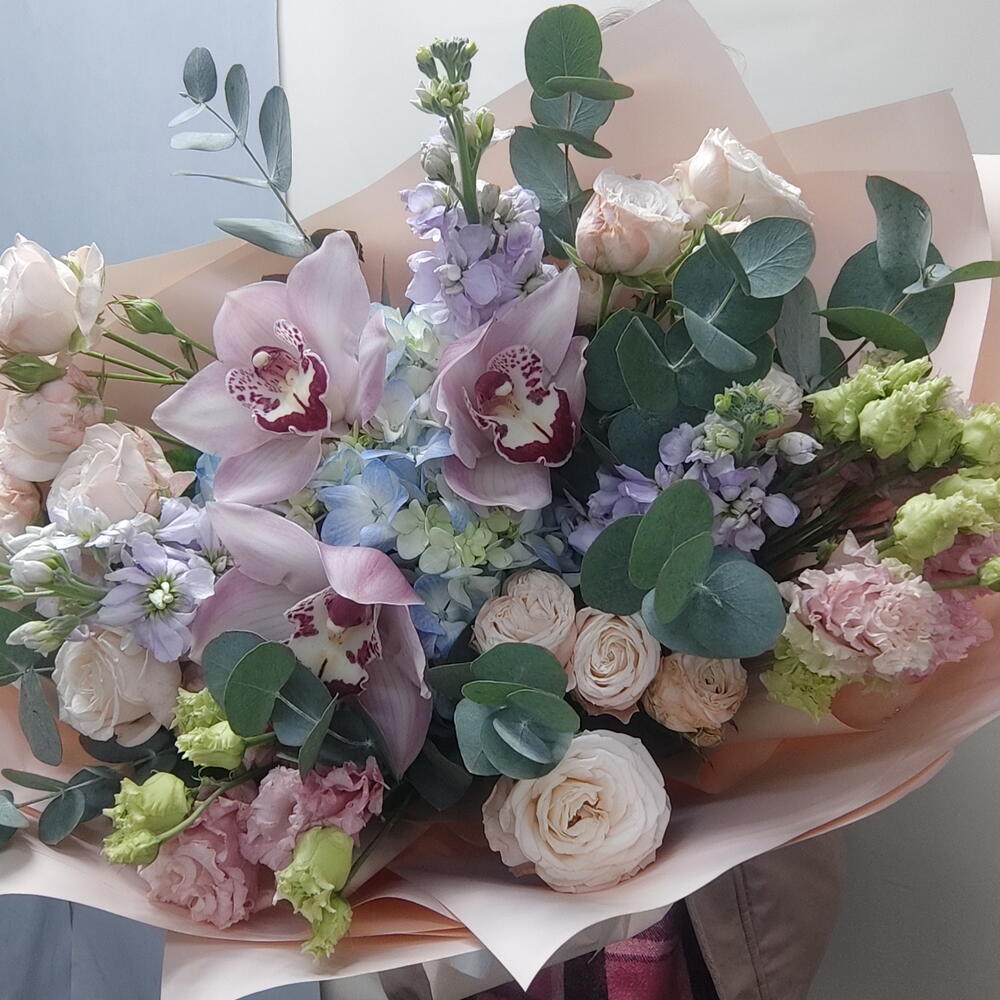 Гортензия - 1 шт. Маттиола - 3 шт. Орхидея Цимбидиум - 3 шт. Эвкалипт - 6 шт. Упаковка - 6 шт. Эустома - 3 шт. Лента атласная - 2 шт. кустовой пионовидной розы - 3 шт.
