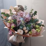 Букет из кустовой пионовидной розы, эвкалипта, эустомы, гортензиии, орхидеи