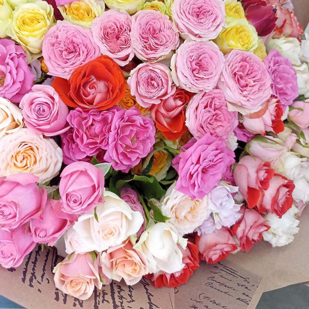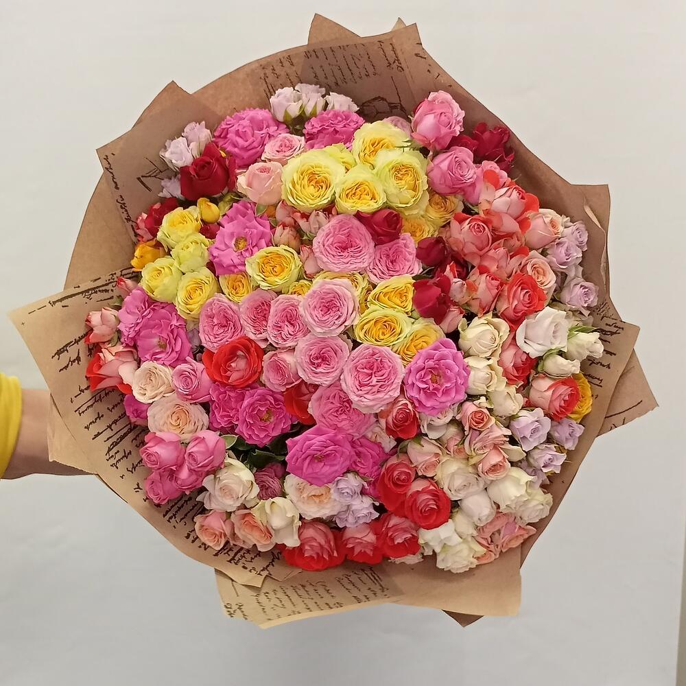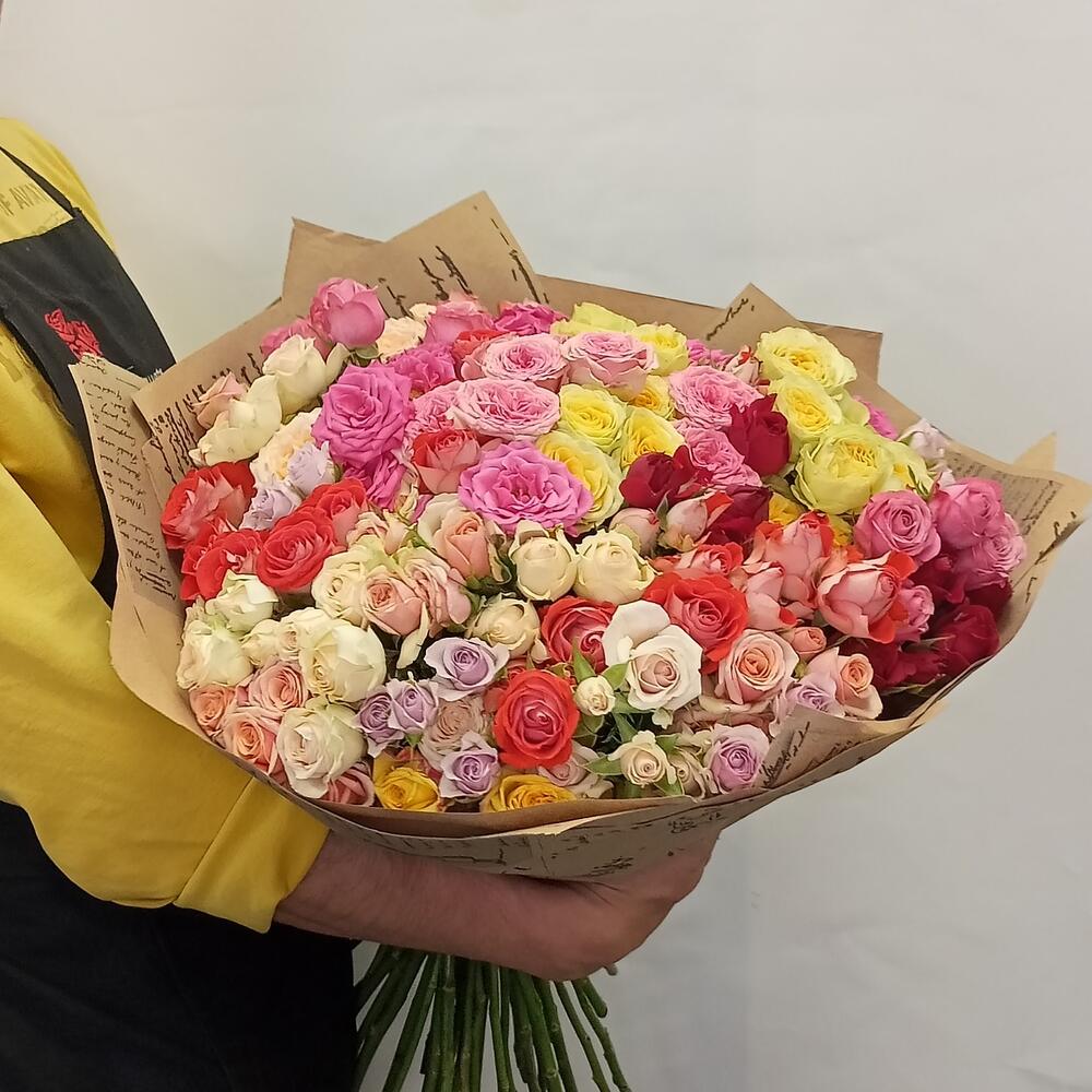 Роза кустовая - 51 шт. Лента атласная - 1 шт. Упаковка дизайнерская - 1 шт.