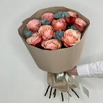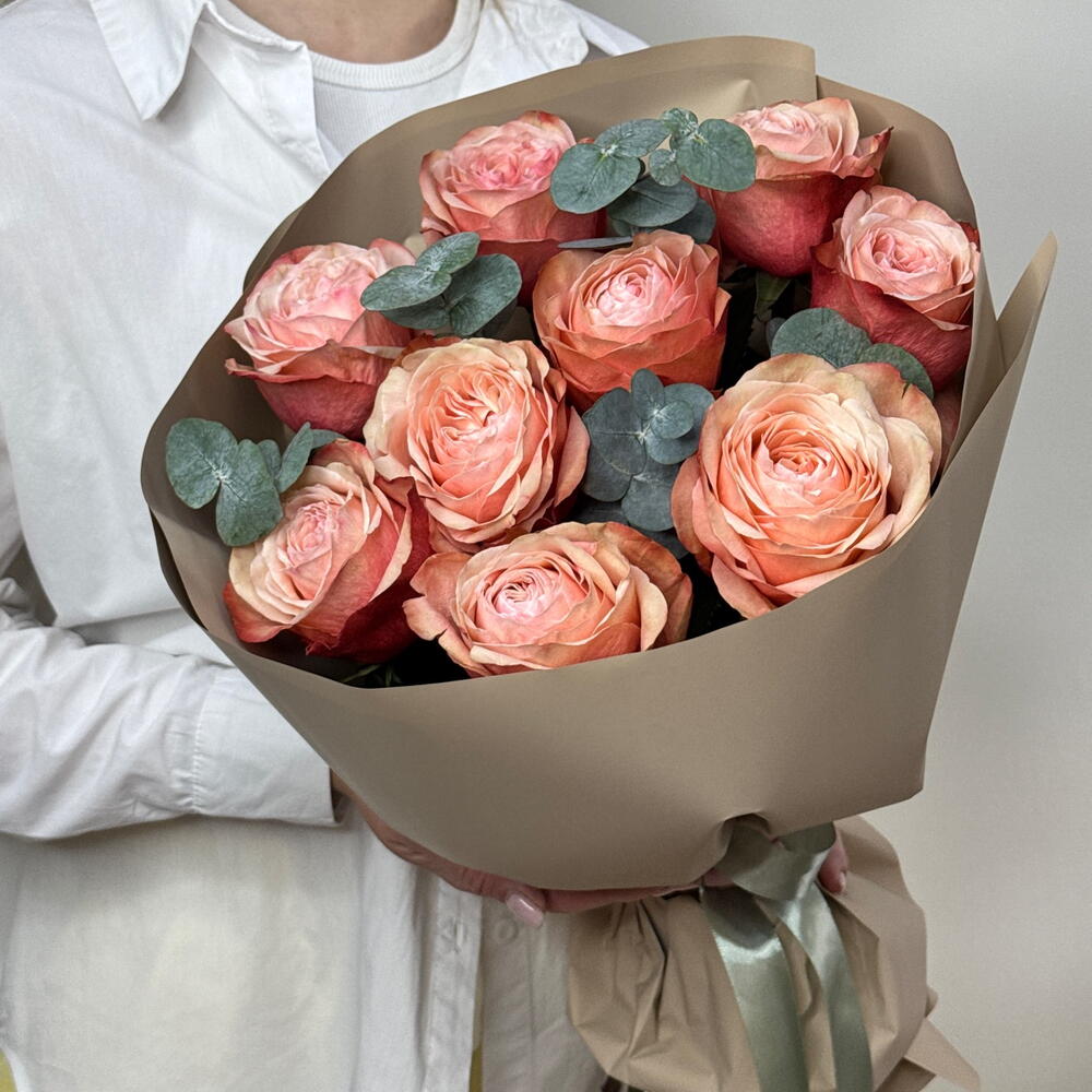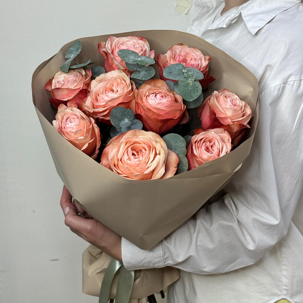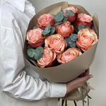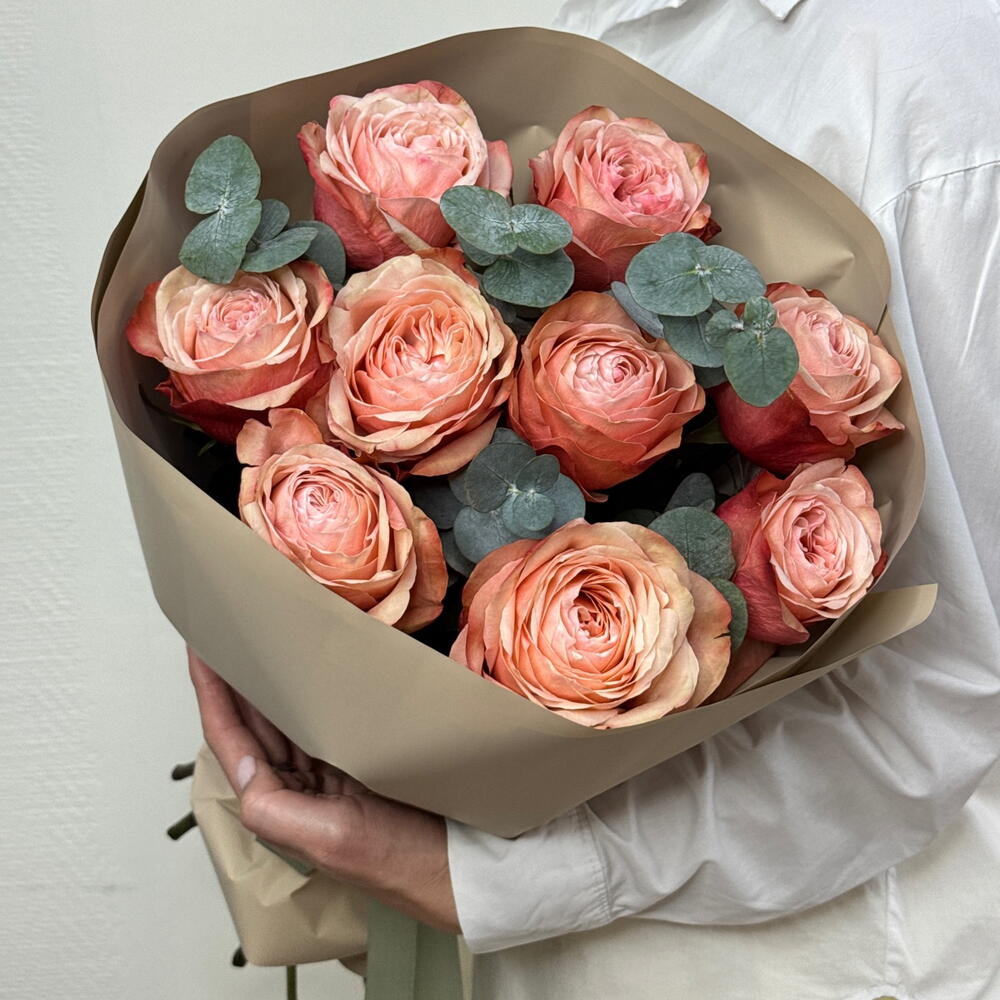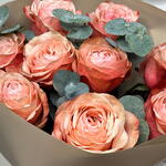 Эвкалипт - 50 гр. Упаковка дизайнерская - 1 шт. Роза пионовидная эквадор - 9 шт.