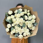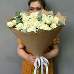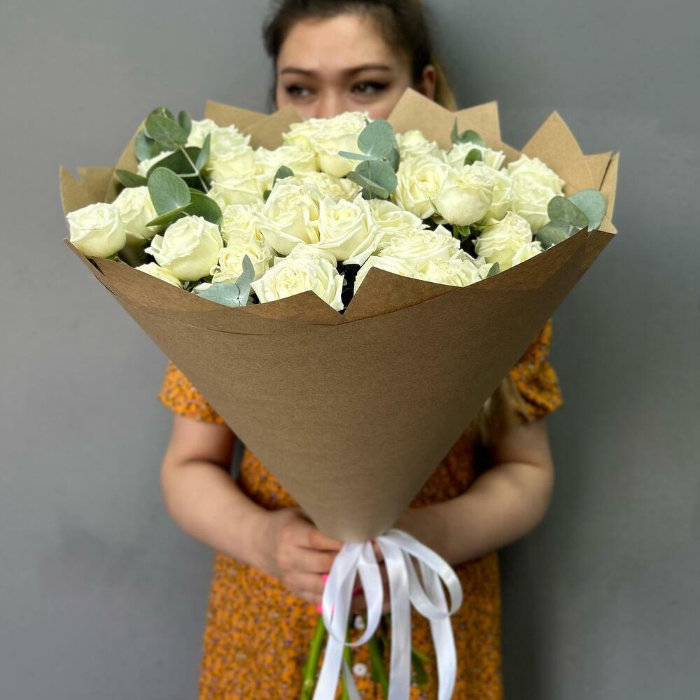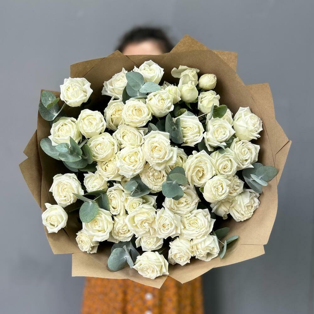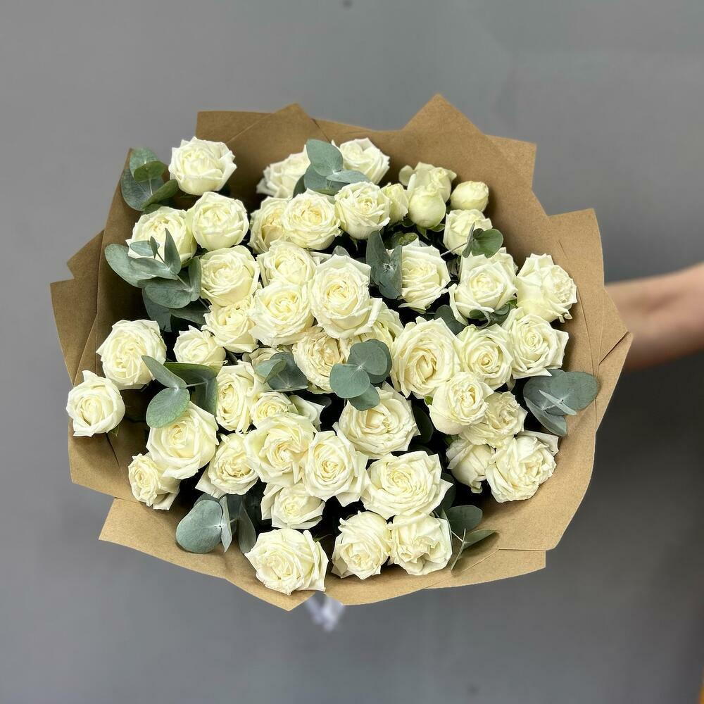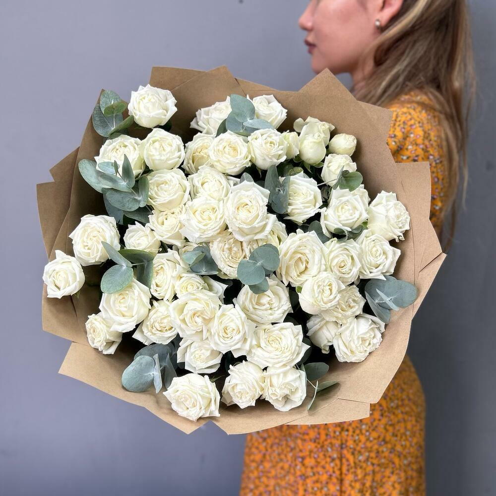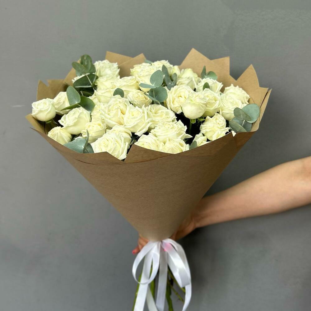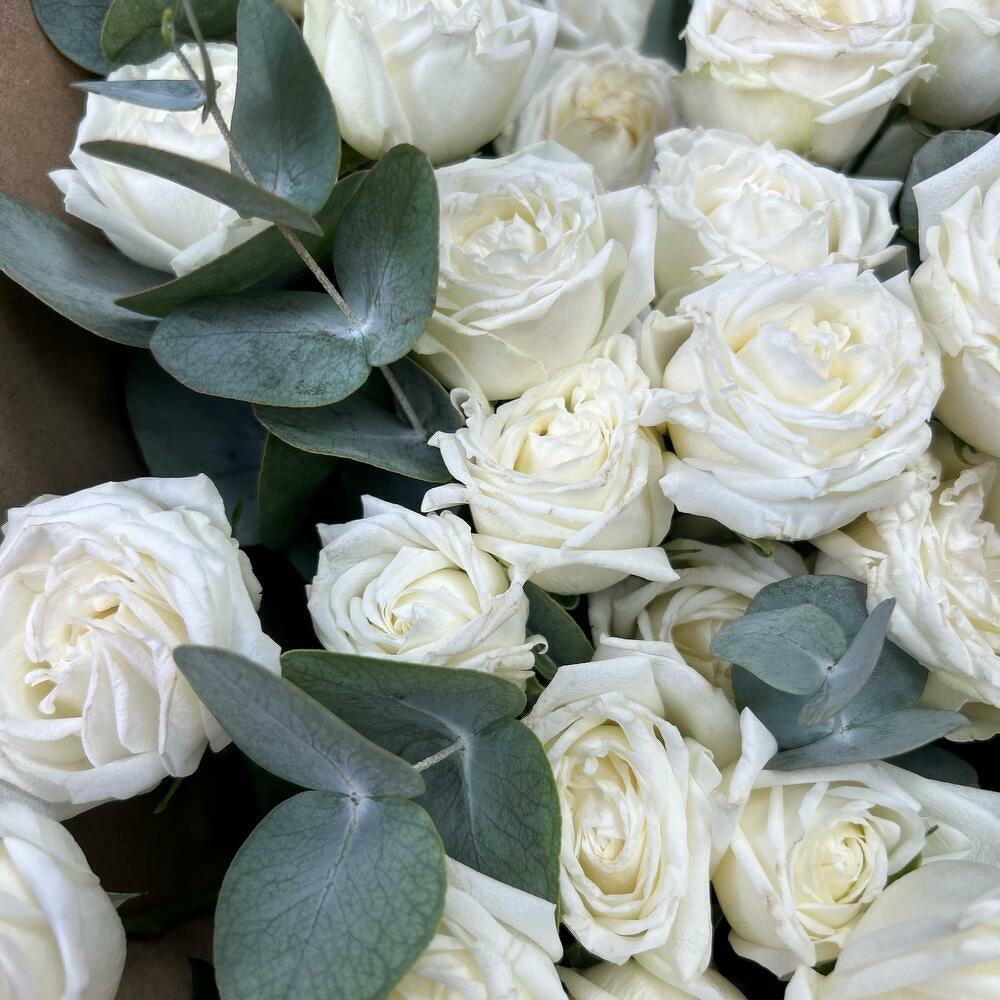 Кустовая роза - 9 шт. Упаковка дизайнерская - 1 шт. Эвкалипт Цинерея - 5 шт.