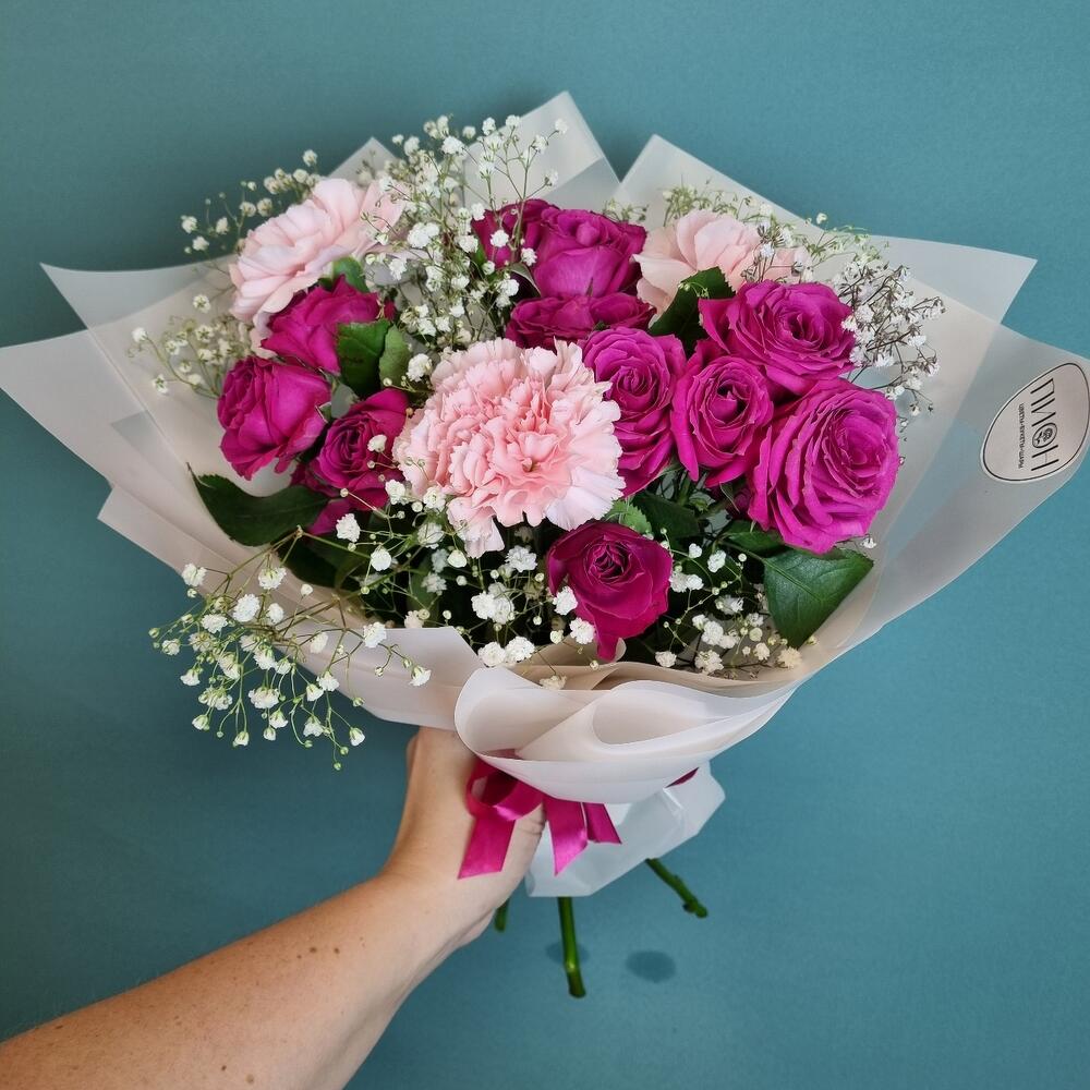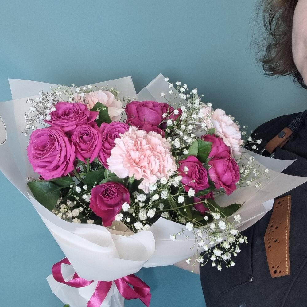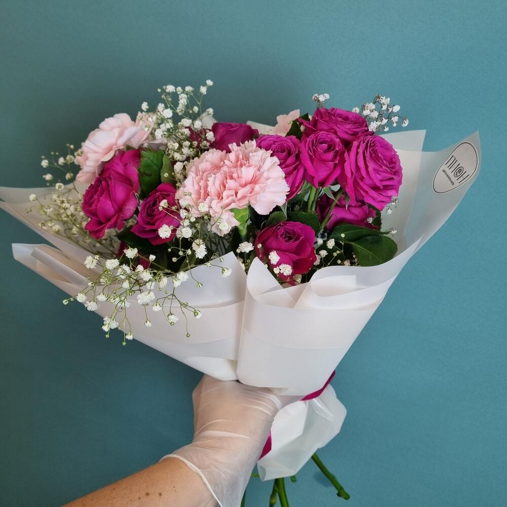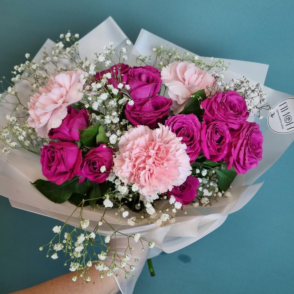 Гипсофила - 1 шт. Роза кустовая - 3 шт. Оформление - 1 шт. Диантус сортовой - 3 шт.