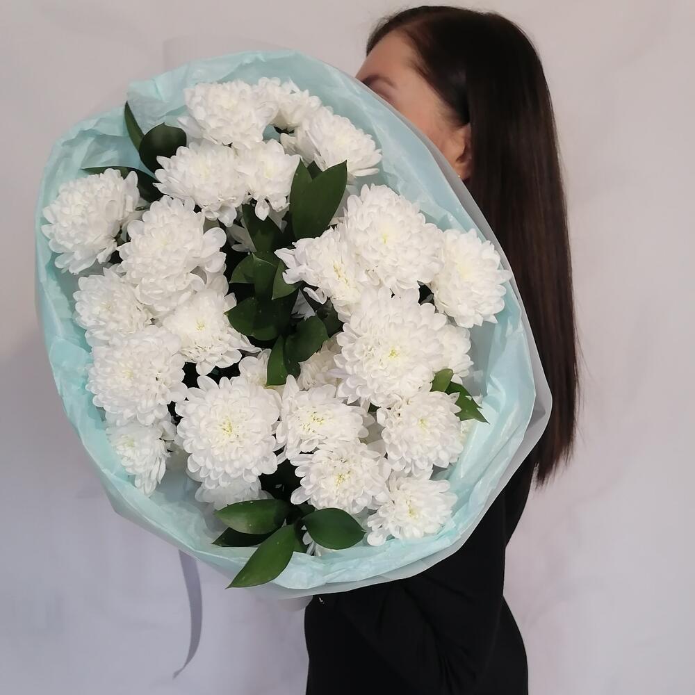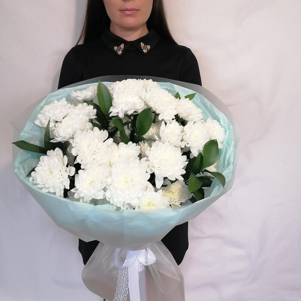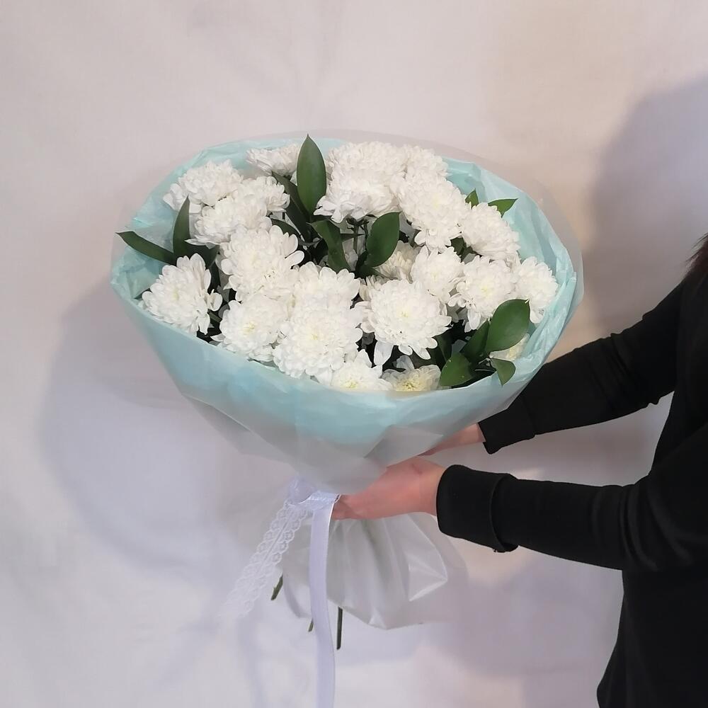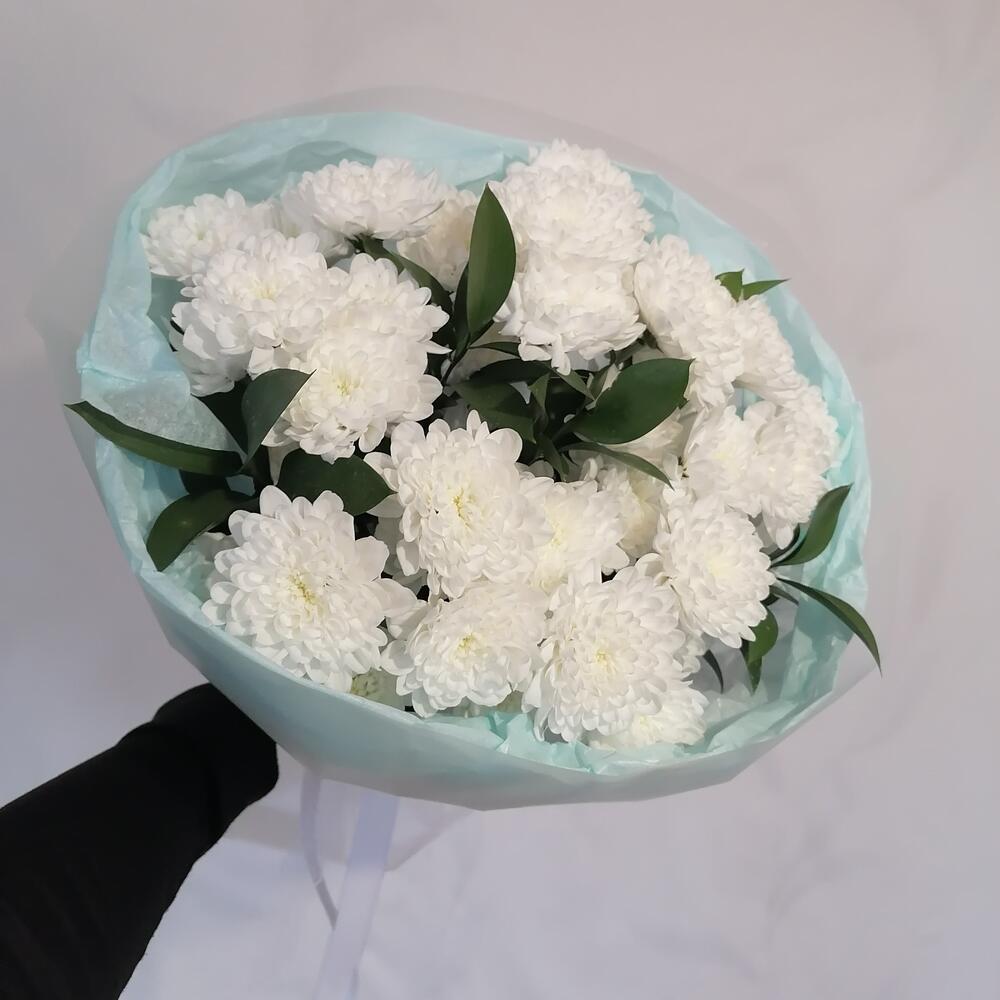 Рускус - 5 шт. Лента атласная - 1 шт. Тишью - 2 шт. Пленка матовая - 2 шт. Дизайнерское оформление - 1 шт. частичка любви флориста - 1 шт. Хризантема кустовая Алтай - 5 шт.