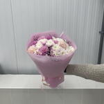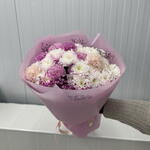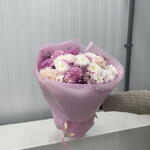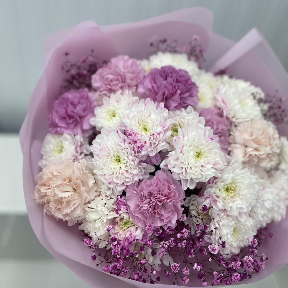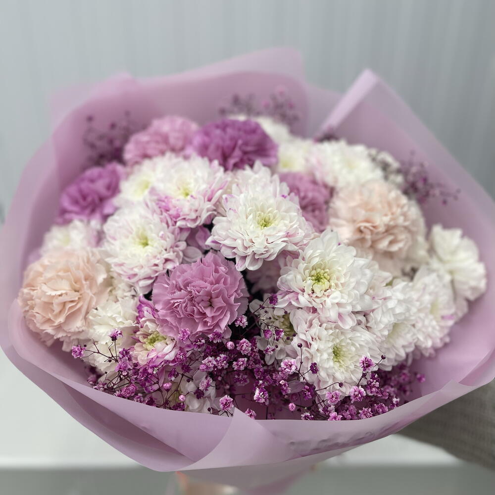 Этот букет — очень нежный, воздушный и трогательный В основе композиции - белые хризантемы с плотными, пушистыми соцветиями и розовые гвоздики, которые добавляют мягкий рельеф и романтичное настроение. Цветы гармонично переплетаются между собой, создавая ощущение уюта и спокойствия. Композицию дополняет розовая гипсофила - мелкие ажурные цветочки придают букету лёгкость и делают его похожим на сладкое цветочное облако. Цветовая палитра выдержана в пастельных оттенках розового и белого, выглядит очень нежно и женственно. Букет оформлен в матовую розовую упаковку, аккуратно собранную и перевязанную белой лентой, что подчёркивает чистоту и изящество образа. Общее впечатление: • нежности, забота, тепло и искренние чувства Отлично подойдёт для дня рождения, благодарности, поздравления молодой девушке или просто как знак внимания «от души».
