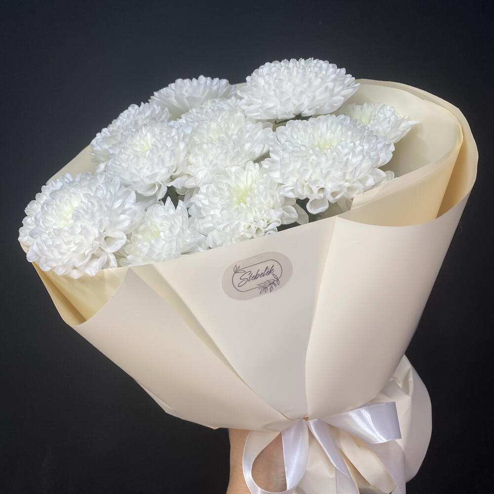 Лента атласная - 2 шт. Упаковка дизайнерская - 3 шт. хризантема кустовая «алтай» - 3 шт.