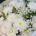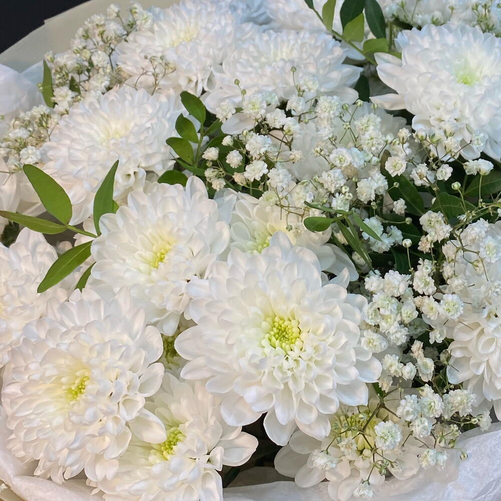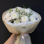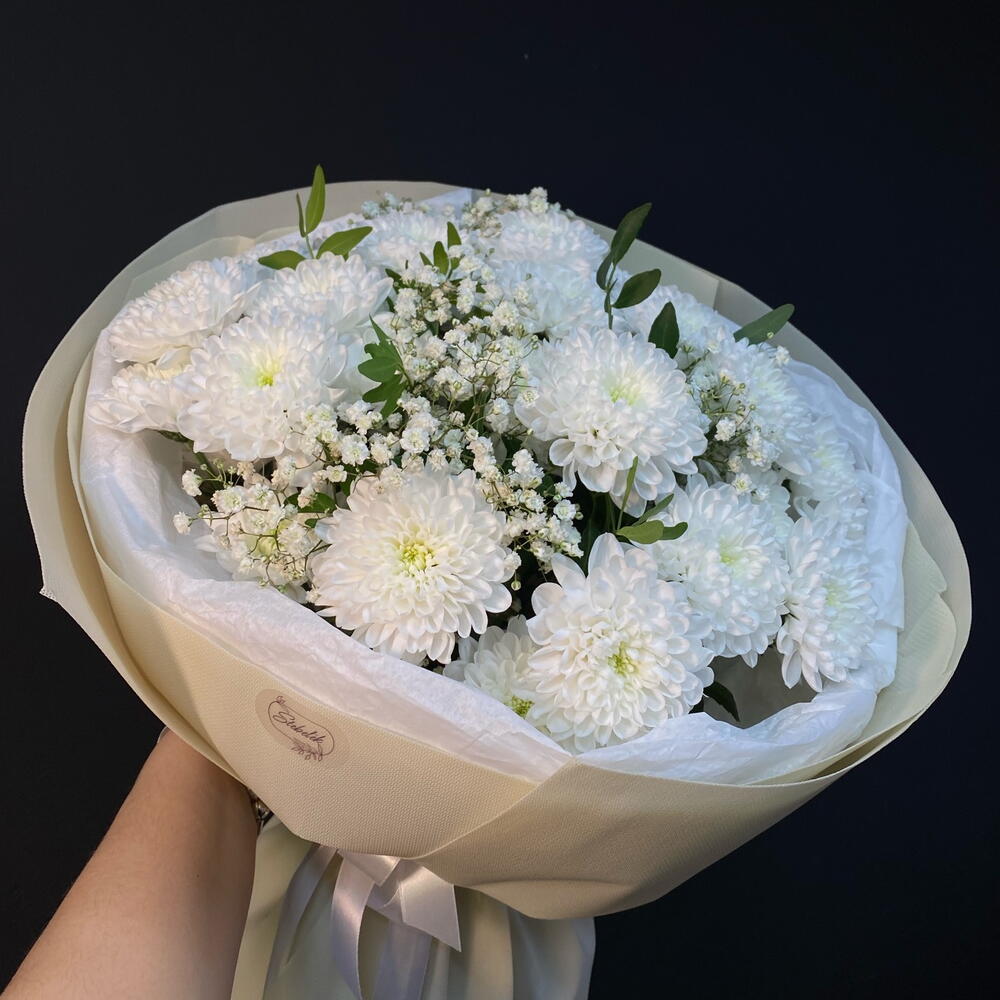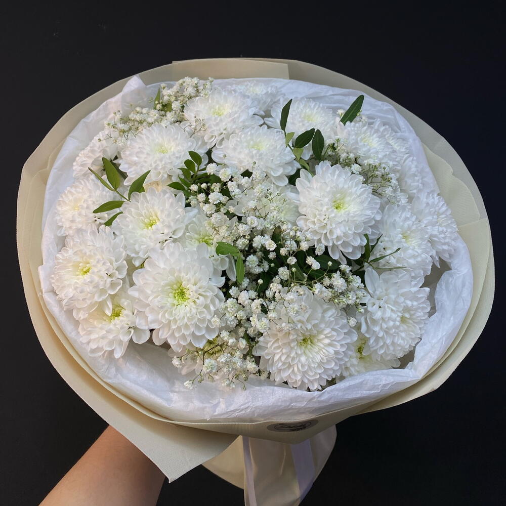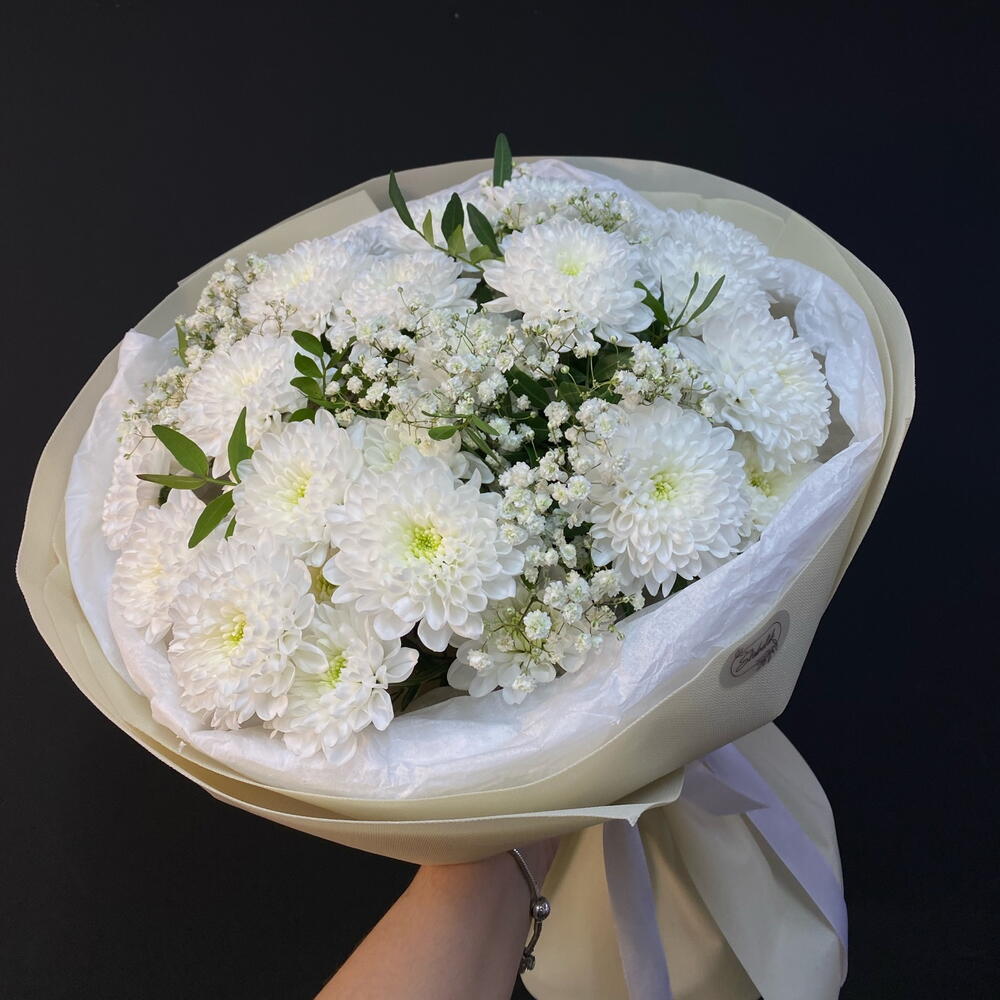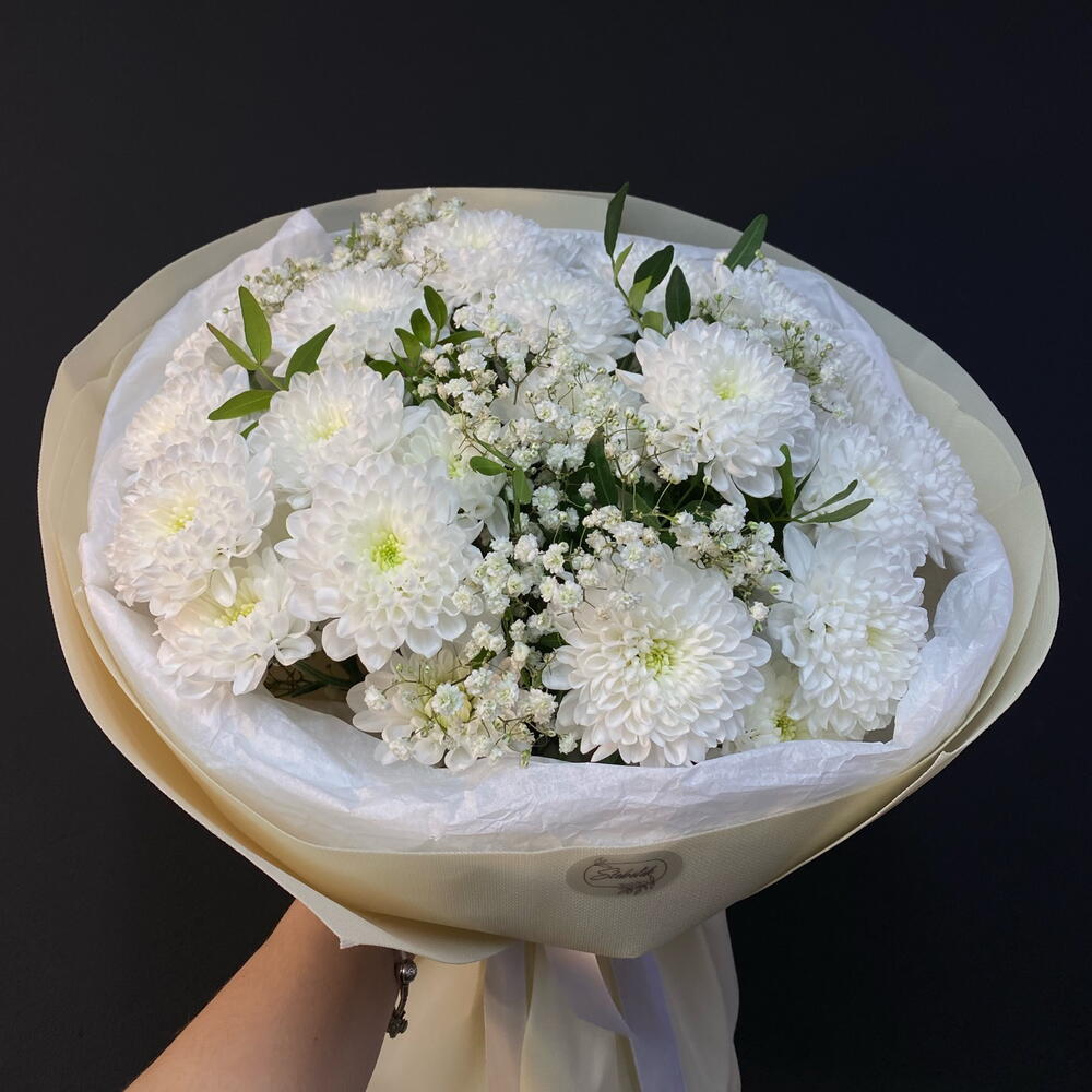 Гипсофила - 3 шт. Лента атласная - 2 шт. Упаковка дизайнерская - 4 шт. зелень фисташки - 3 шт. Хризантема кустовая Алтай - 5 шт.