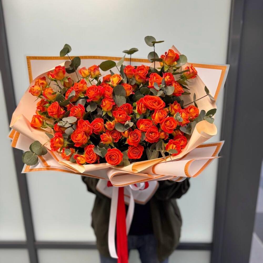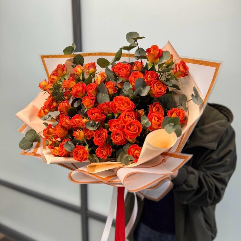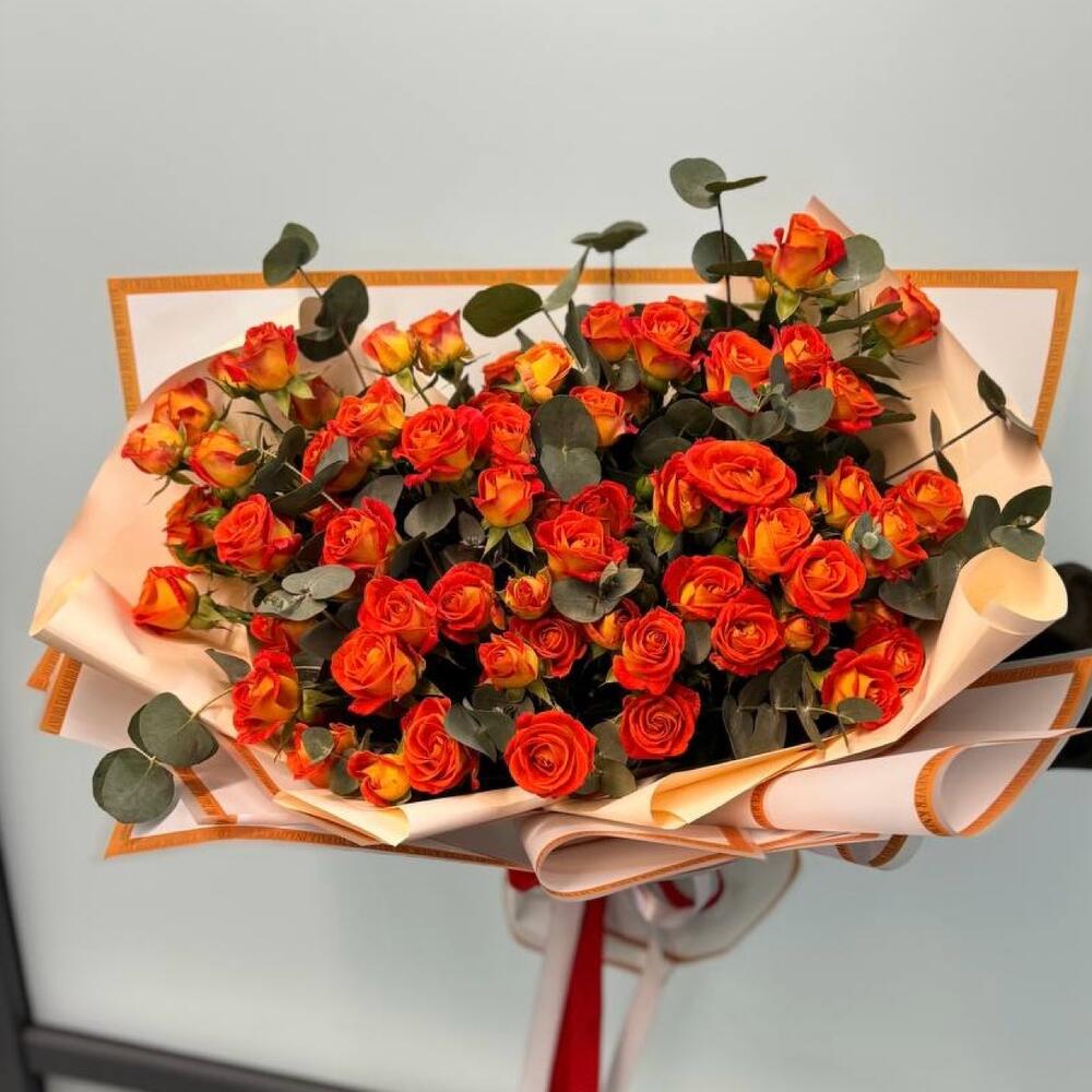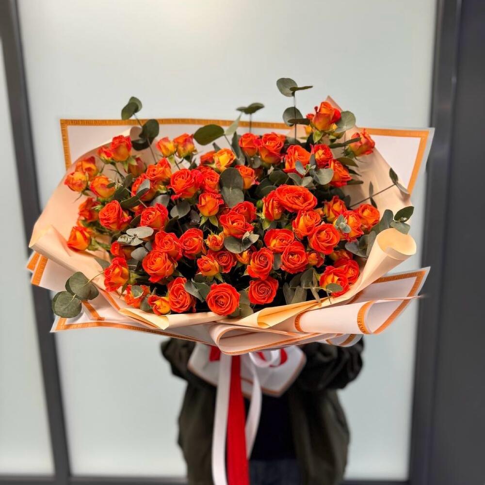 Эвкалипт - 4 шт. Кустовая роза - 15 шт. Упаковка - 1 шт. Атласная лента - 1 шт.