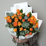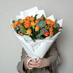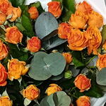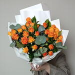 Лента атласная - 1 шт. Кризал (подкормка) - 1 шт. Тишью белое - 1 шт. Пленка дизайнерская - 5 шт. аквапак с водой - 1 шт. ветки эвкалипта - 4 шт. кустовая роза оранж баблс - 9 шт.
