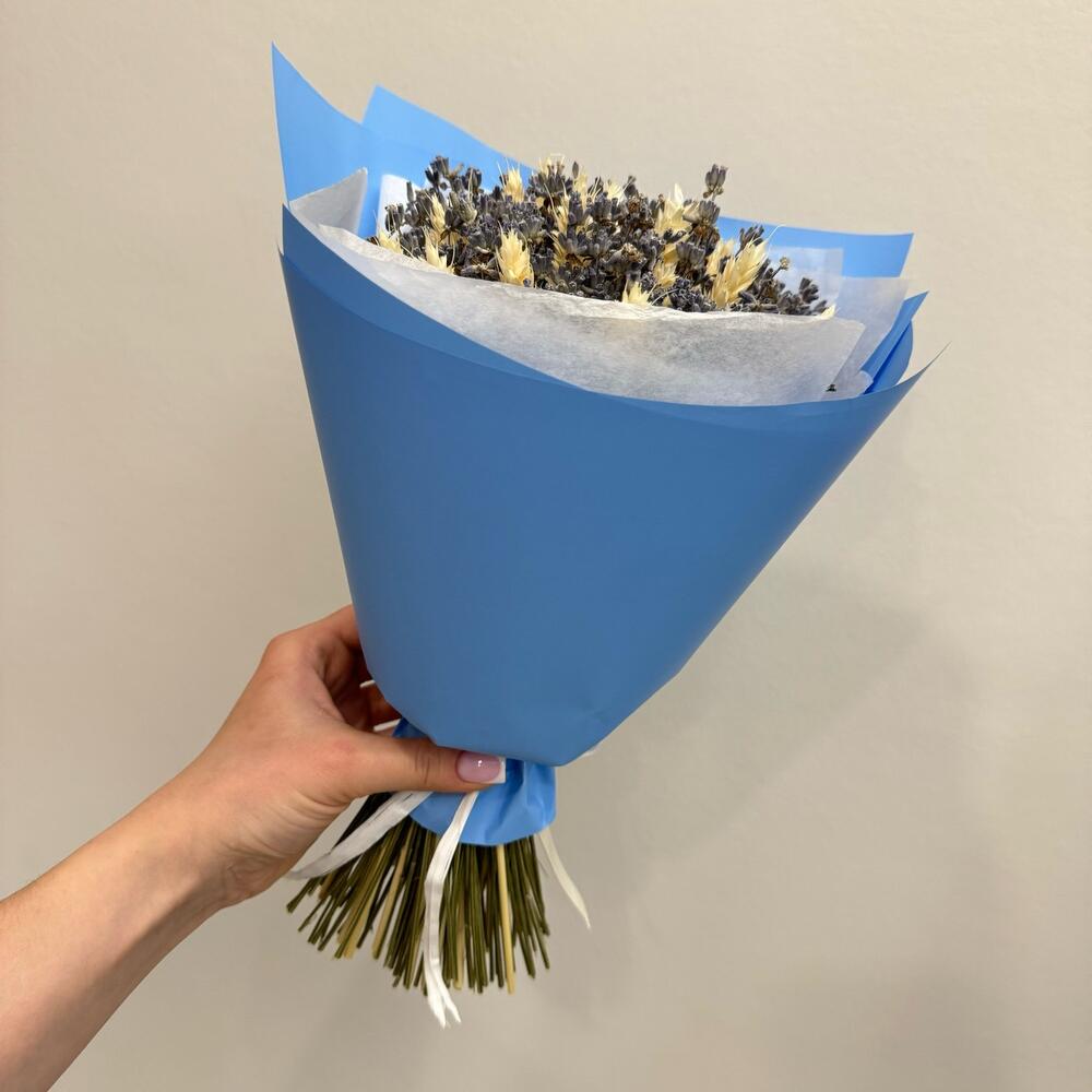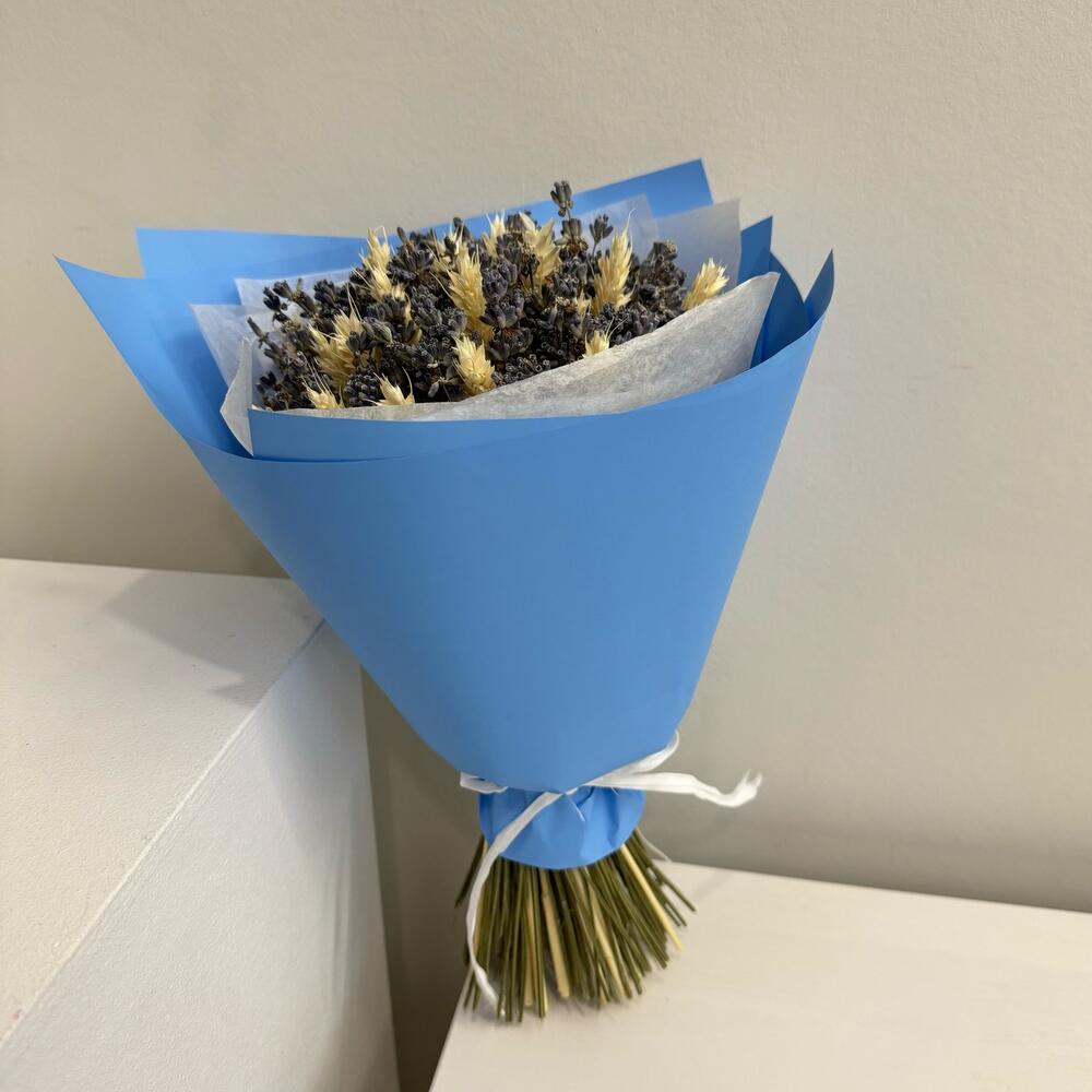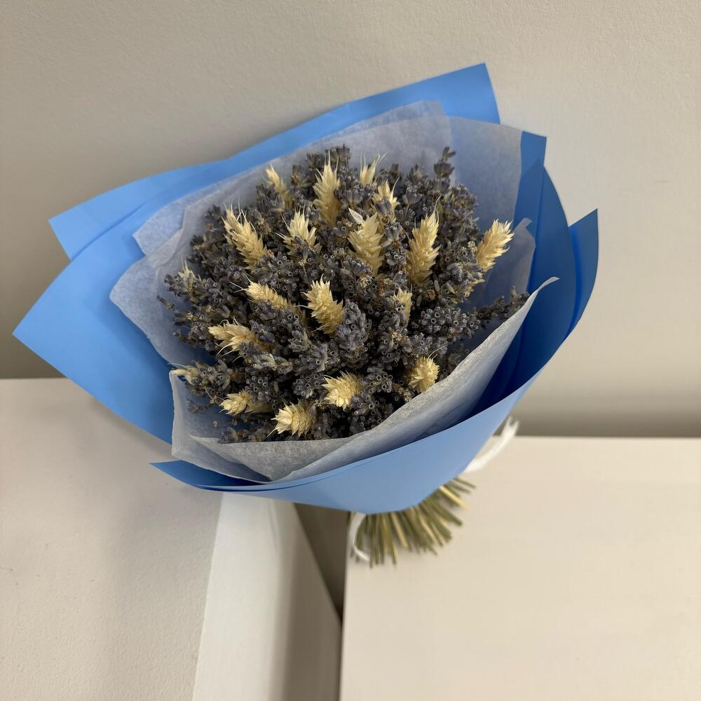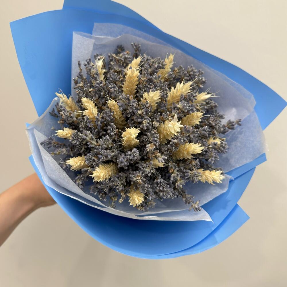 Букет собран из Крымского лавандина и отбеленной пшеницы. Лавандин очень похож на лаванду - он является результатом скрещивания широколистной и узколистной сортов лаванды и является ее межвидовым гибридом. В отличии от классическлй лаванды, лавандин превосходит свою родственницу по качественным характеристикам. Он более крупный и крепкий, с минимальным осыпанием бутонов, в нем содержится большее количество эфирного масла, а значит лавандин более ароматный. Лавандин: 1) Благоприятно воздействует на нервную систему и улучшает сон 2) не требует никакого ухода 3) безопасен для животных 4) не боится ни жары, ни мороза 5) радует глаз до 5 лет К букету в подарок добавляем приятную упаковку крафт-пакет и хрустящую бумагу тишью, а так же инструкцию по уходу и не большой вкусный презент.