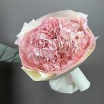 Букет из 3 крупных шапок гортензий розового цвета бережно упакован в матовую пленку и перевязан атласной лентой