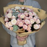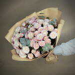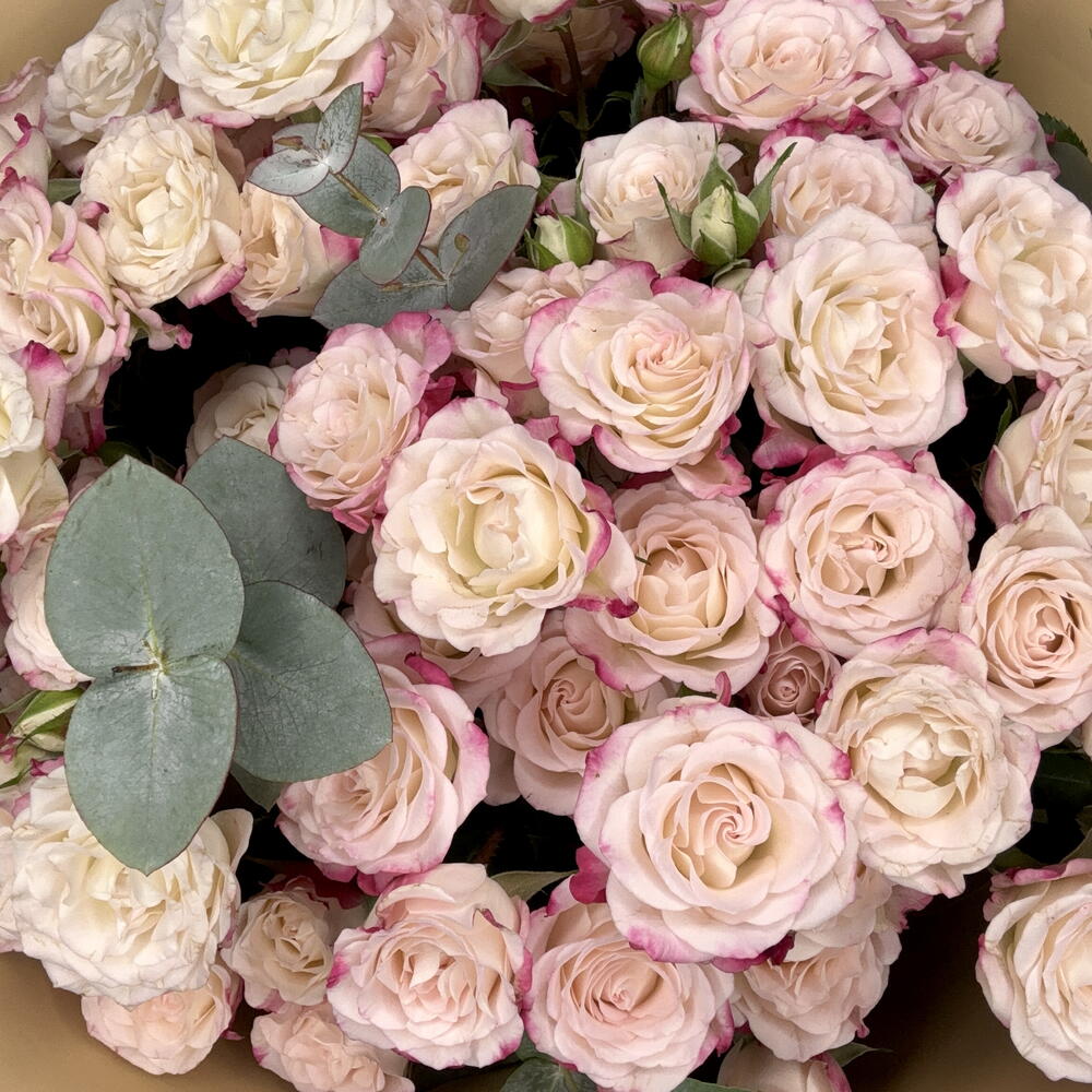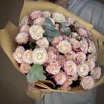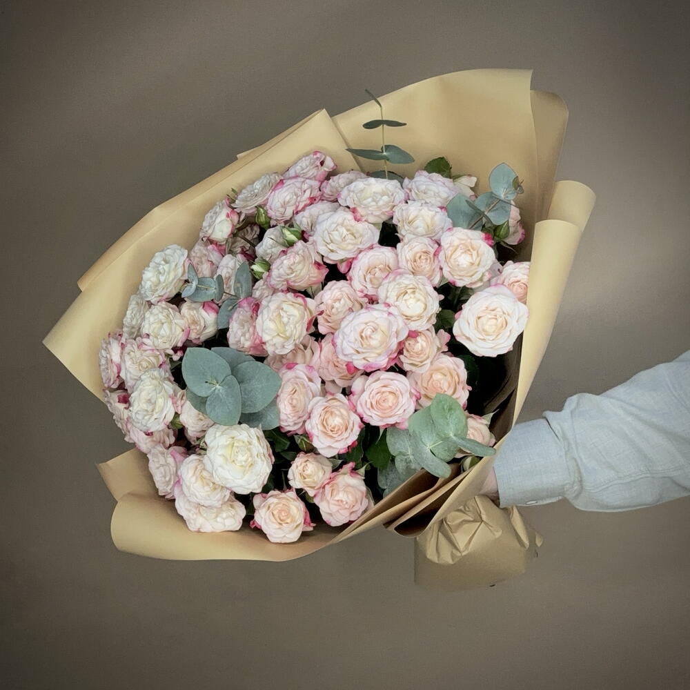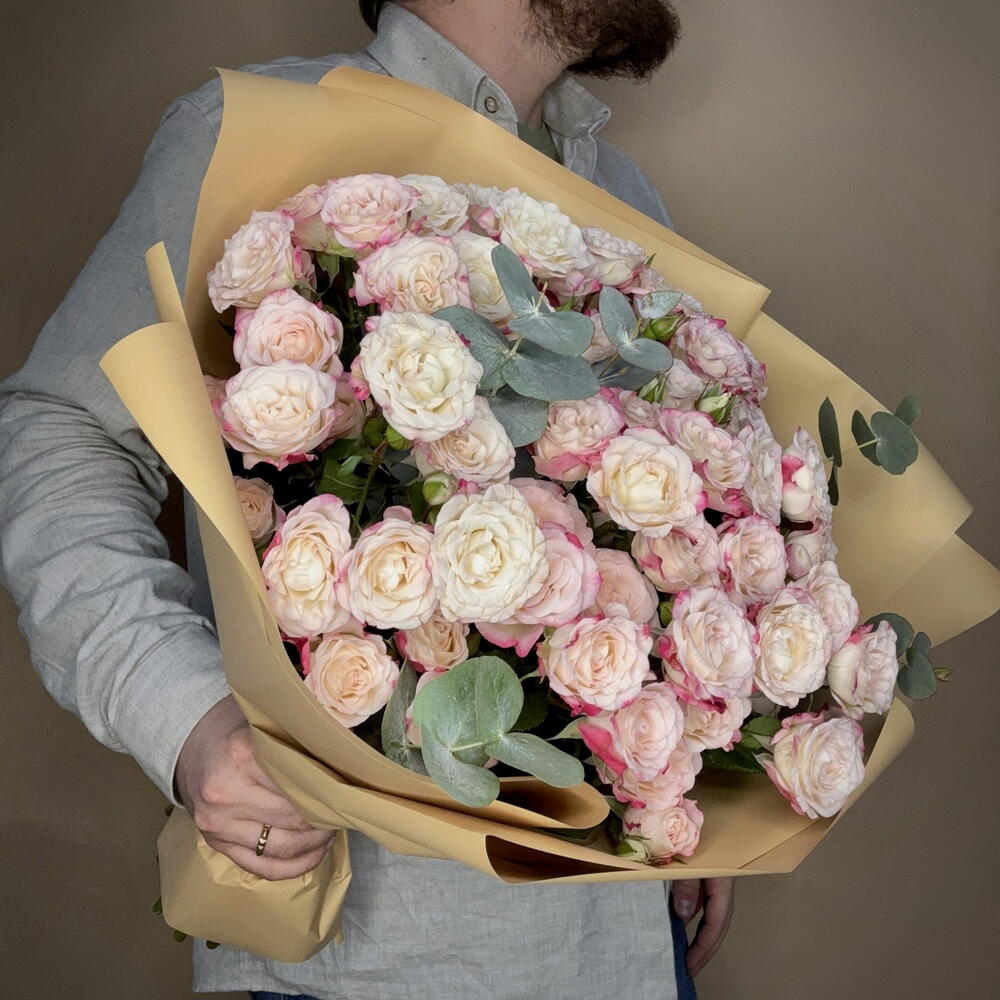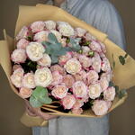 Букет из нежных кустовых роз с эвкалиптом Воздушный, трогательный, естественный — будто собран ранним утром в секретном саду. Множество бутонов кустовых роз рассыпаются нежным облаком, а благородный эвкалипт добавляет графичности и тонкого пряного аромата. Этот букет не выглядит пафосно — он выглядит искренне. Для кого: для романтичных натур, ценительниц уюта и природной красоты. Поводы: • 8 марта — весеннее настроение • 14 февраля — нежное признание • Свидание или встреча • День рождения подруги • Без повода — просто люблю Уход: 1. Подрежьте стебли под углом. 2. Удалите листву ниже уровня воды. 3. Чистая вода + подкормка (в комплекте). 4. Меняйте воду раз в 2 дня — эвкалипт сохранит свежесть и аромат до 3 недель. Ключевые слова: букет из кустовых роз, розы с эвкалиптом, нежные цветы, подарок на 8 марта, букет на 14 февраля, природная флористика, доставка цветов