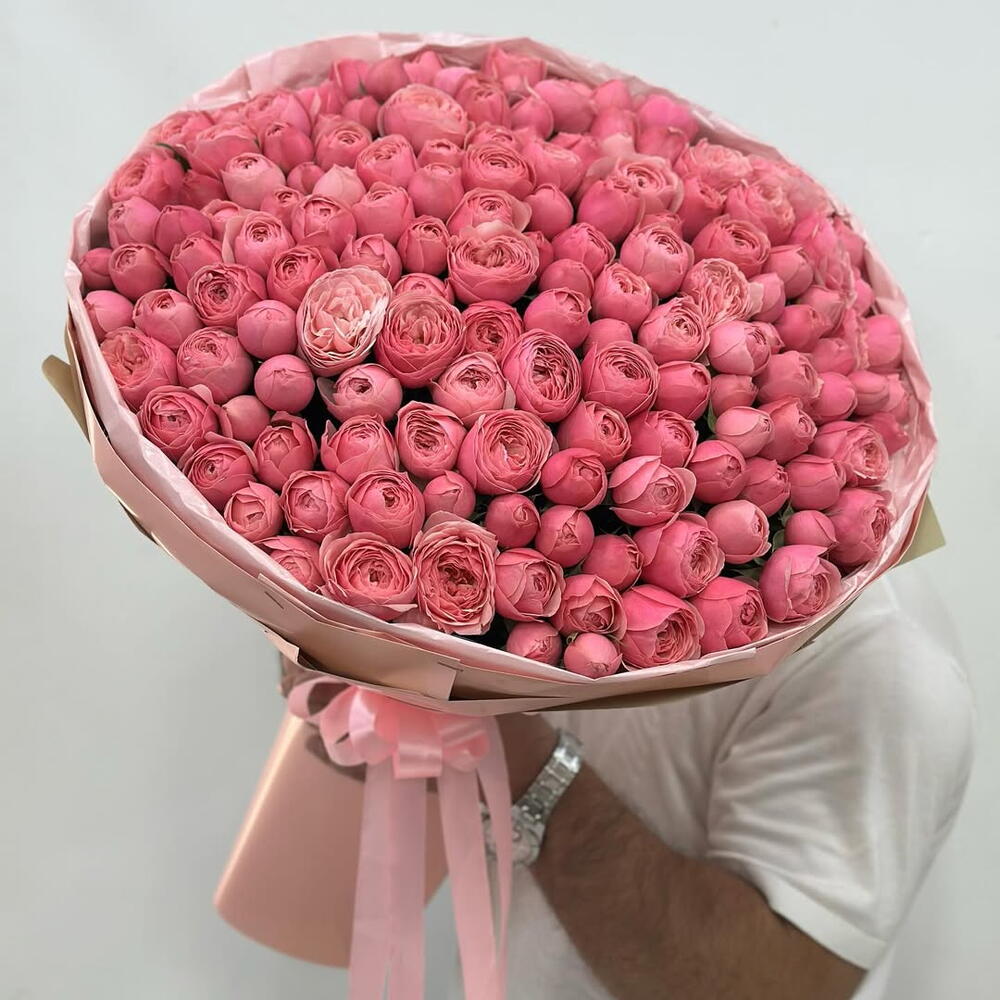 Наши преимущества * Личный менеджер, который курирует заказ от начала до вручения * Согласование фото букета перед отправкой и возможность внести изменения по вашему желанию * Дополнительные подарки — сладости, шары, помощь в организации сюрпризов * Красивая упаковка, аквабокс и поздравительная открытка — бесплатно Прекрасный свежий букет из розовых пионовидных роз в красивой упаковке с быстрой доставкой по городу в течение часа — отличный способ порадовать близкого человека, устроив сюрприз. Такой букет подойдёт * на выписку в роддом ✓ Для любимой девушки или супруги ✓ Для мамы или родных ✓ Для подруги или коллеги ✓ Для свадебных торжеств и юбилеев