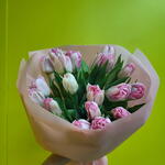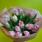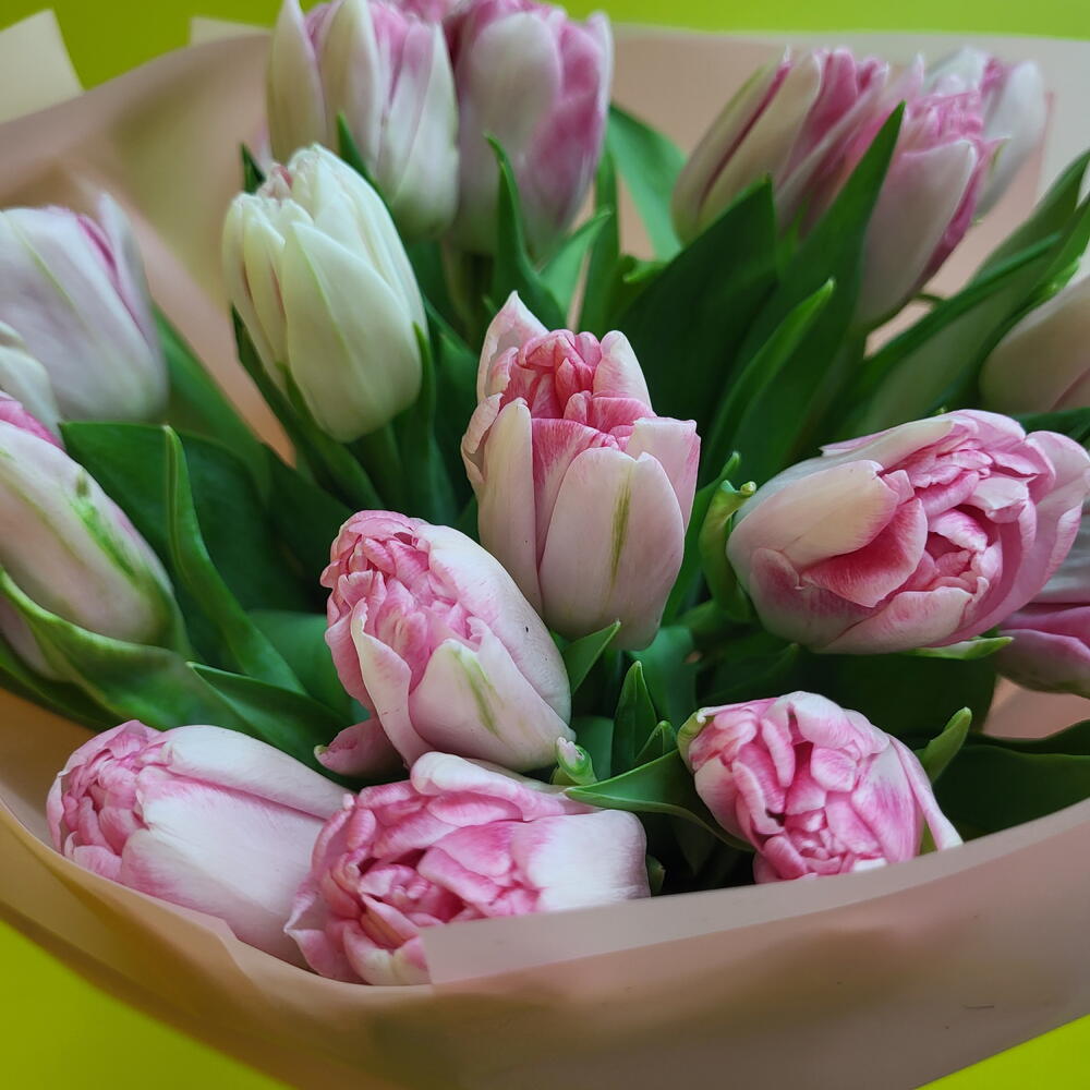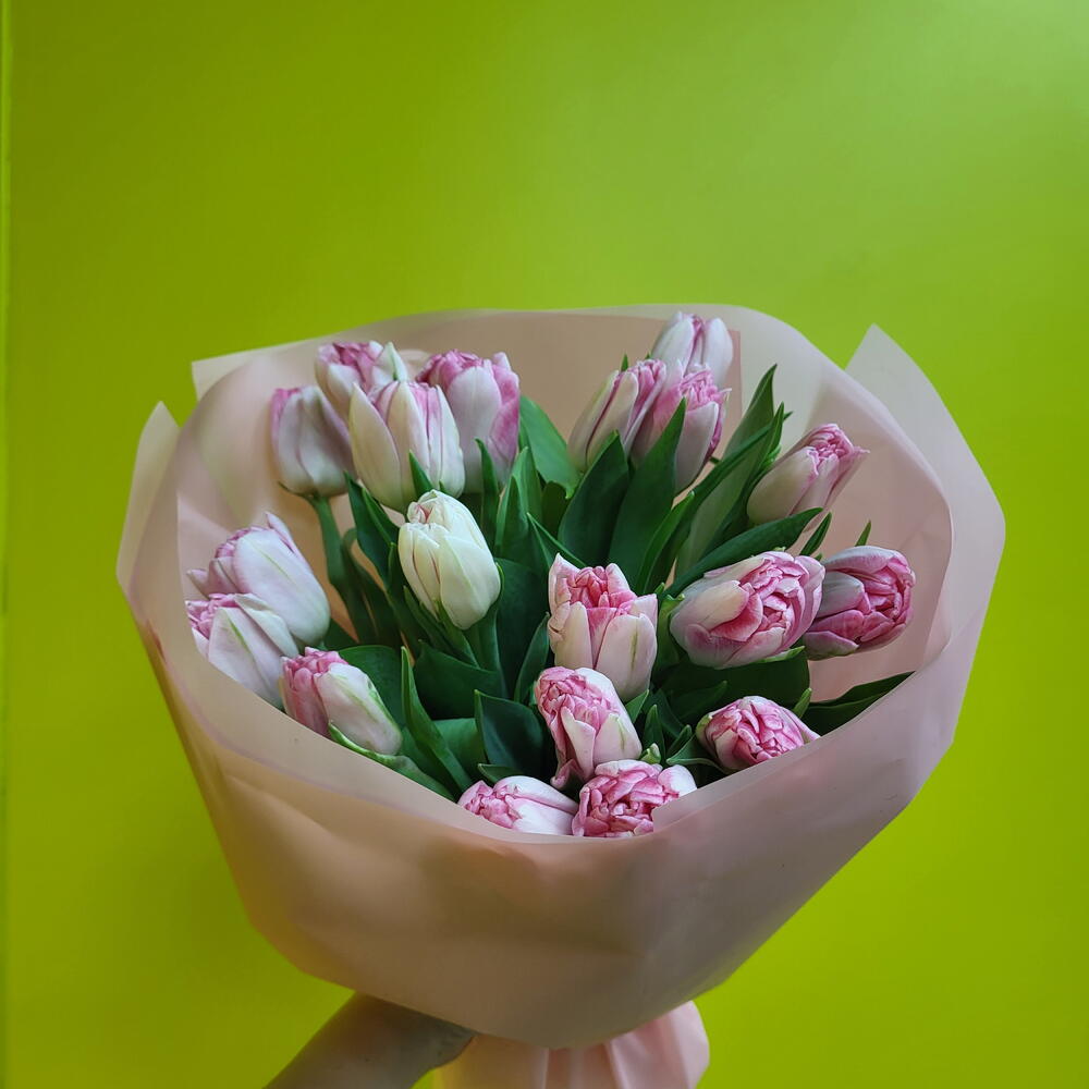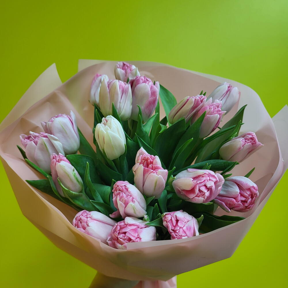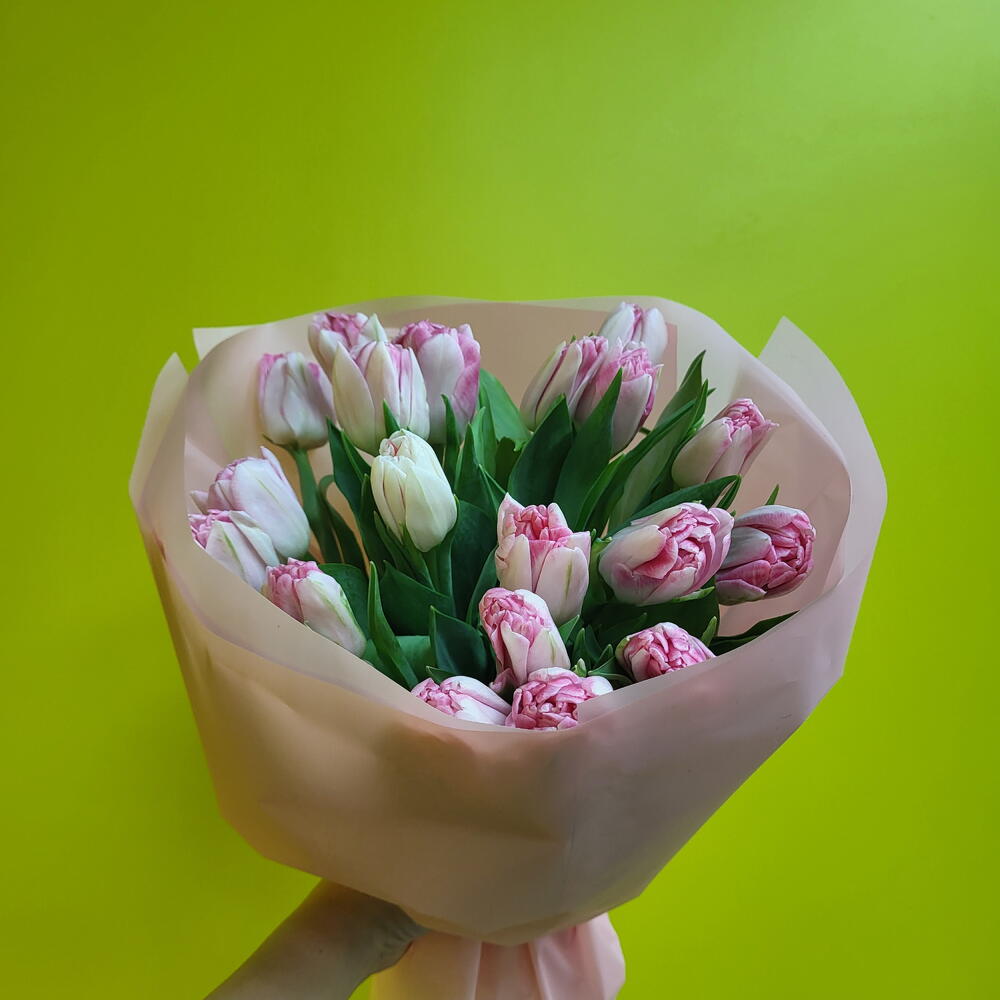Лента атласная - 1 шт. Пионовидный тюльпан - 19 шт. Пленка матовая - 1 шт.