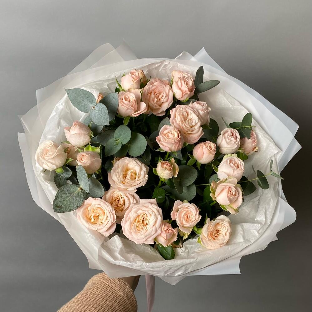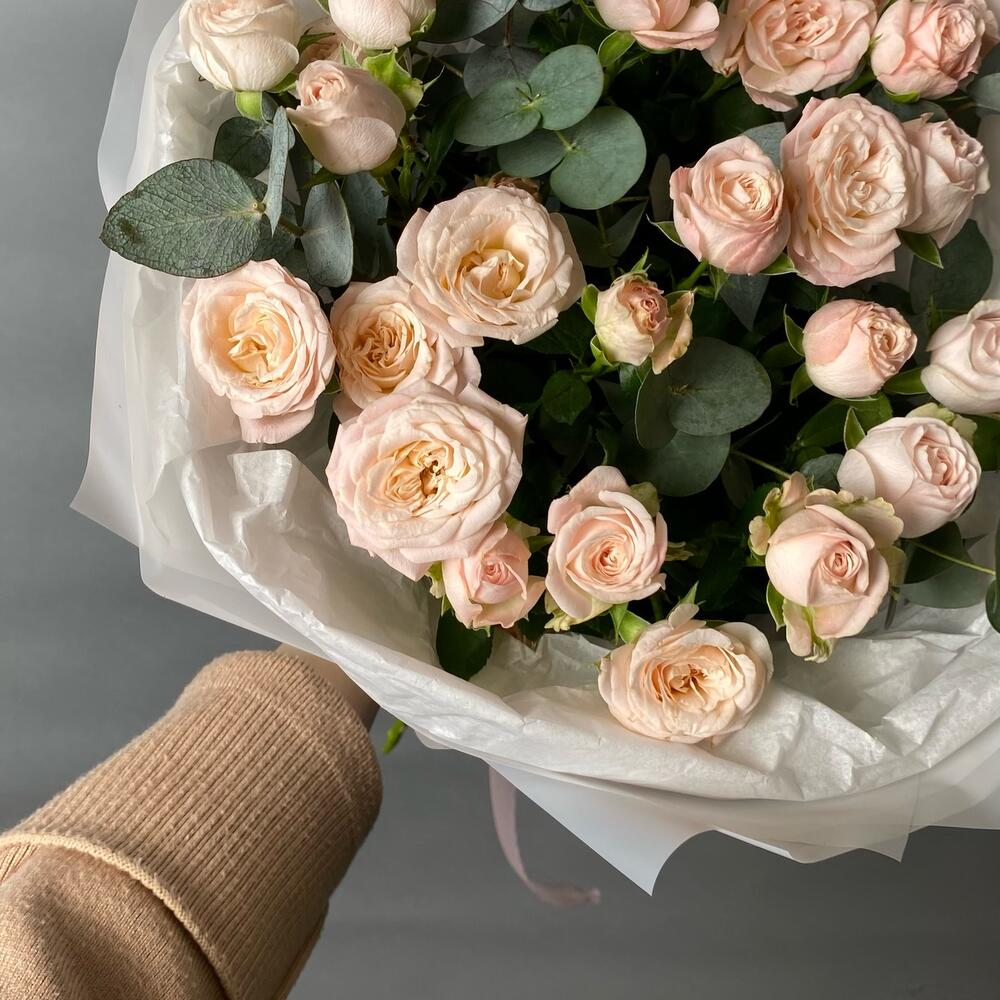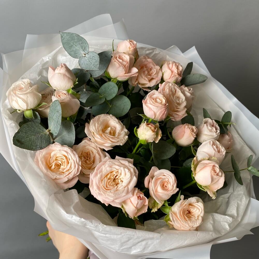 Букет из пышной кустовой розочки и эвкалипта