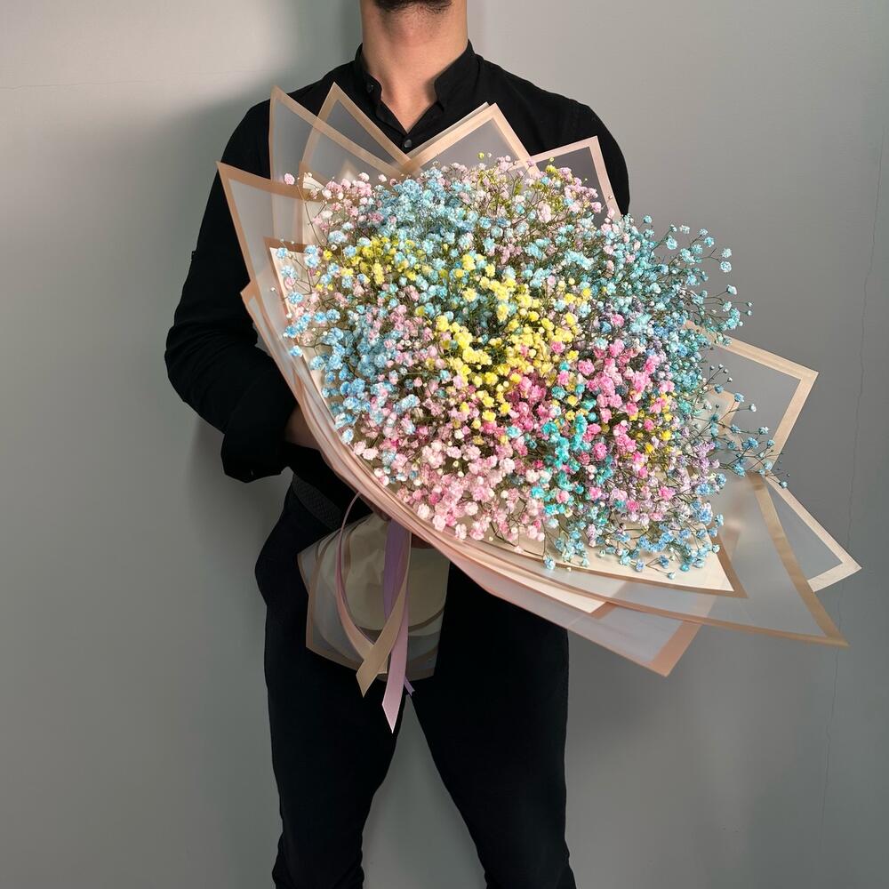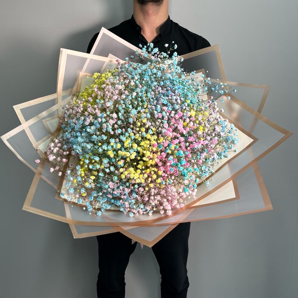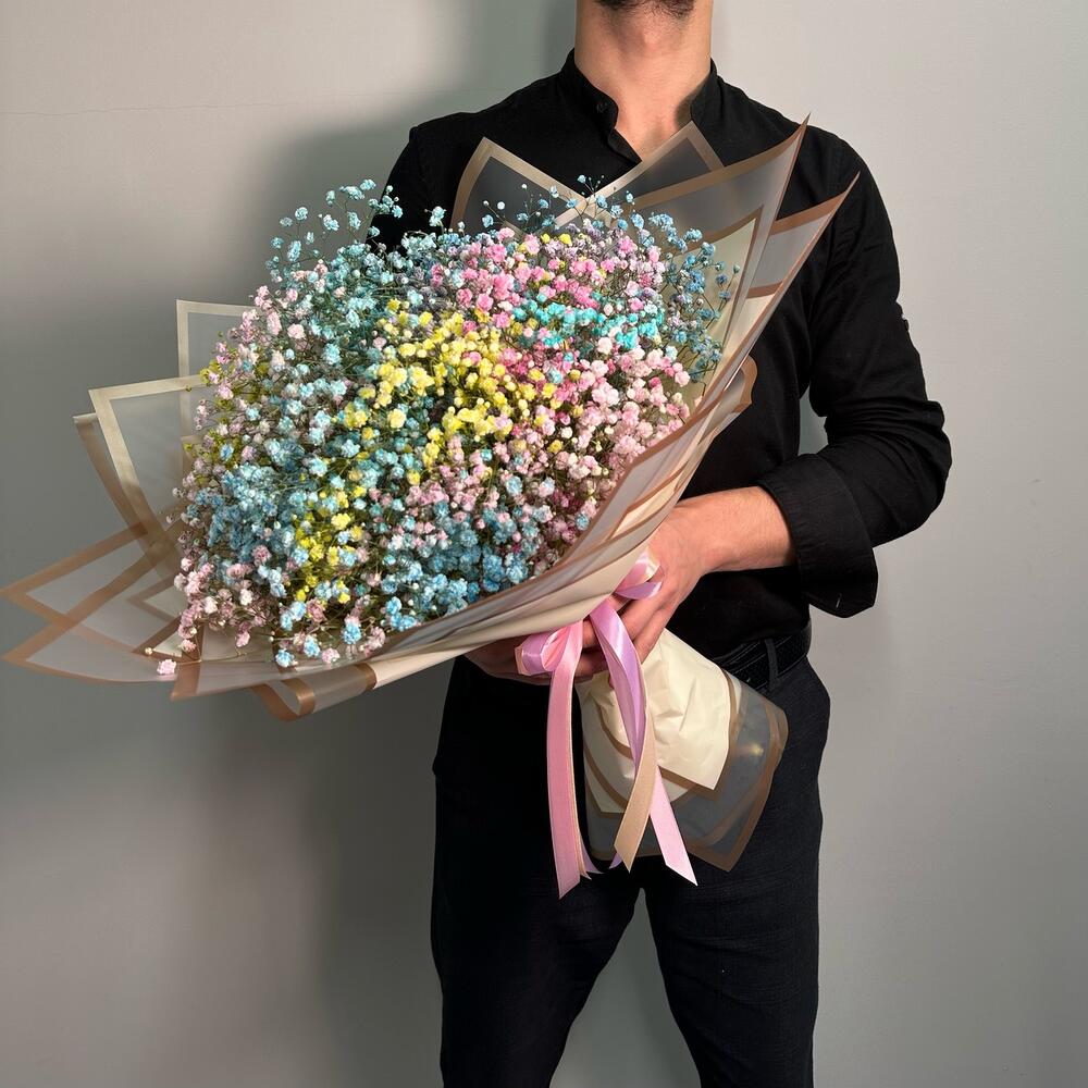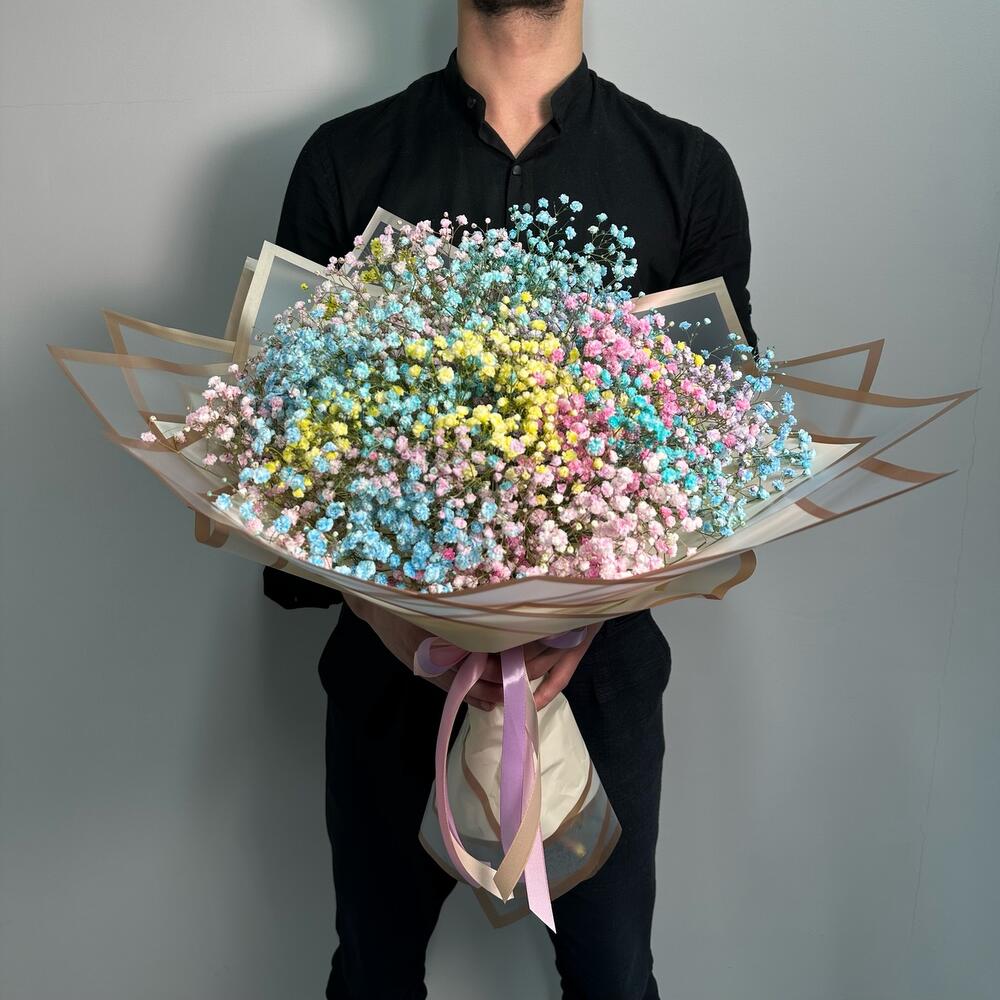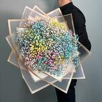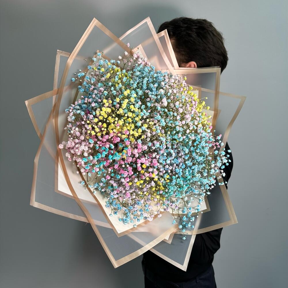 Авторский букет из радужной гипсофилы от “FMART x Vertikal”. В его составе радужная гипсофила. Букет собран в дизайнерскую упаковку от наших флористов. Как ухаживать за цветами: 1. Подрежьте каждый стебель букета секатором или ножом на 1 см под углом 45 градусов. 2. Поставьте букет в вазу с холодной водой. 3. Воду необходимо менять каждый день, а подрезать каждые 1-2 дня. К букету прилагается памятка по уходу за цветами и подкормка для продления их жизни. ✅ Добавляйте товар и наш магазин в избранное, чтобы было легче нас найти!