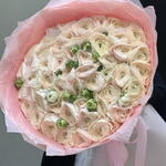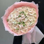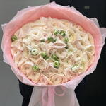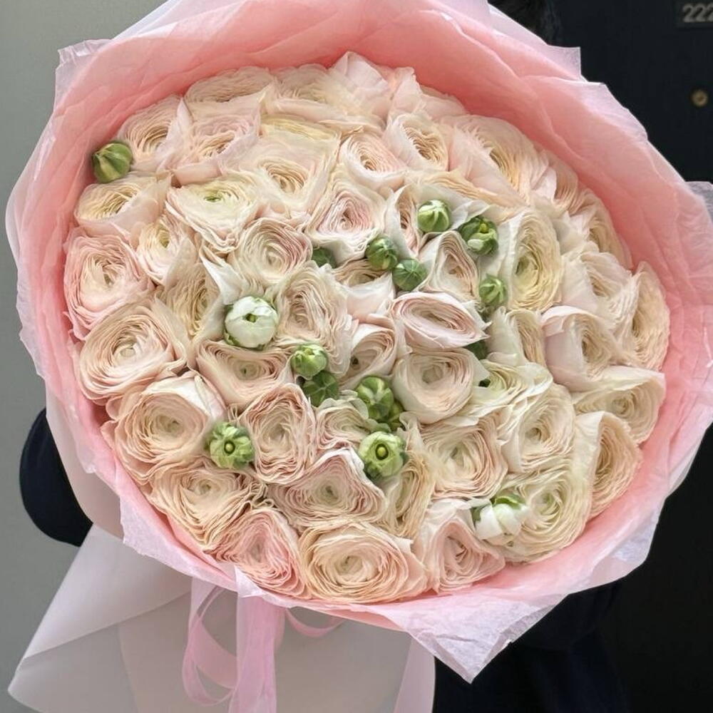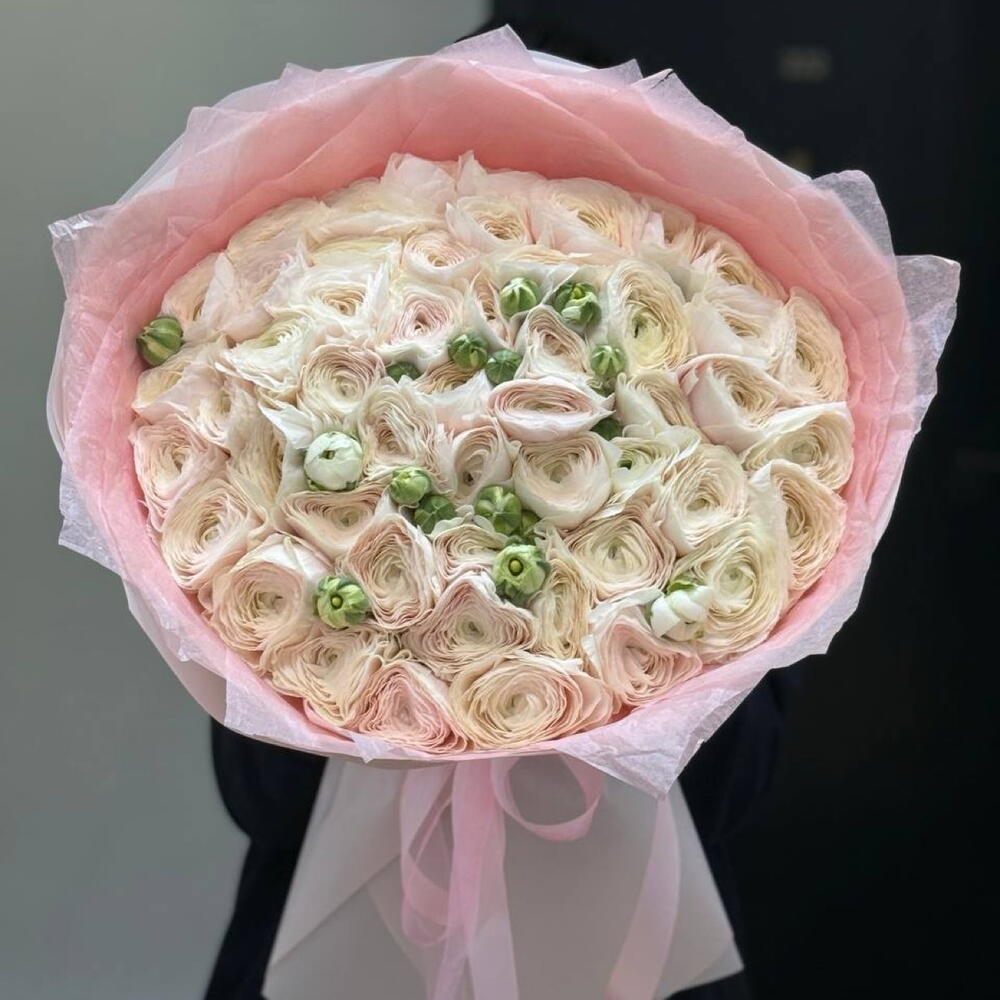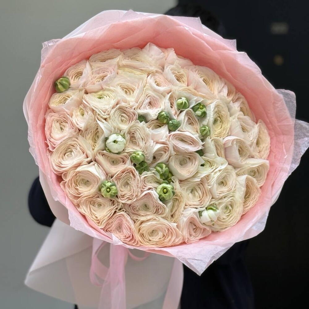 Лента атласная - 1 шт. Дизайнерское оформление - 1 шт. ранункулюсы - 51 шт. букетная записка - 1 шт.