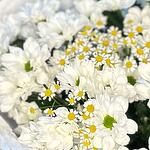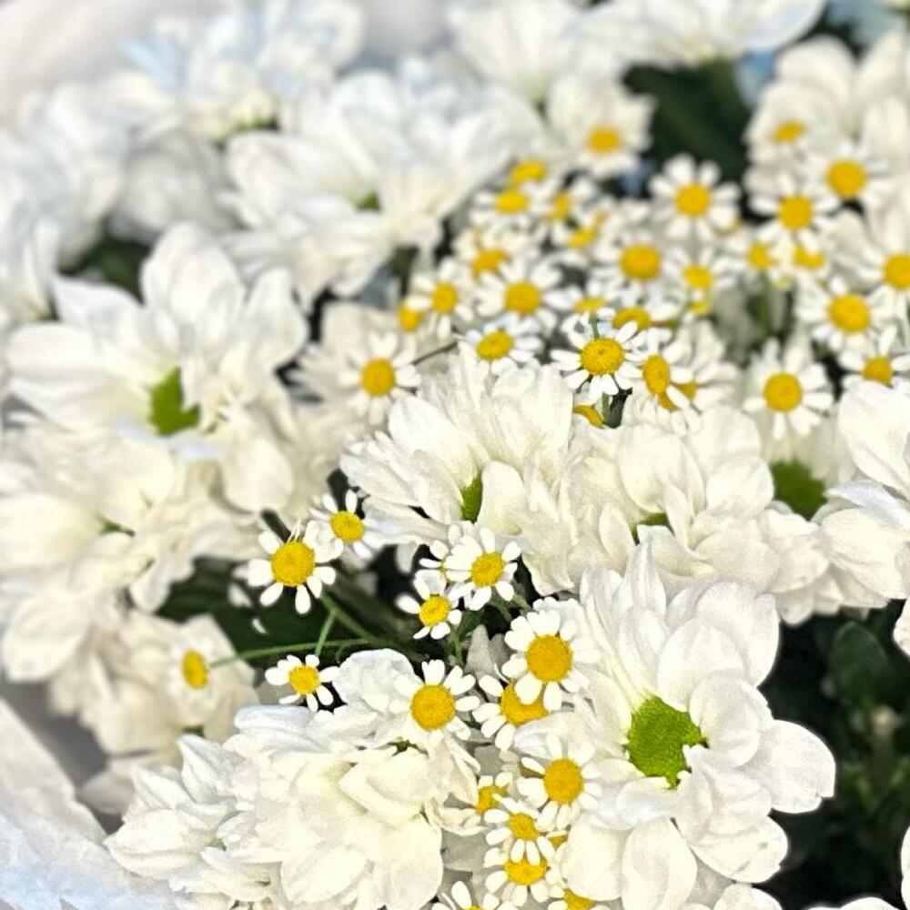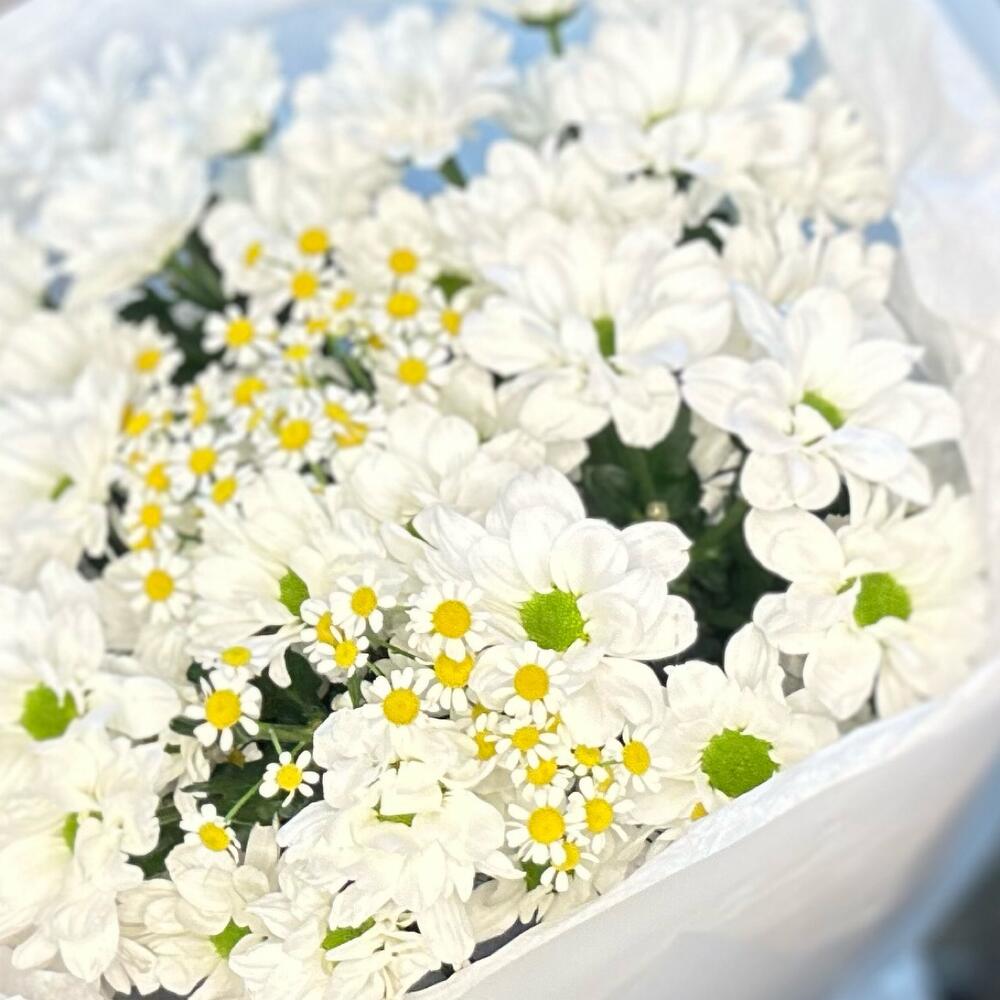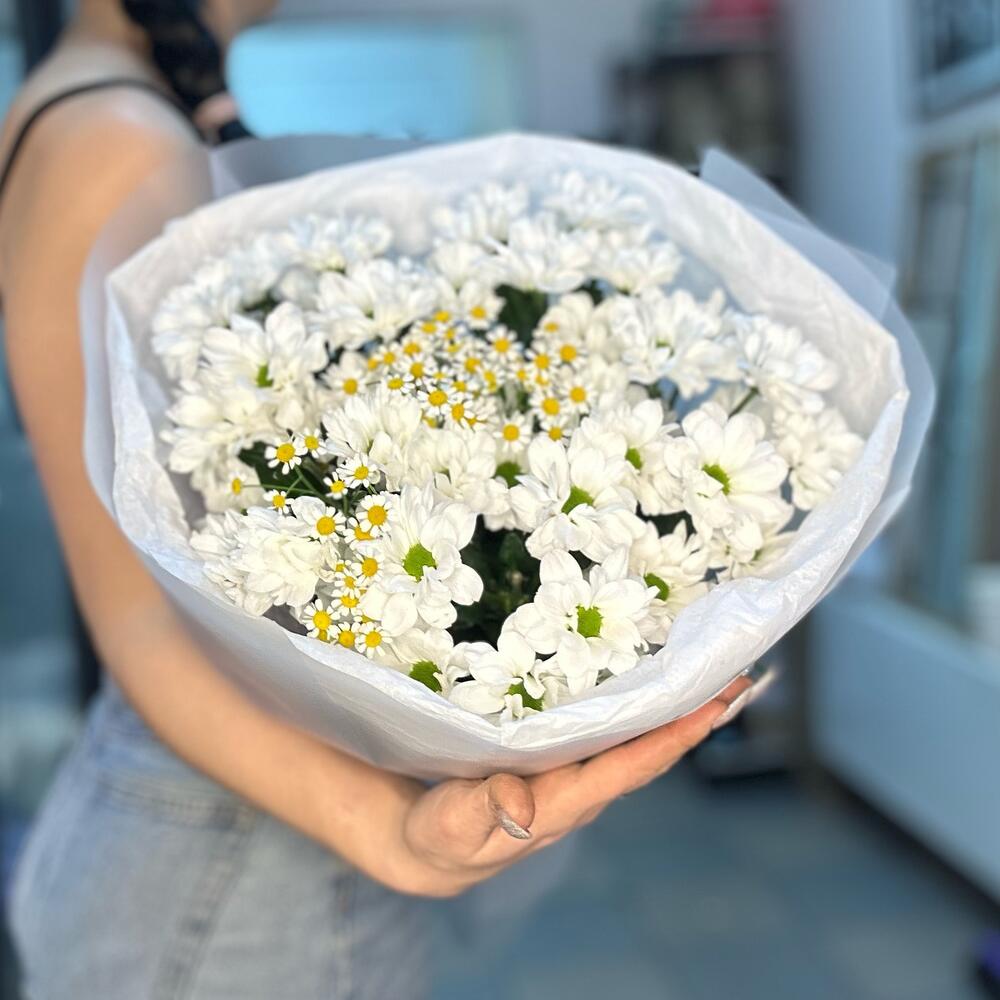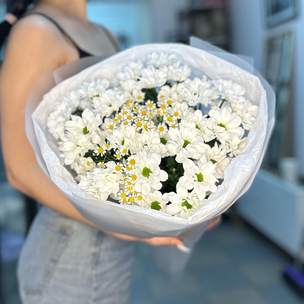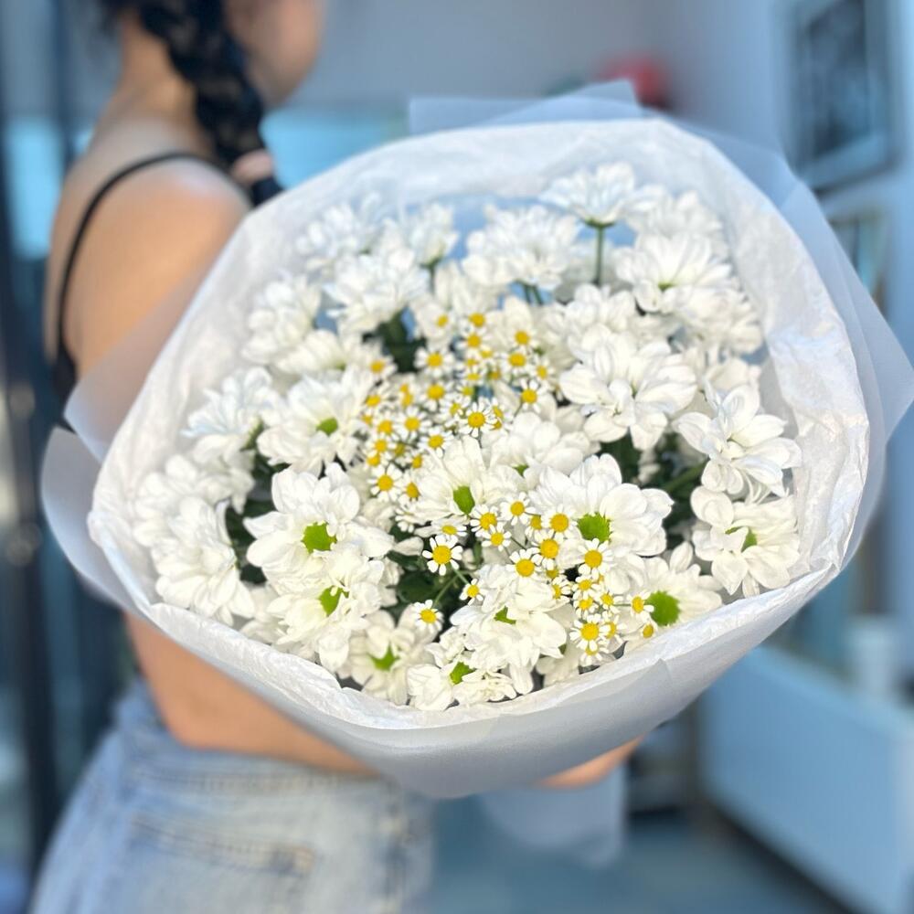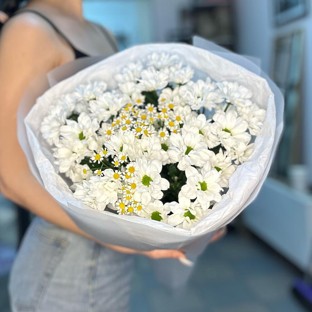 Монобукет «Поле ромашек» из ромашковидных хризантем и ромашки танацетум