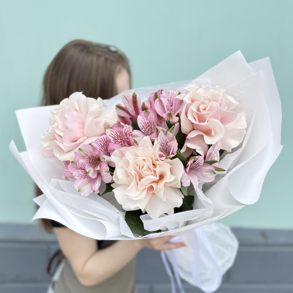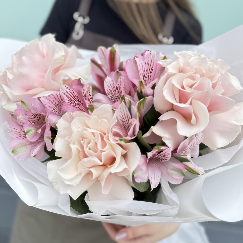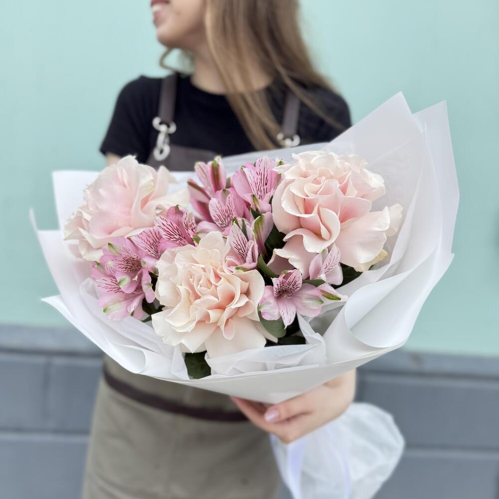 Букет из розовых, французских роз и кустовой альстромерии