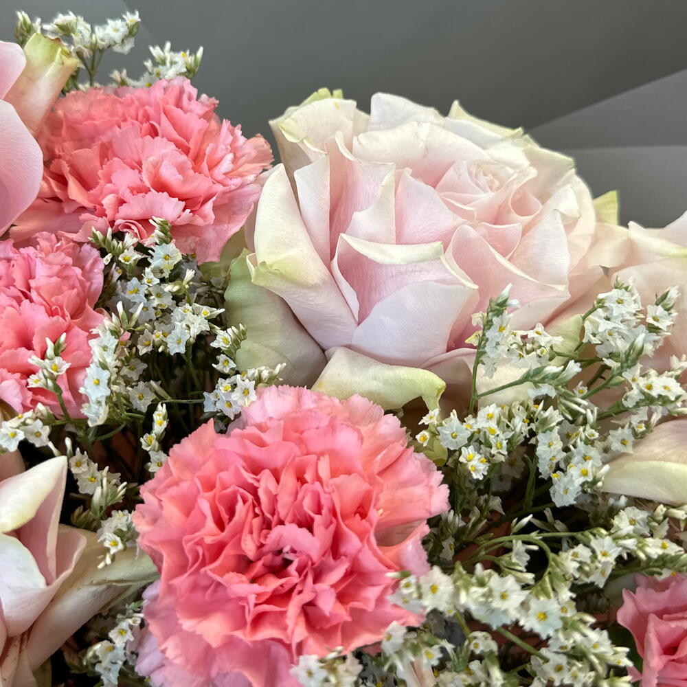 Лимониум - 4 шт. Диантус - 5 шт. Упаковка дизайнерская - 1 шт. Эквадор роза - 5 шт.