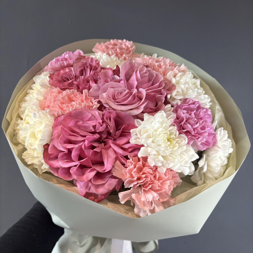 Нежный, пышный букет из пионовидной розы кантри блю, кустовой хризантемы и гвоздик.