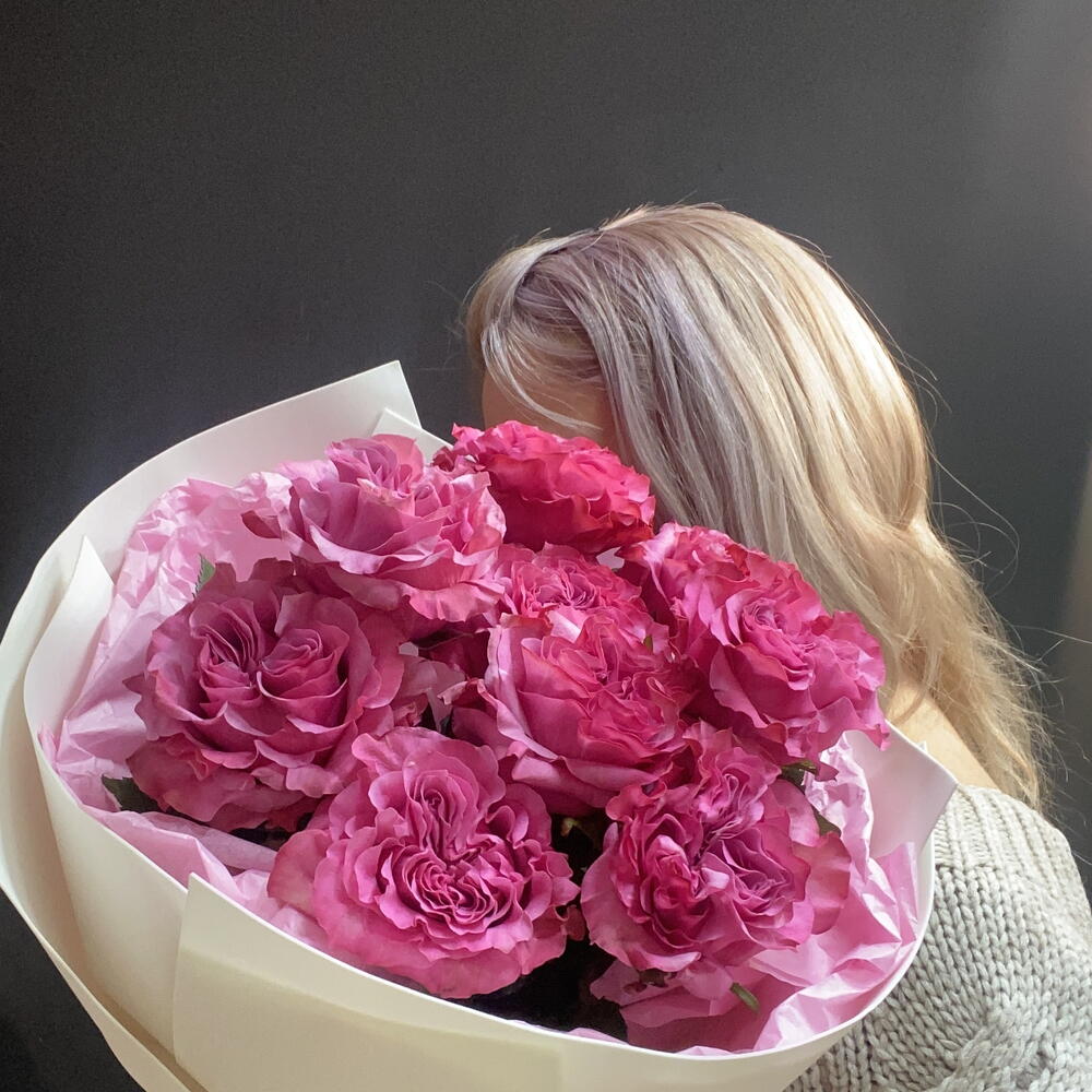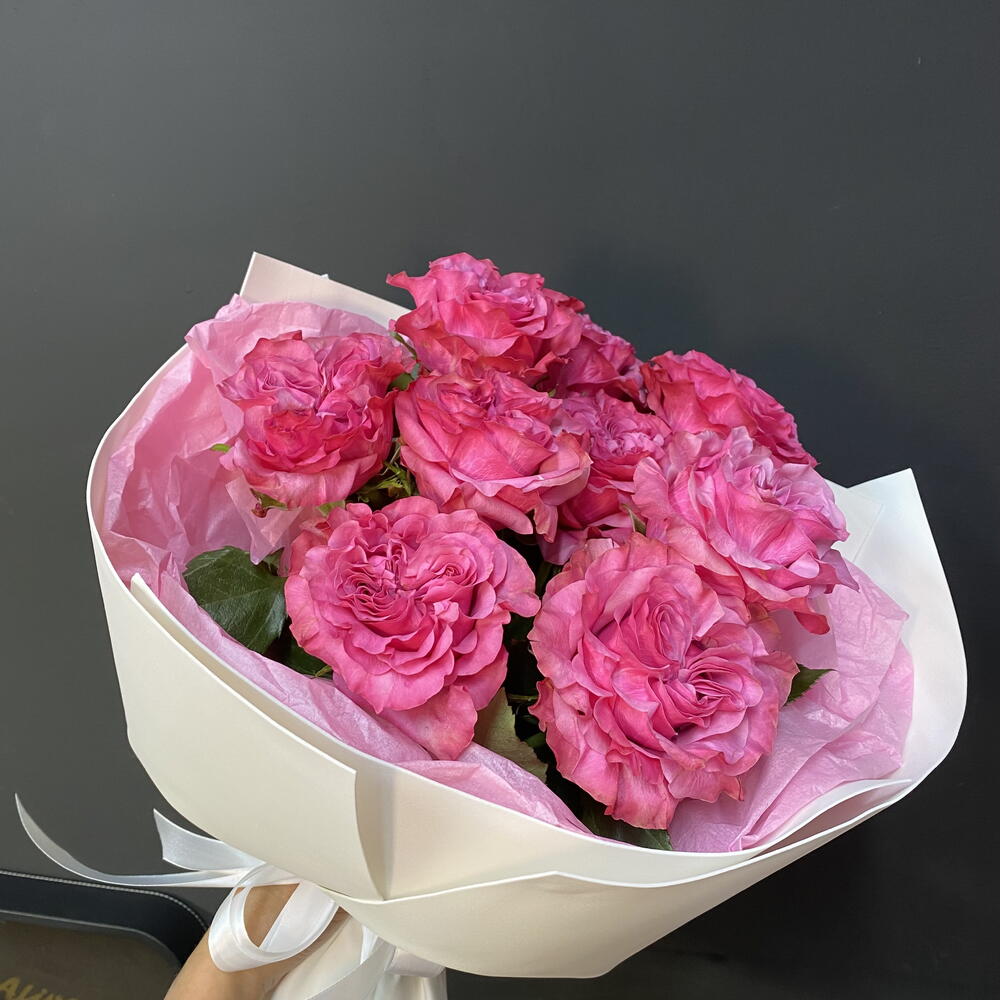 Лента атласная - 2 шт. Открытка - 1 шт. Упаковка дизайнерская - 3 шт. Средство для продления жизни цветов - 1 шт. Упаковка транспортировочная пленка - 1 шт. Тишью белое - 2 шт. роза «кантри блю» - 9 шт.
