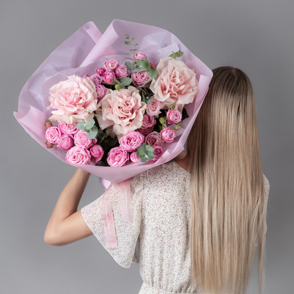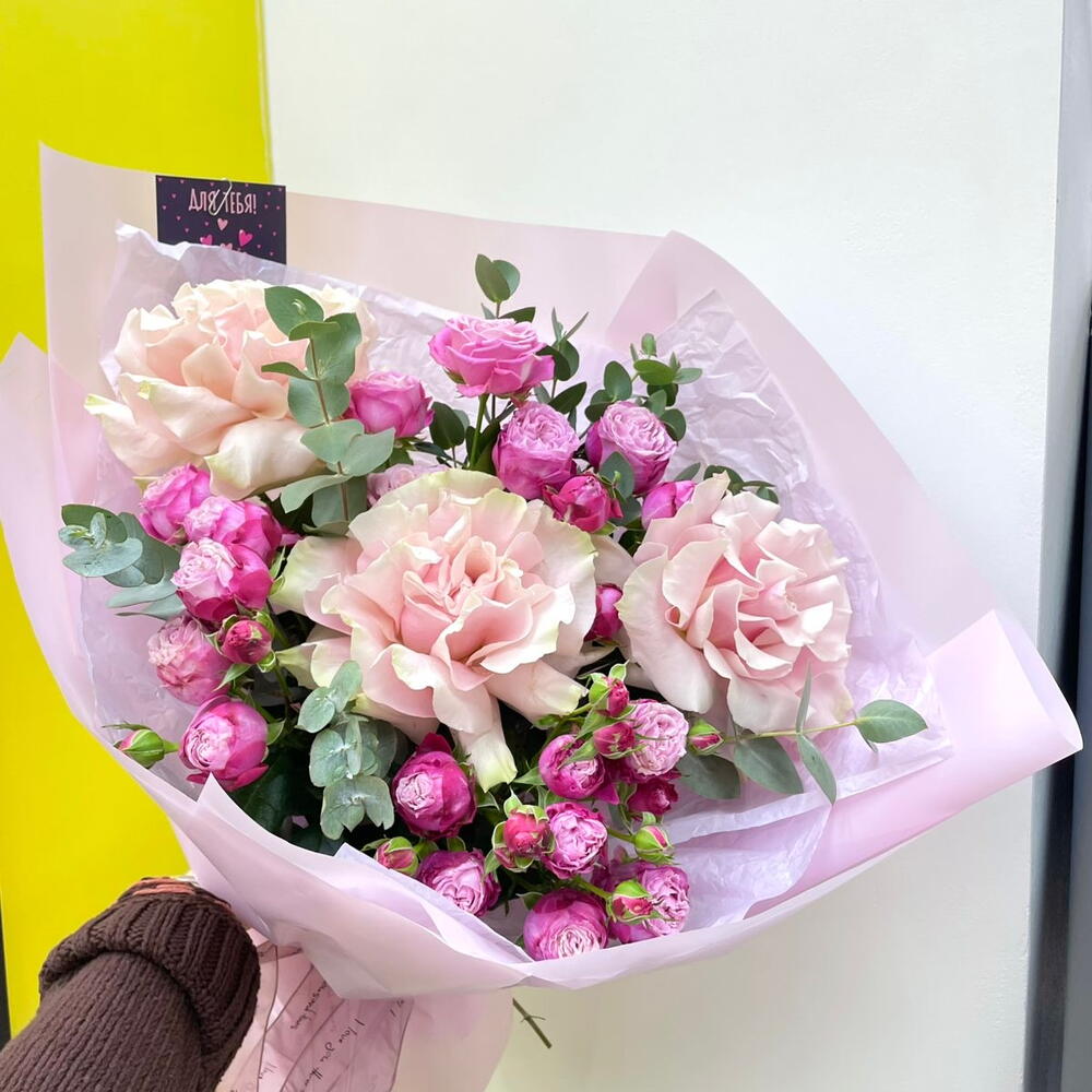 Букет из розовых французских роз, пионовидной и кустовой розы с эвкалиптом — элегантная композиция, сочетающая нежность роз и свежесть зелени. Этот букет — не просто собрание прекрасных цветов, а настоящий гимн красоте и любви, способный передать то, что порой трудно выразить словами. маме, мамы, мам, mother, mom, mum, mamá, madre, мамочке, мамуле, матери