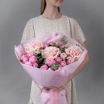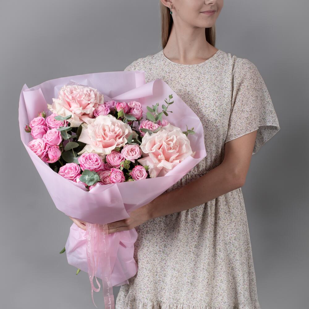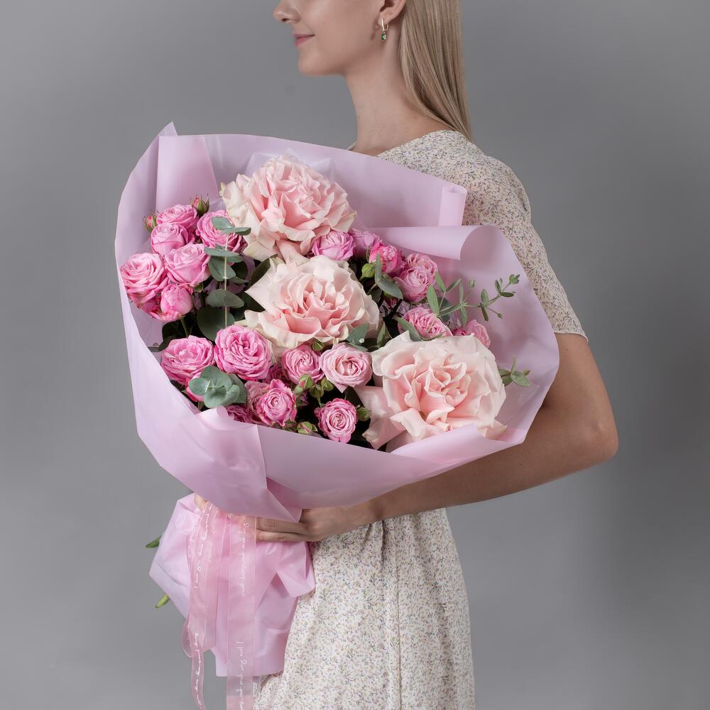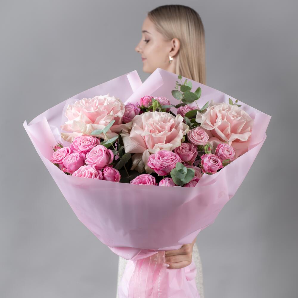 Букет из розовых французских роз и пионовидной, кустовой розы с эвкалиптом