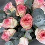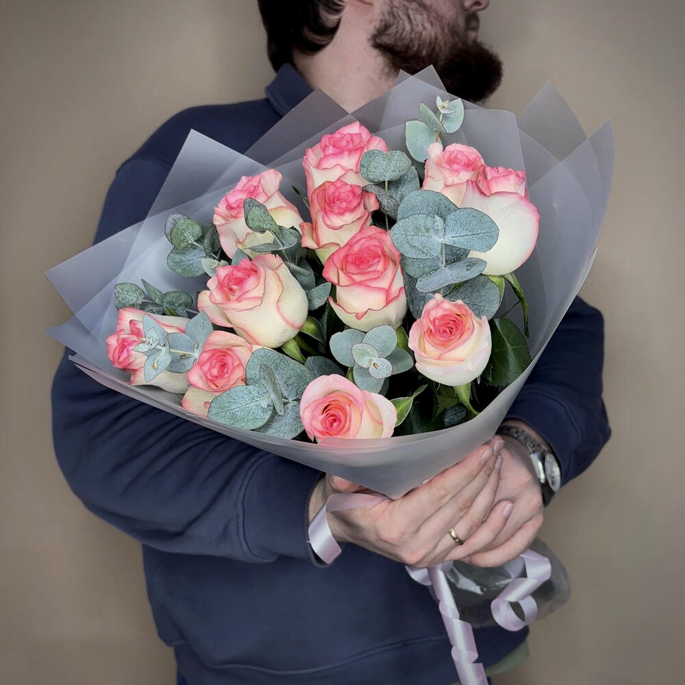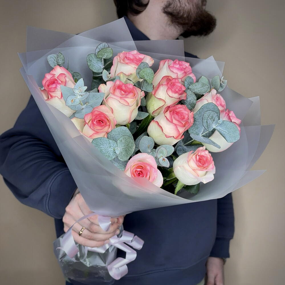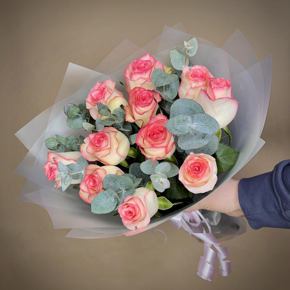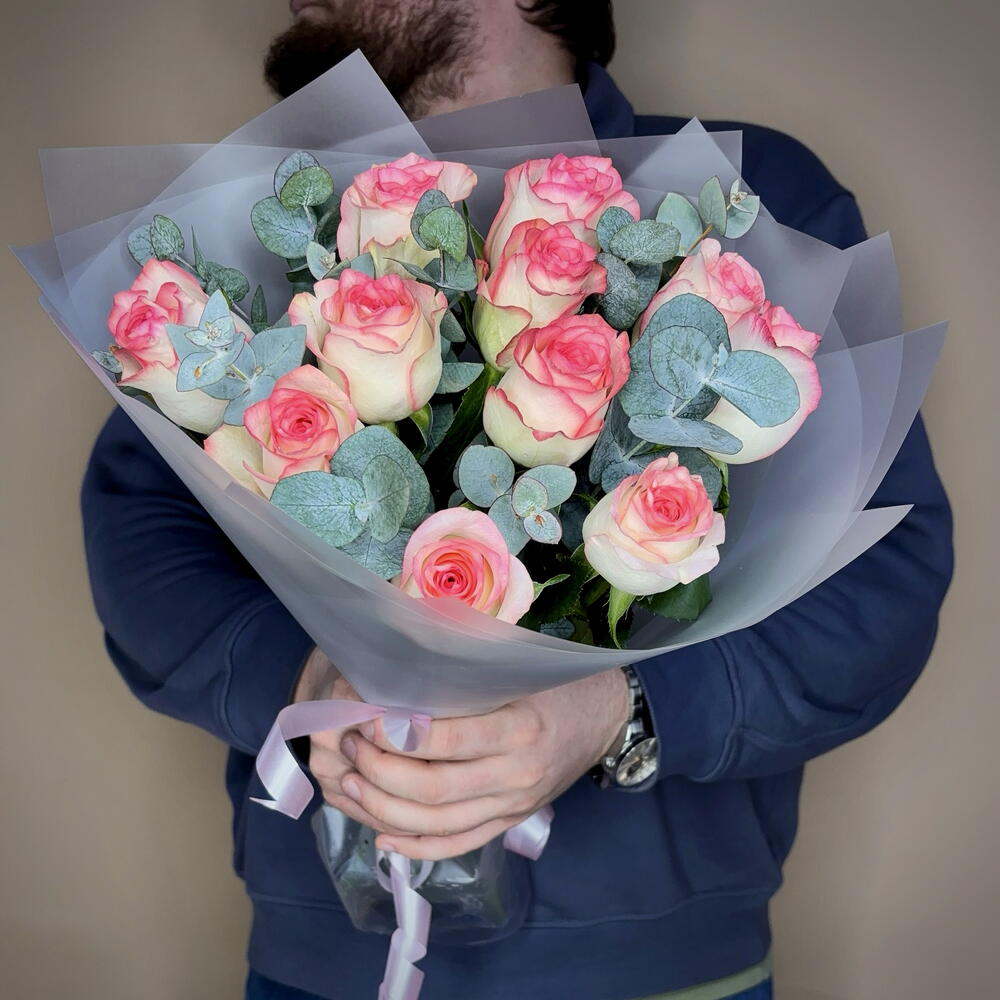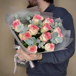 Подарите незабываемые эмоции! Букет из розовых роз в обрамлении ароматного эвкалипта — это классика, которая говорит сама за себя. Идеальный способ признаться в любви, выразить глубокую симпатию или поздравить с самым важным событием. Свежие цветы от проверенных поставщиков и бережная доставка гарантированы. Кому подарить?: · Возлюбленной на день рождения, годовщину, 14 февраля или без повода. · Жене в знак благодарности и любви. · Маме или коллеге на 8 Марта. · Подруге или сестре на свадьбу, юбилей. · Любимому человеку в день знакомства или первое свидание. Инструкция по уходу: Чтобы ваш букет радовал как можно дольше: 1. Освободите цветы от упаковки. 2. Подрежьте стебли наискосок под струей воды. 3. Наполните вазу чистой прохладной водой и добавьте подкормку из пакетика (прилагается). 4. Удалите листья, которые могут оказаться в воде. 5. Поставьте букет в прохладное место, вдали от прямых солнечных лучей, сквозняков и фруктов. 6. Меняйте воду и подрезайте стебли каждые 1-2 дня. Розовые розы, букет розовых роз, купить букет роз, цветы с доставкой, букет для женщины, подарок на 8 марта, подарок на день рождения, свежие цветы, эвкалипт, роза и эвкалипт, букет невесты, свадебный букет, композиция из роз.