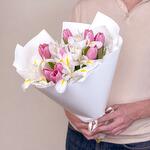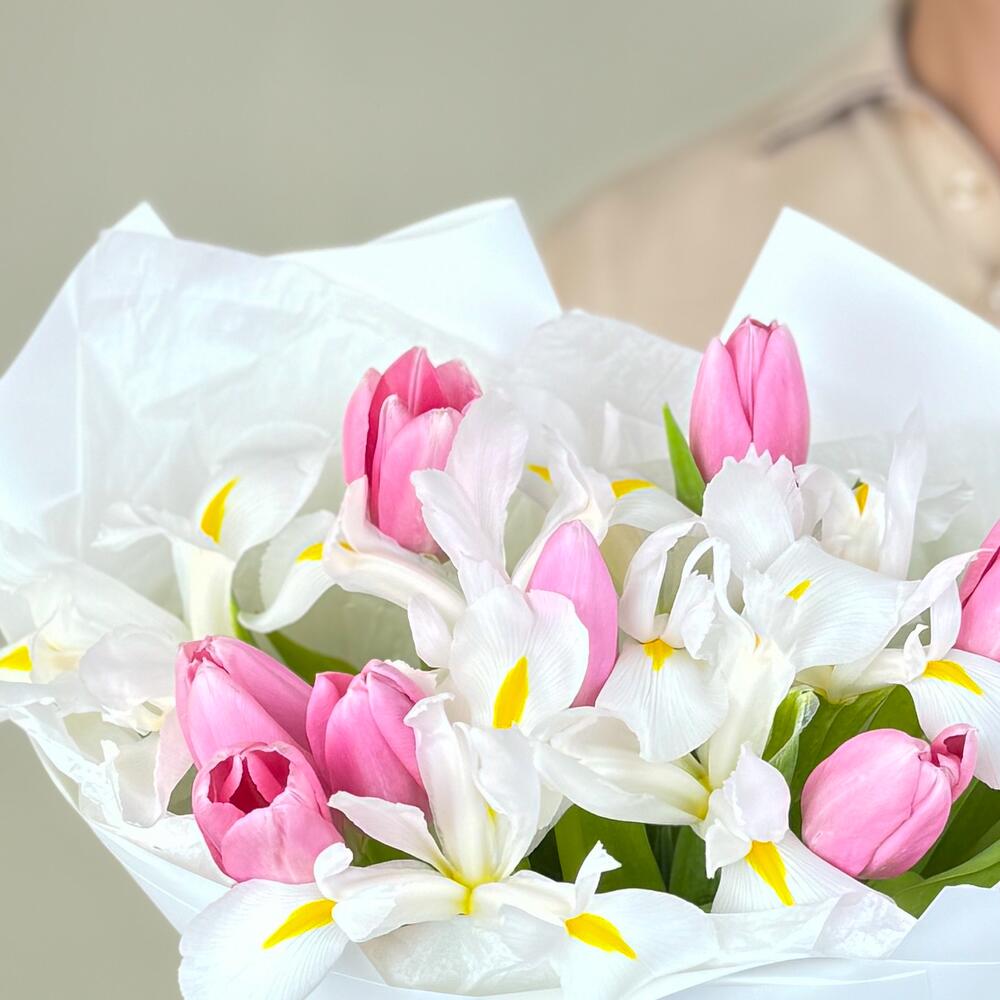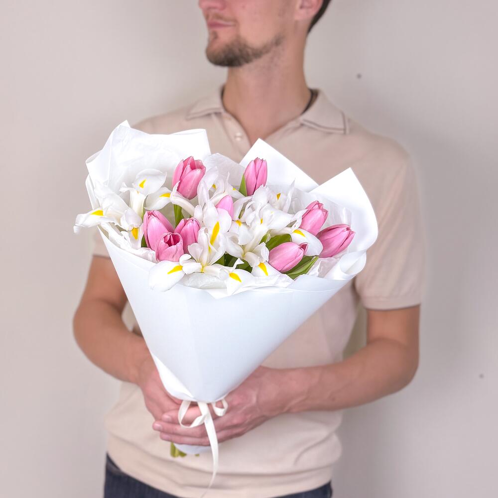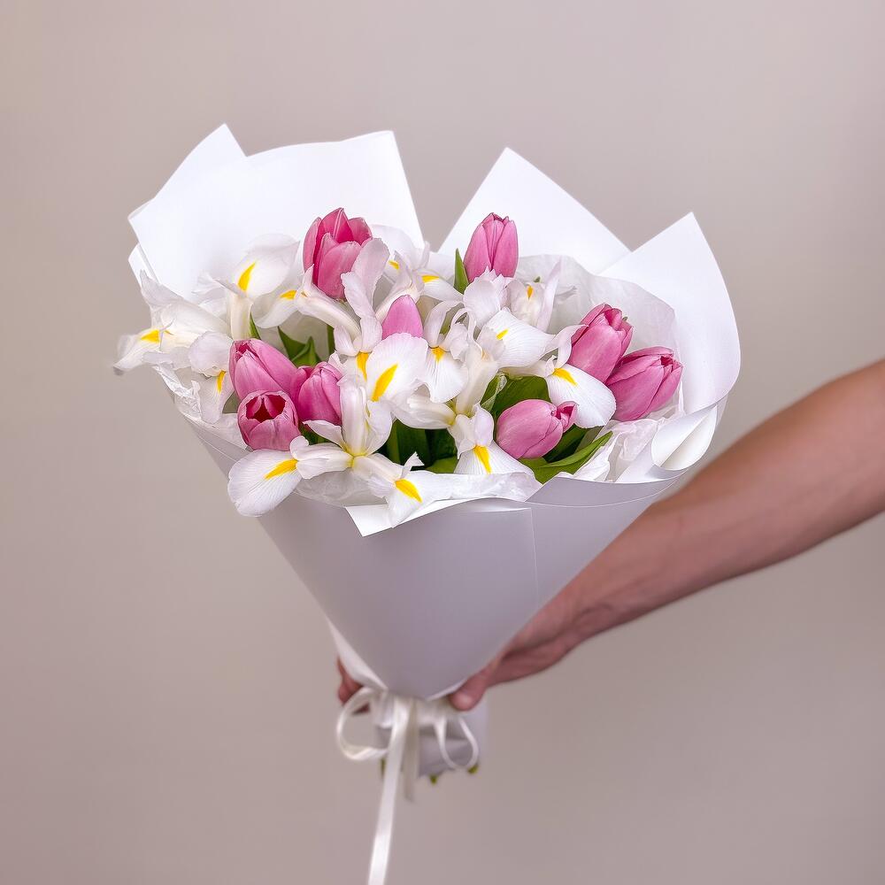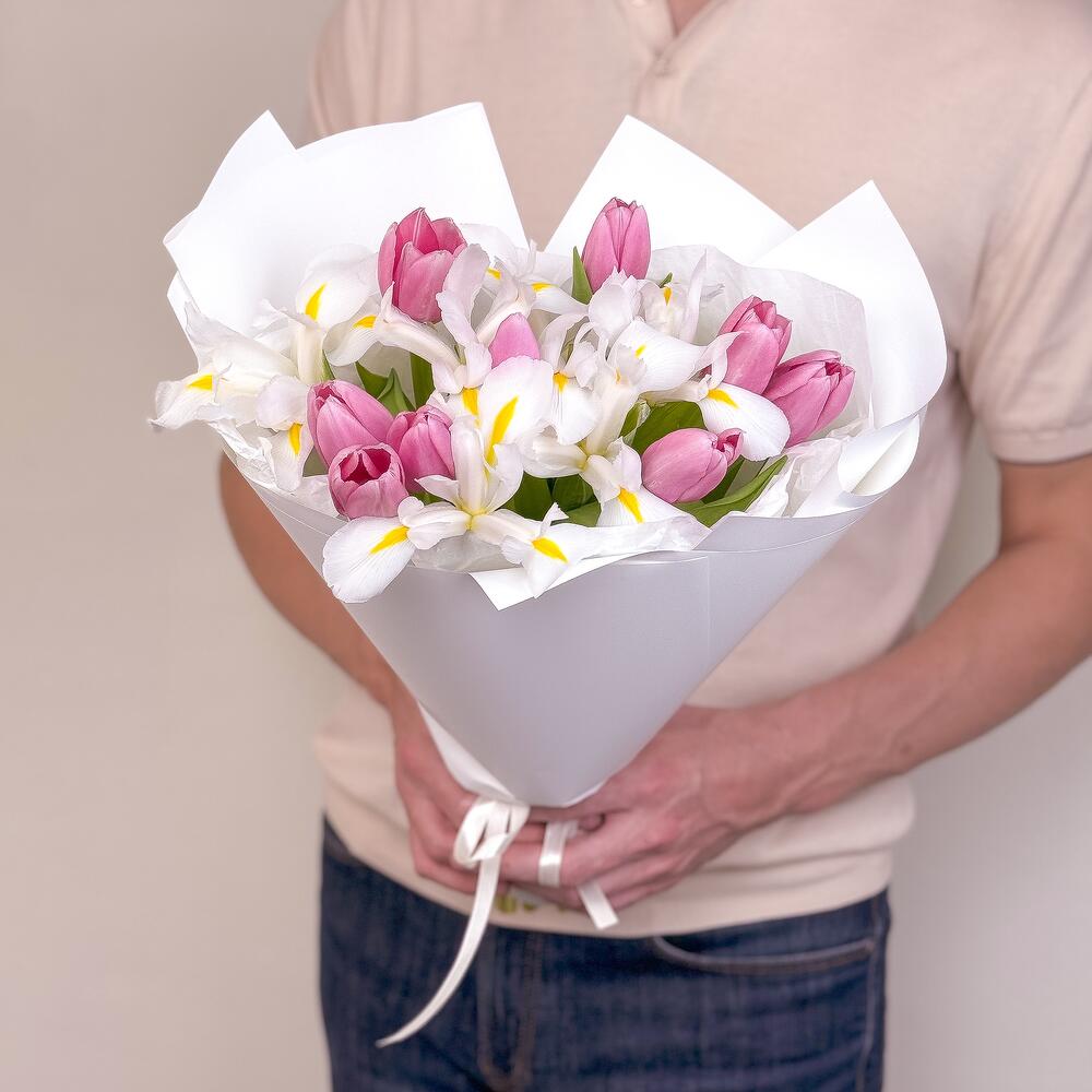 Букет из розовых тюльпанов и белых ирисов
