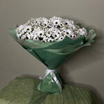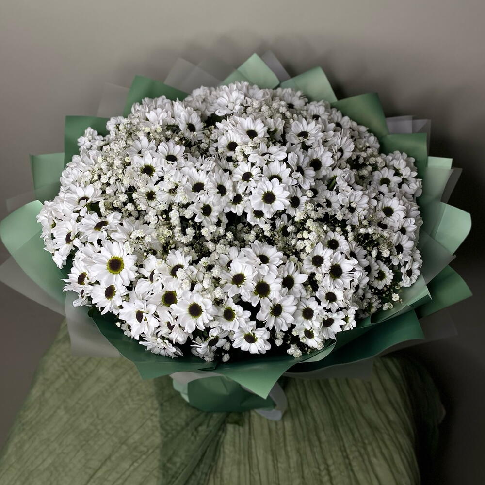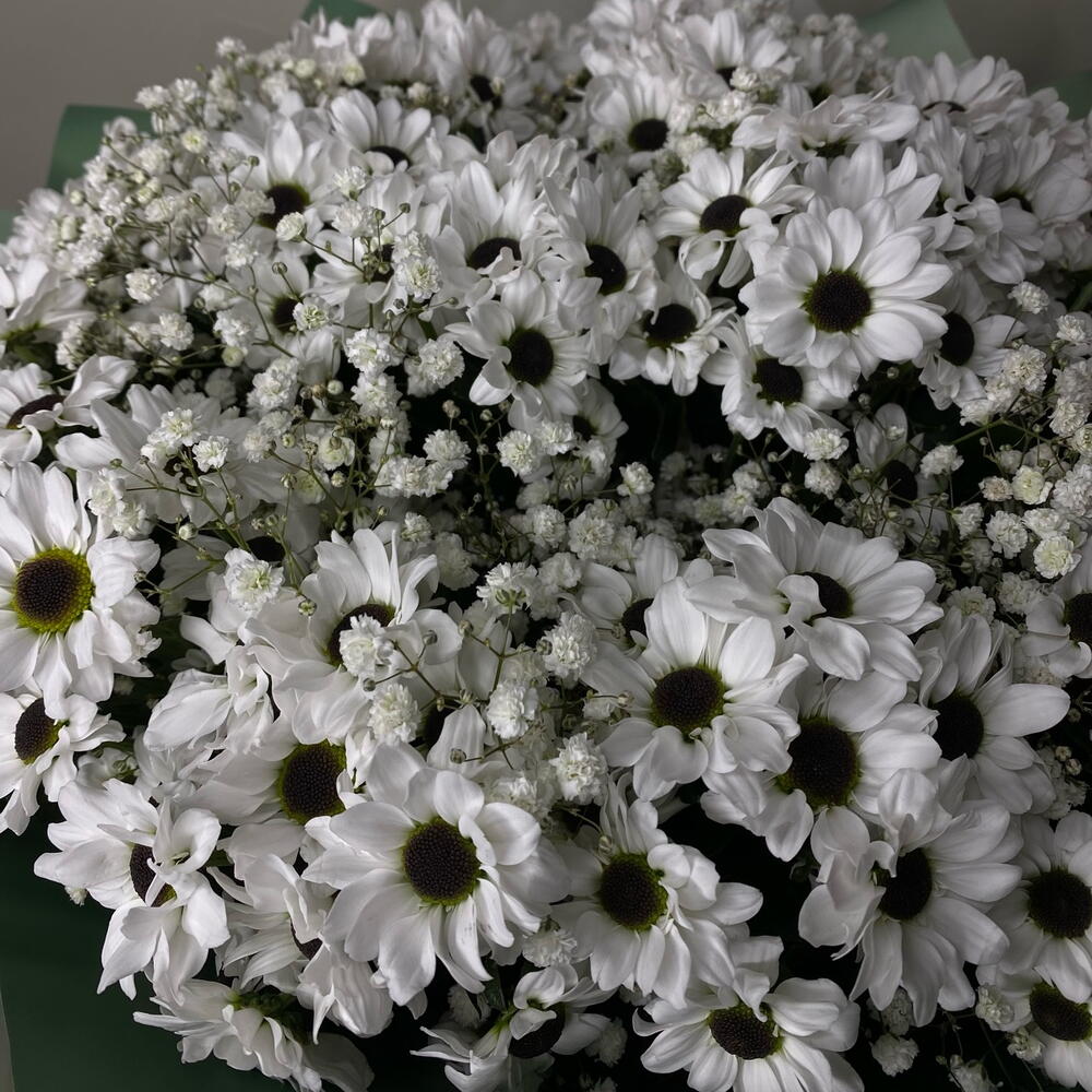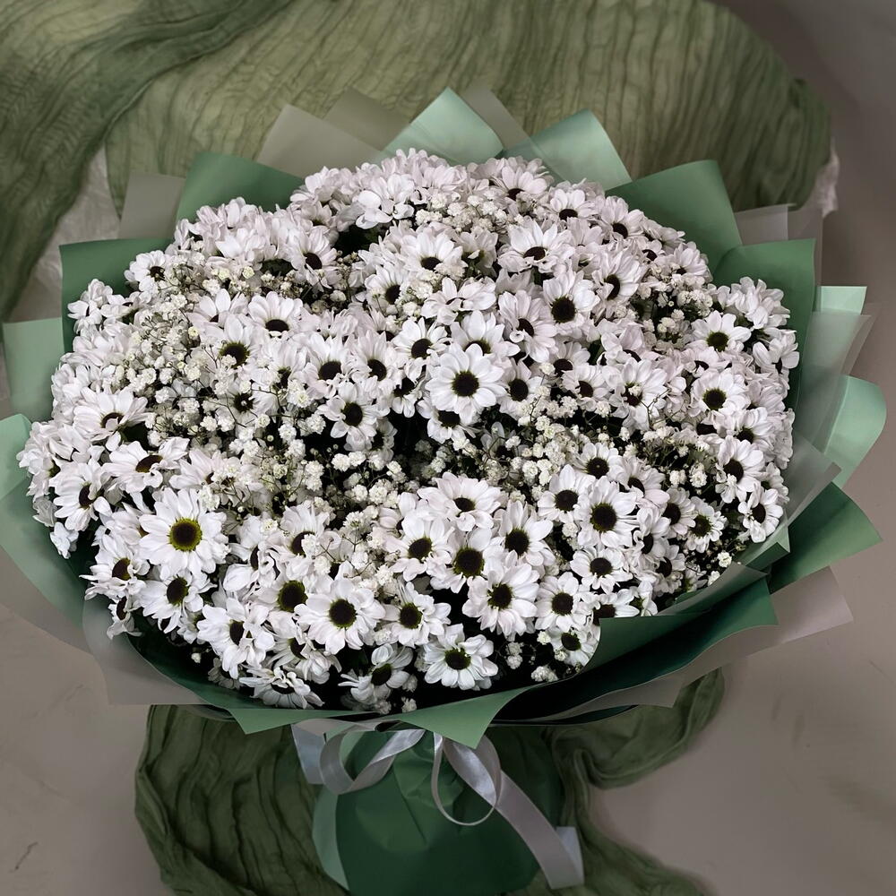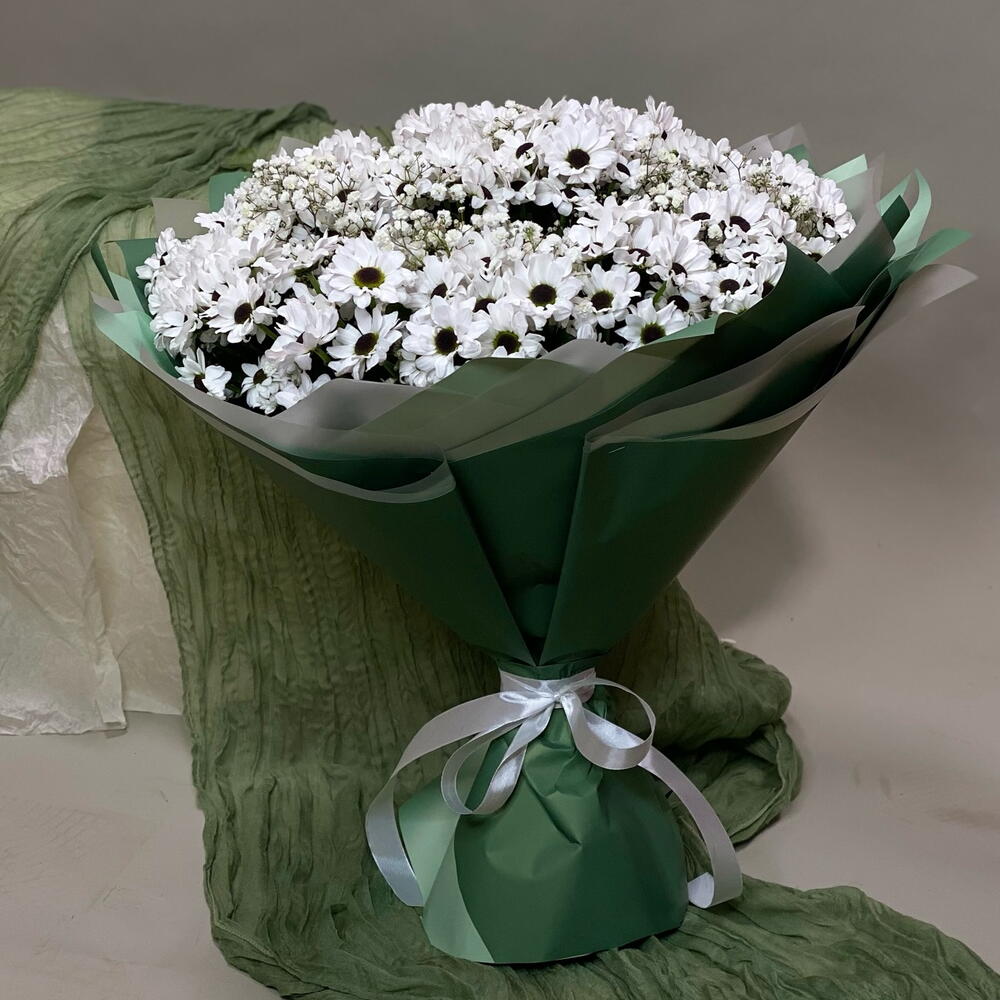 Хризантема Сантини - 25 шт. Лента атласная - 1 шт. Упаковка дизайнерская - 1 шт. Гипсофила Белая - 5 шт.