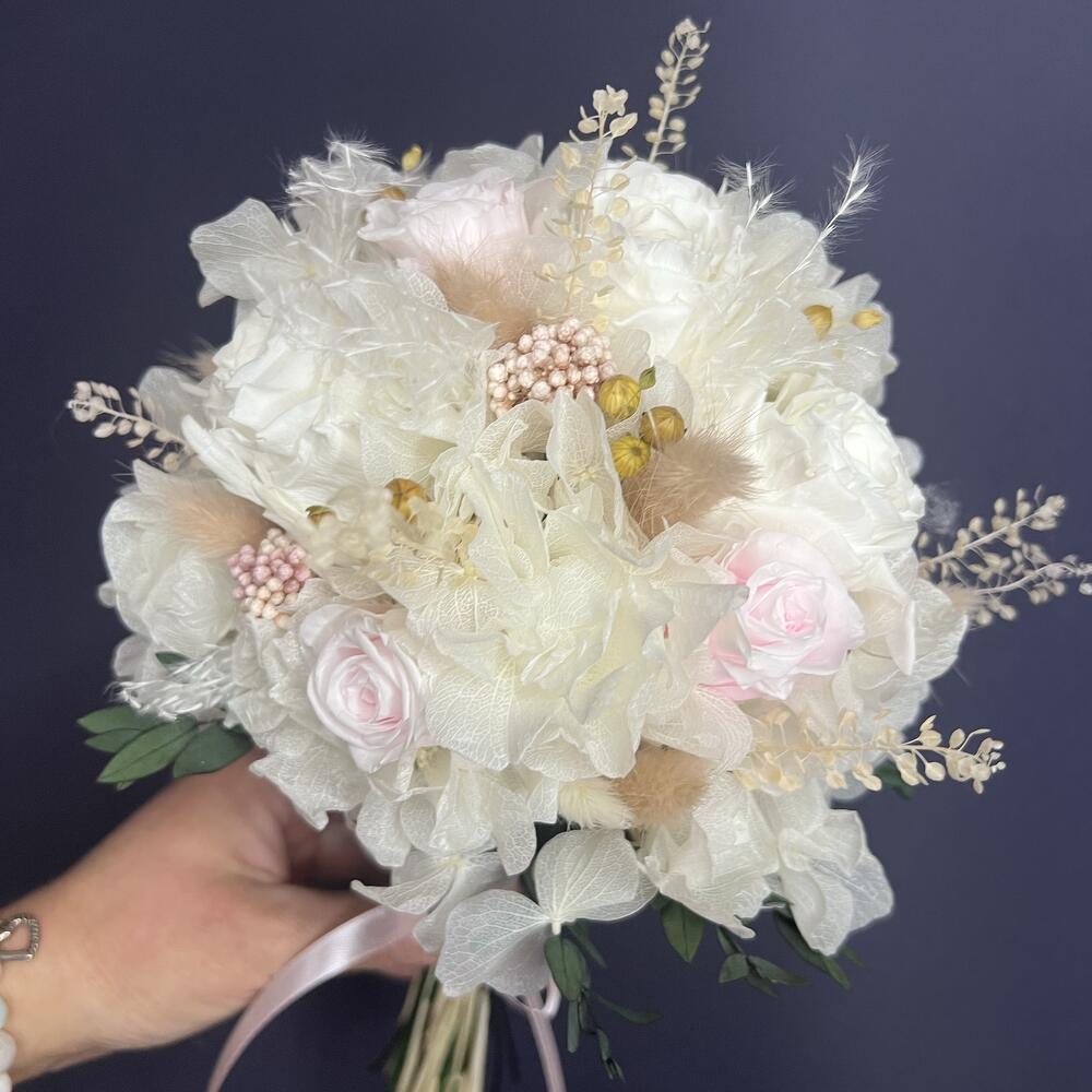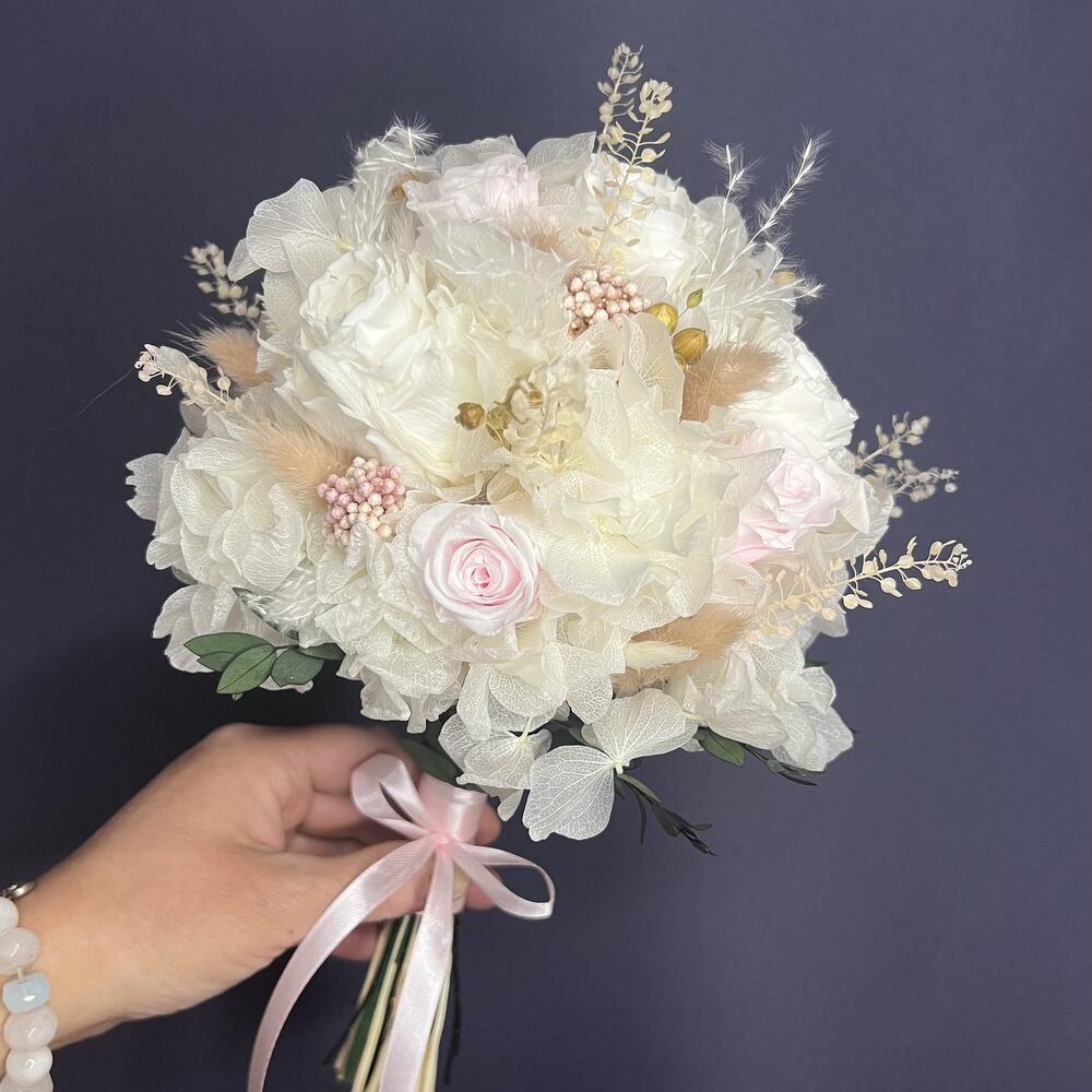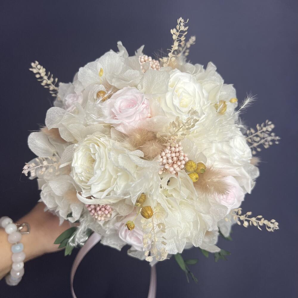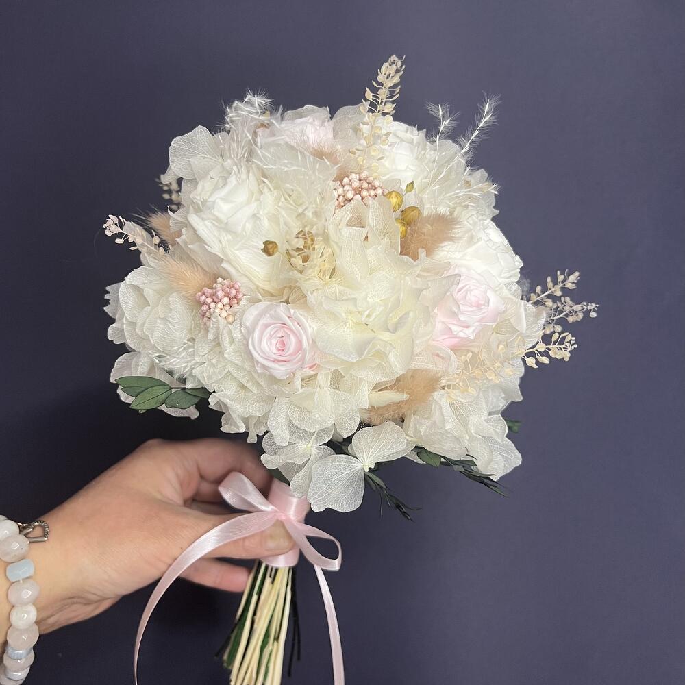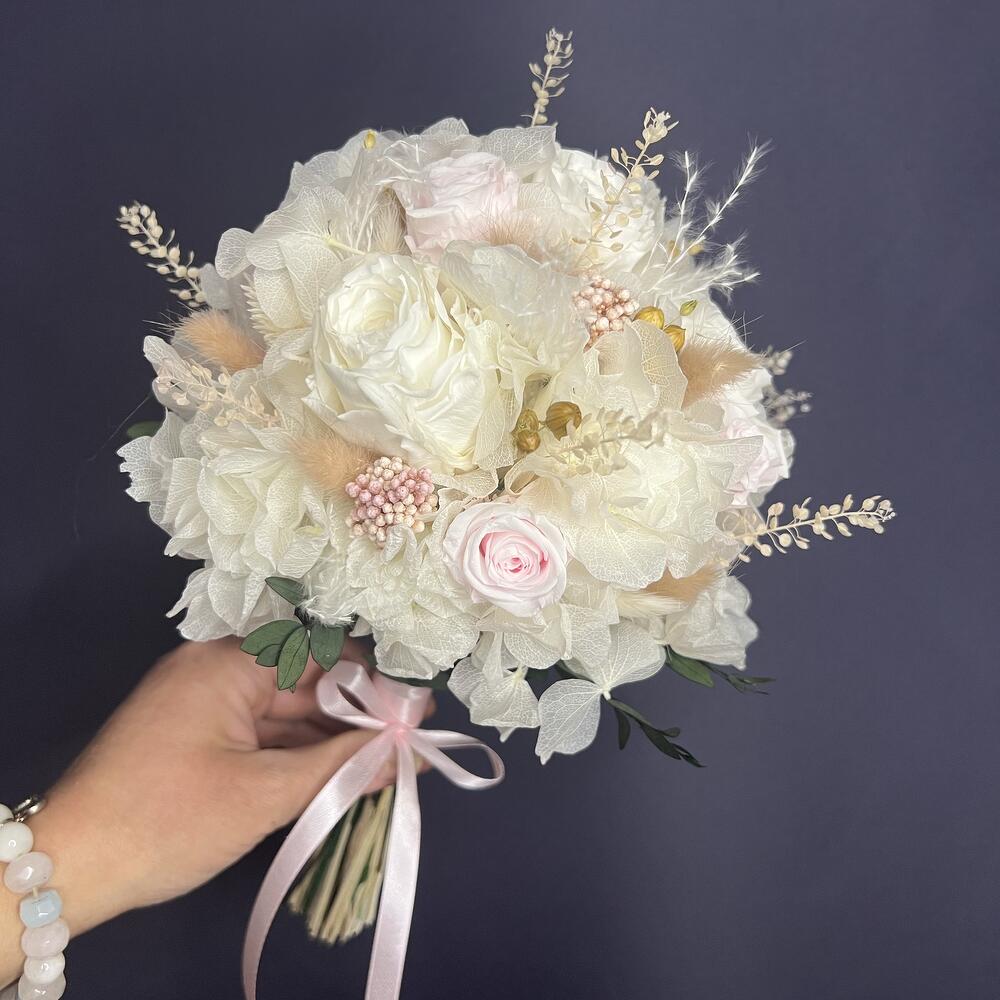 Нежный букет из стабилизированных цветов и сухоцветов. Можно испечь как букет невесты. Букет который не завянет через пять дней, а будет радовать вас много лет. Ухода не требует, подальше от влажных мест и прямых солнечных лучей. Сдувать пыль феном установив низкую скорость потока воздуха.