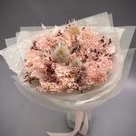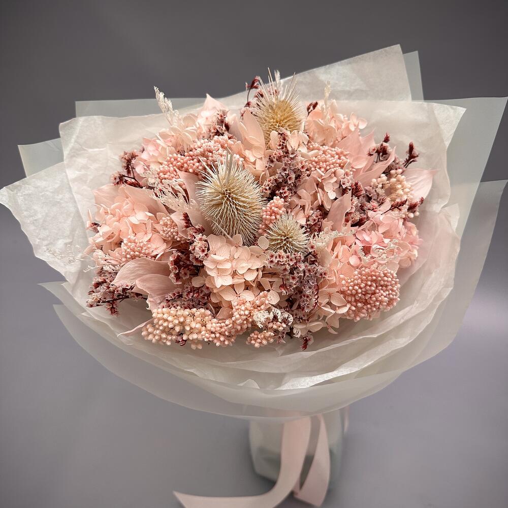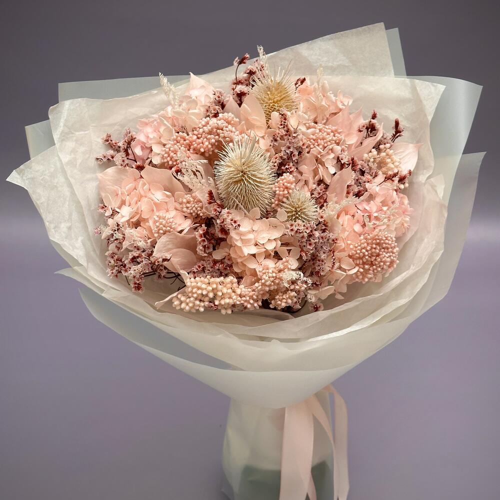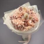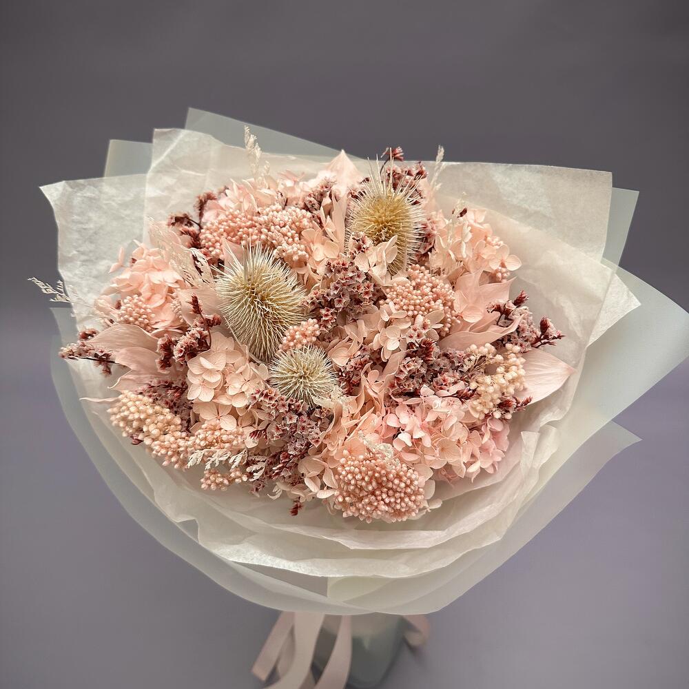 Озотамнус - 2 шт. Лента атласная - 1 шт. Упаковка дизайнерская - 2 шт. рускус стабилизированный - 1 шт. гортензия стабилизированная - 1 шт. ворсянка - 3 шт. лимониум стабилизированный - 3 шт. статица стабилизированная - 2 шт.