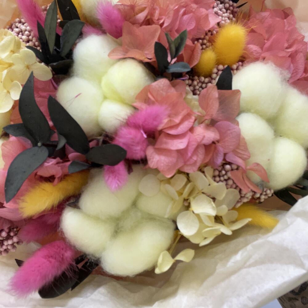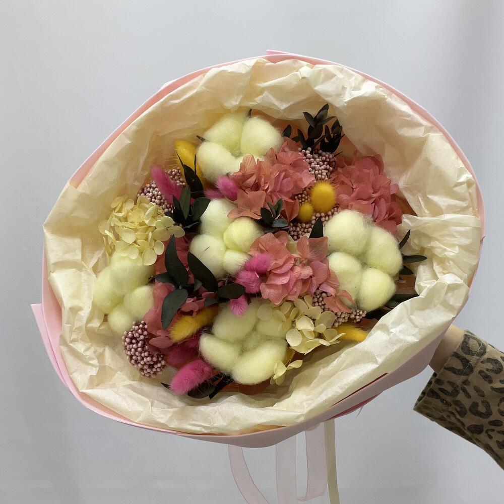 Хлопок - 5 шт. Эрингиум - 1 шт. Упаковка дизайнерская - 1 шт. гортензия стабилизированная - 1 шт. эвкалипт стабилизированный ветка - 1 шт. озотамнус(сухоцвет) - 3 шт.
