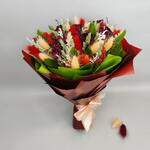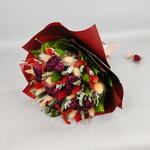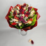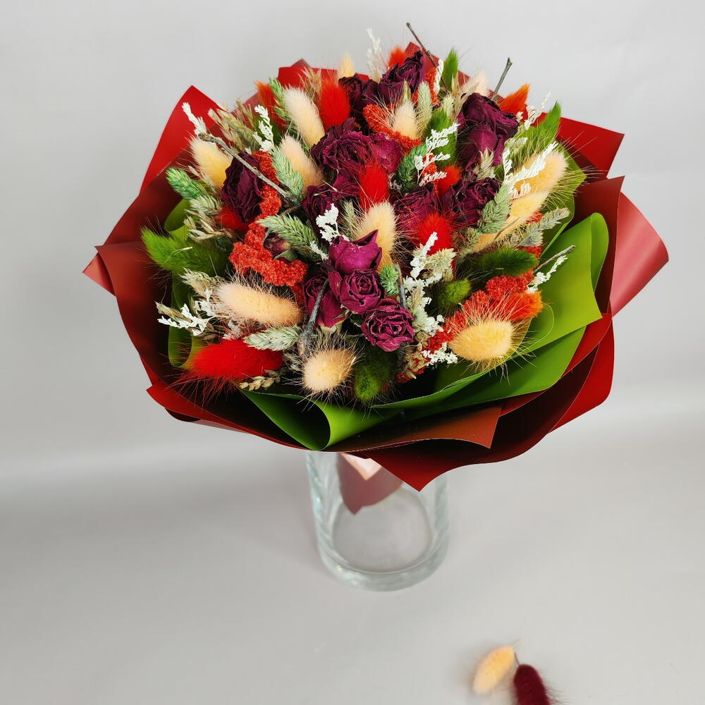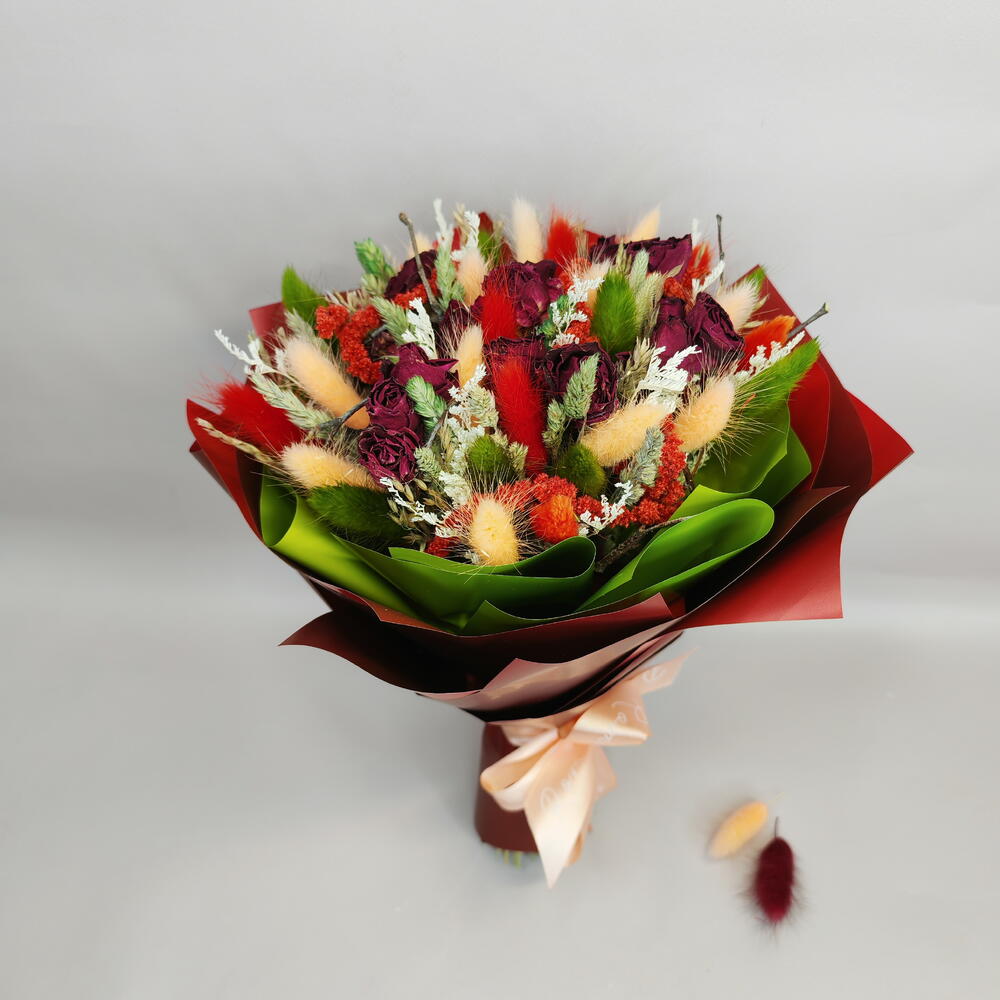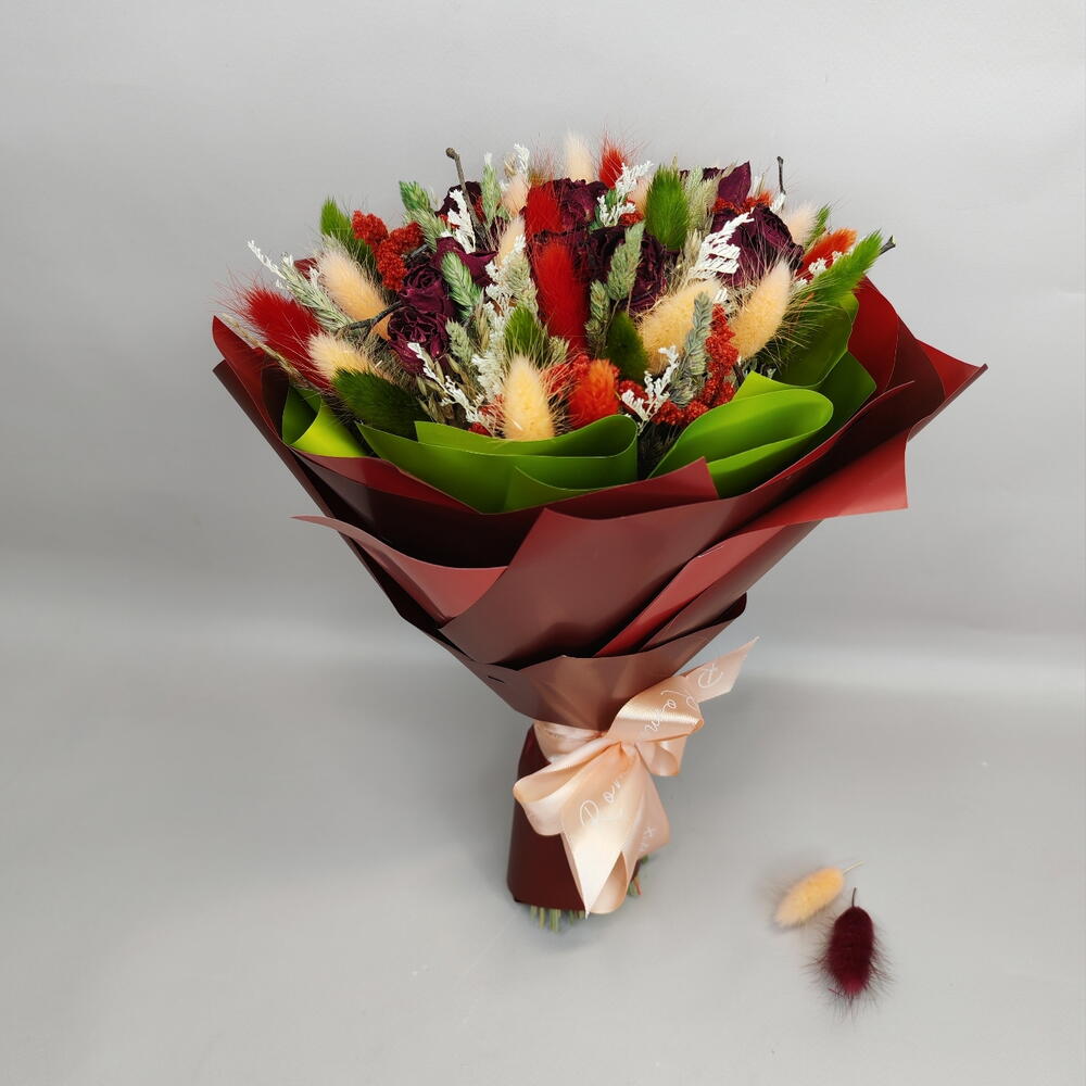 Атласная лента - 1 шт. Пленка матовая - 2 шт. лагурус сухоцвет - 27 шт. лимониум стабилизированный - 5 шт. тимофеевка сухоцвет - 8 шт. ежа сухоцвет - 18 шт. роза садовая сухоцвет - 7 шт.