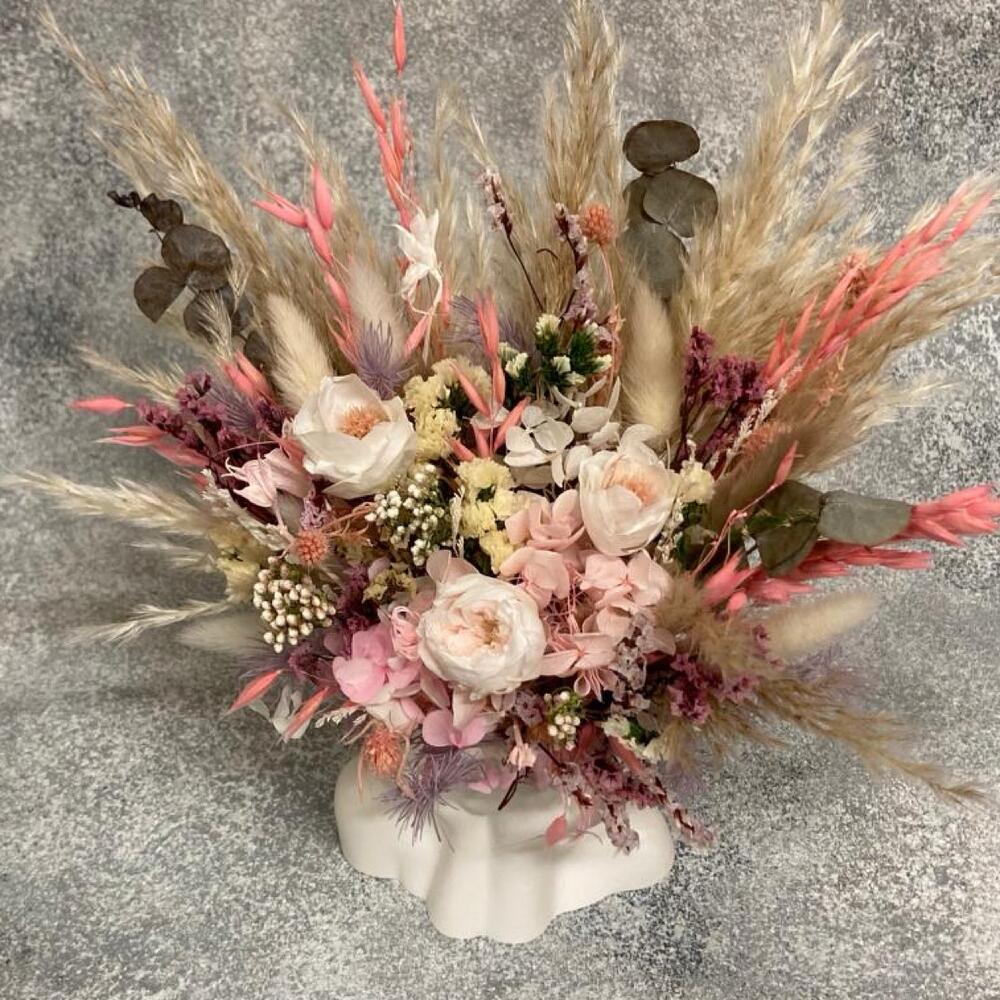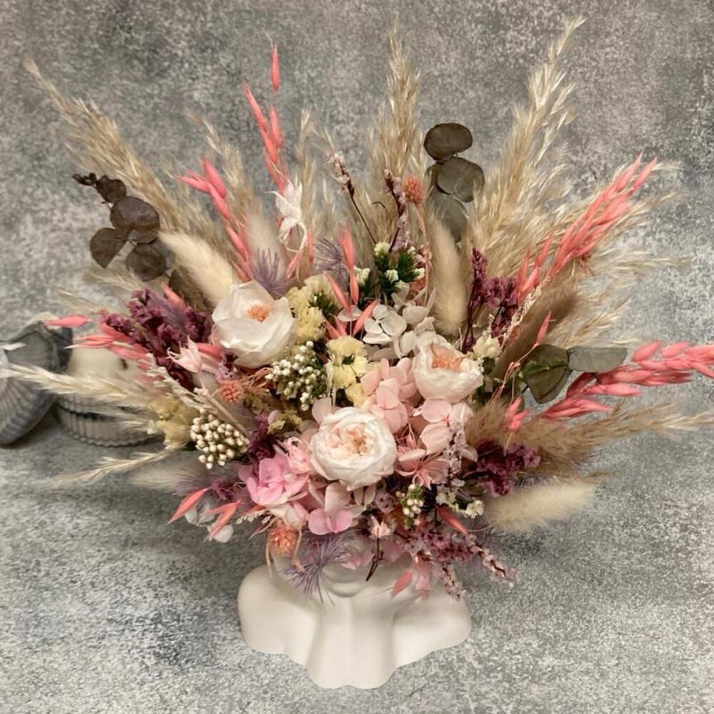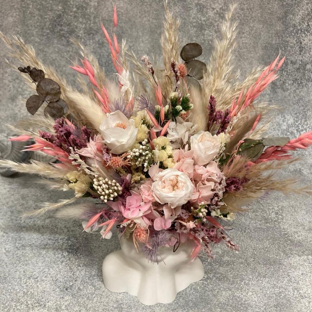 Лагурус (сухоцвет) - 5 шт. овес сухоцвет - 7 шт. гортензия стабилизированная - 5 шт. лимониум стабилизированный - 5 шт. розы стабилизированные - 1 шт. статица стабилизированная - 3 шт. озотамнус стабилизированный - 3 шт. кашпо гипсовое - 1 шт. синеголовник стабилизированный - 3 шт. пампасная трава сухоцвет - 5 шт. цветок фантазийный стабилизированный - 2 шт.