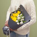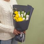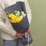 Весенний букет из желтых нарциссов, белых тюльпанов, генисты в дизайнерской упаковке. Очень красивый букет для подарка ко всем весенним праздникам.