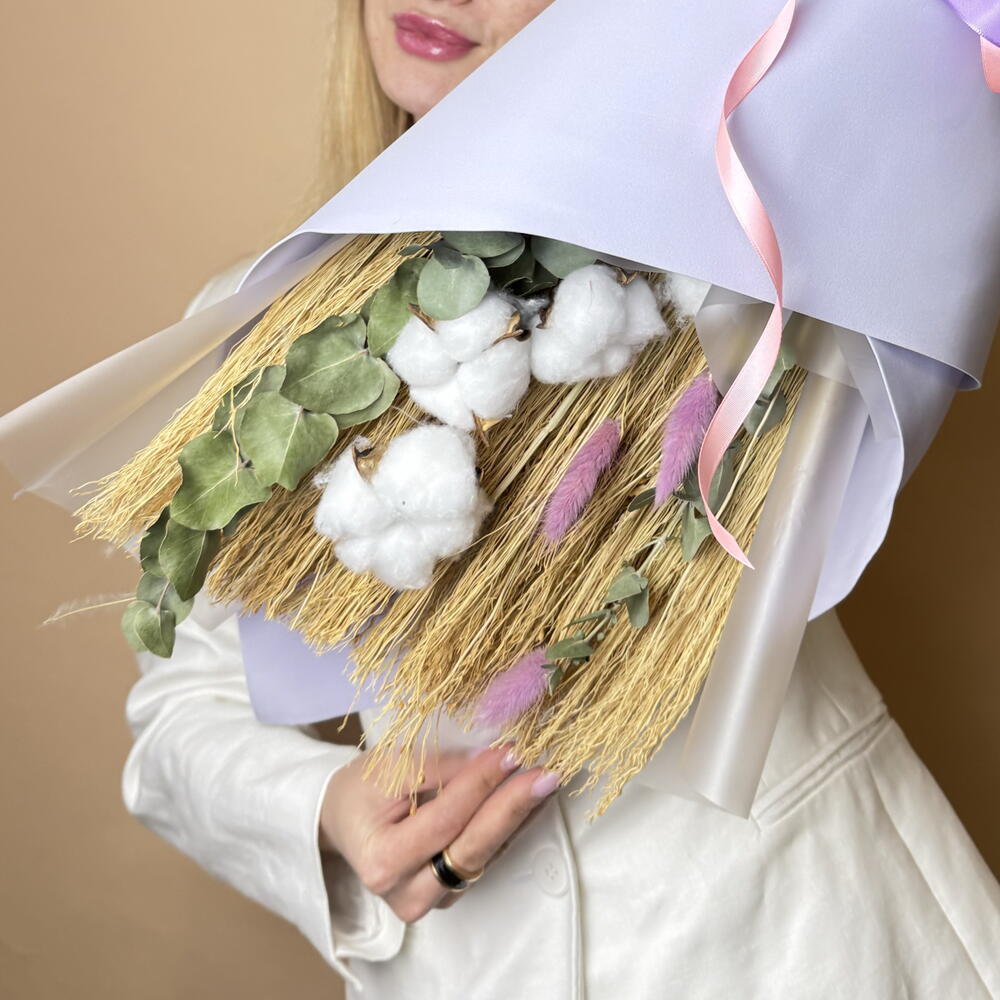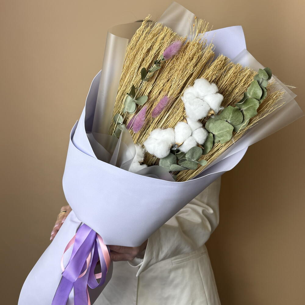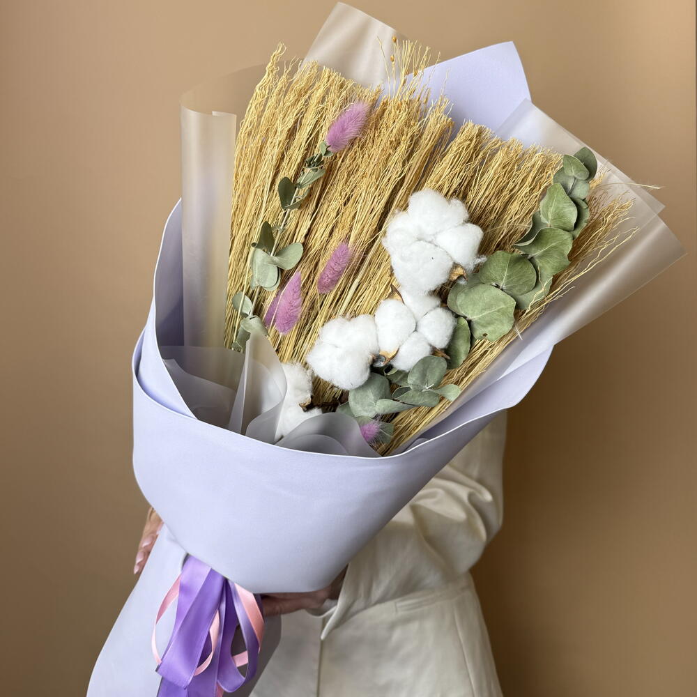 Лента - 1 шт. Упаковка - 2 шт. Хлопок ветка - 1 шт. Эвкалипт сухоцвет - 2 шт. лагурус пучок - 1 шт. веник - 1 шт.