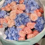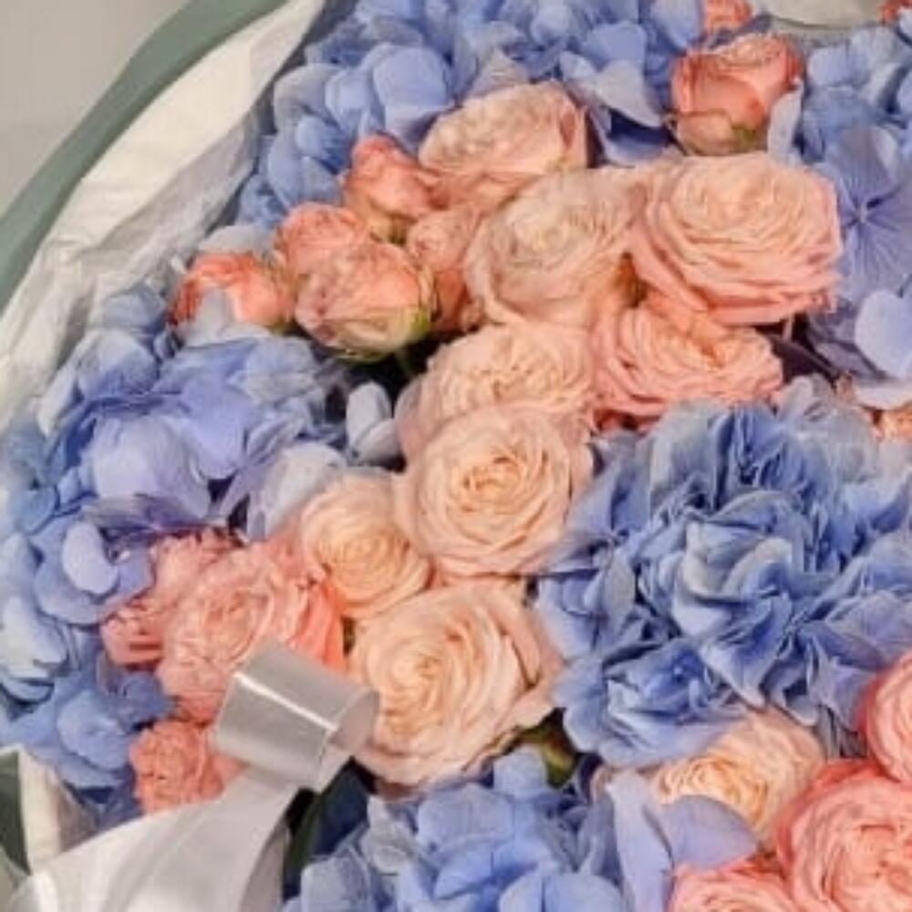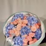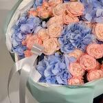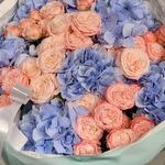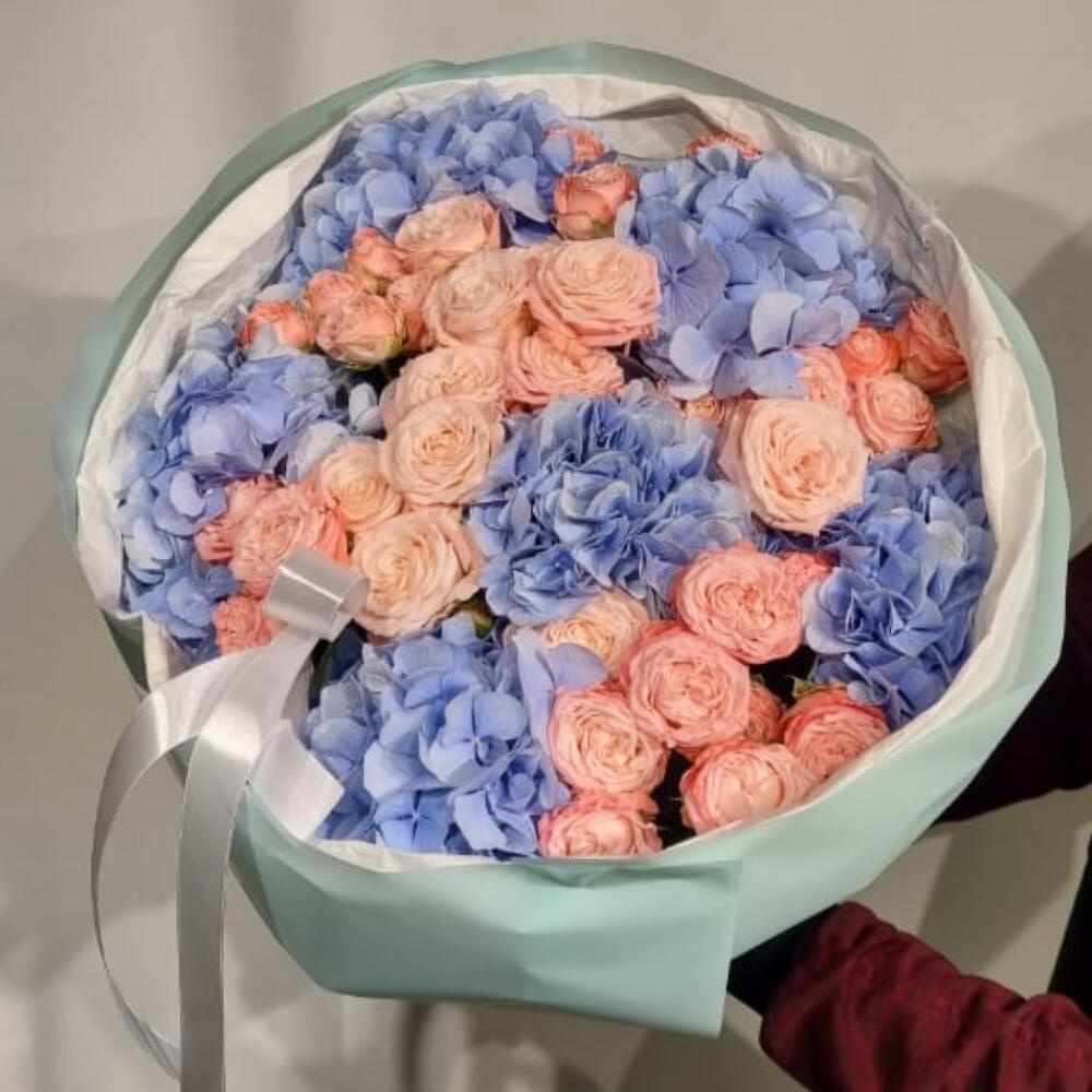 Наши преимущества • Личный менеджер, который курирует заказ от начала до вручения • Согласование фото букета перед отправкой и возможность внести изменения по вашему желанию • Дополнительные подарки — сладости, шары, помощь в организации сюрпризов • Красивая упаковка, аквабокс и поздравительная открытка — бесплатно Прекрасный букет из нежных фиолетовых гортензий и свежих кустовых розочек в красивой упаковке с доставкой по городу — отличный способ порадовать близкого человека.