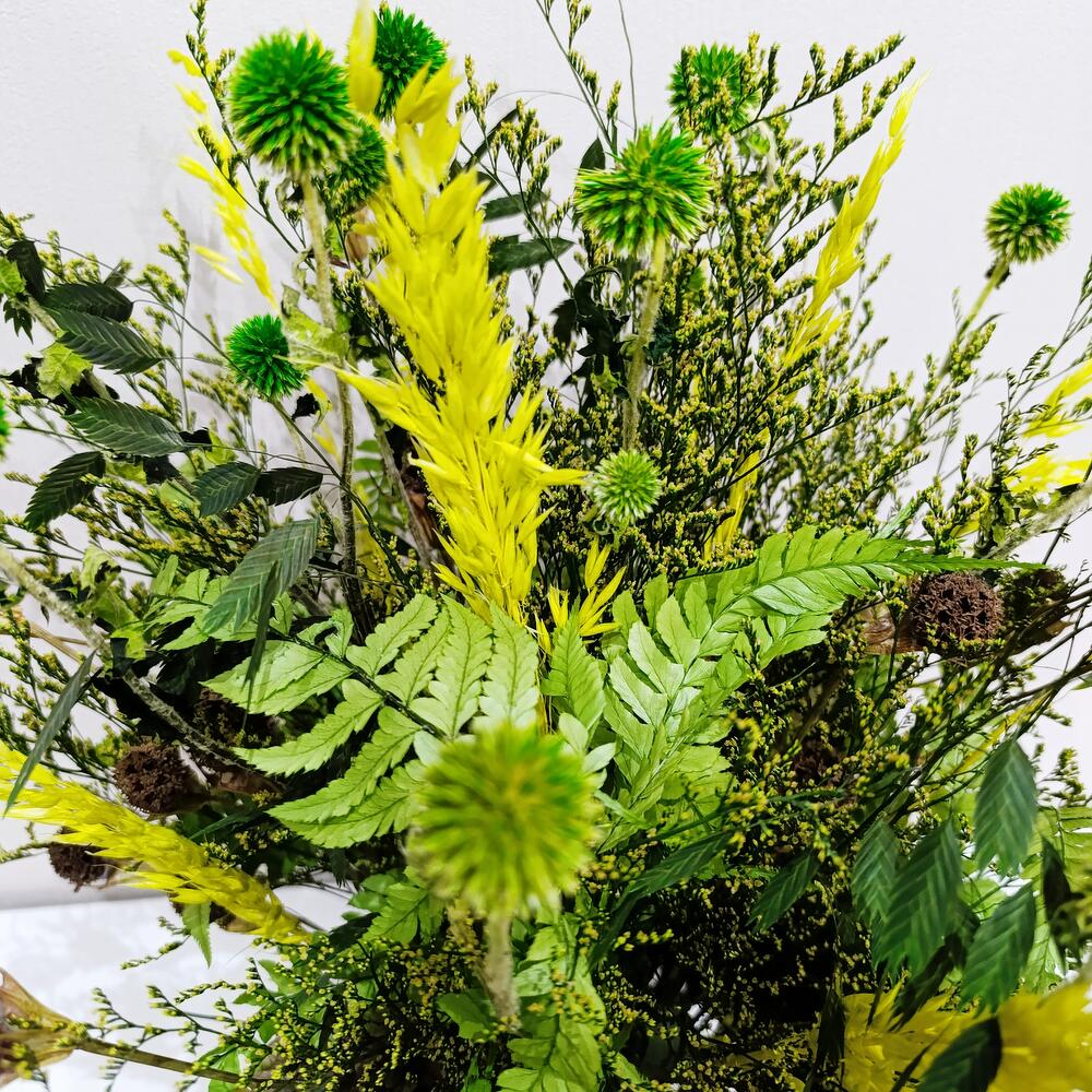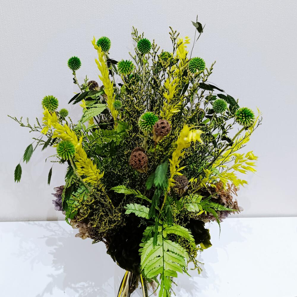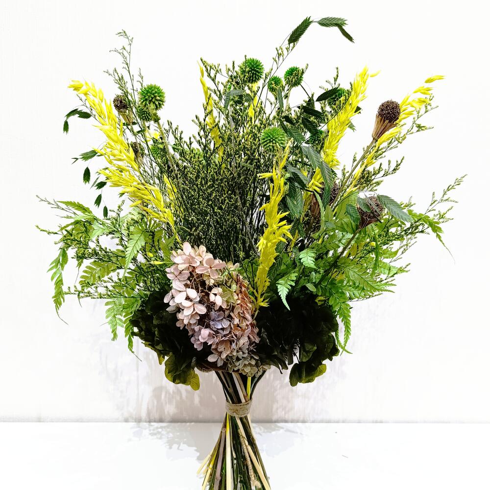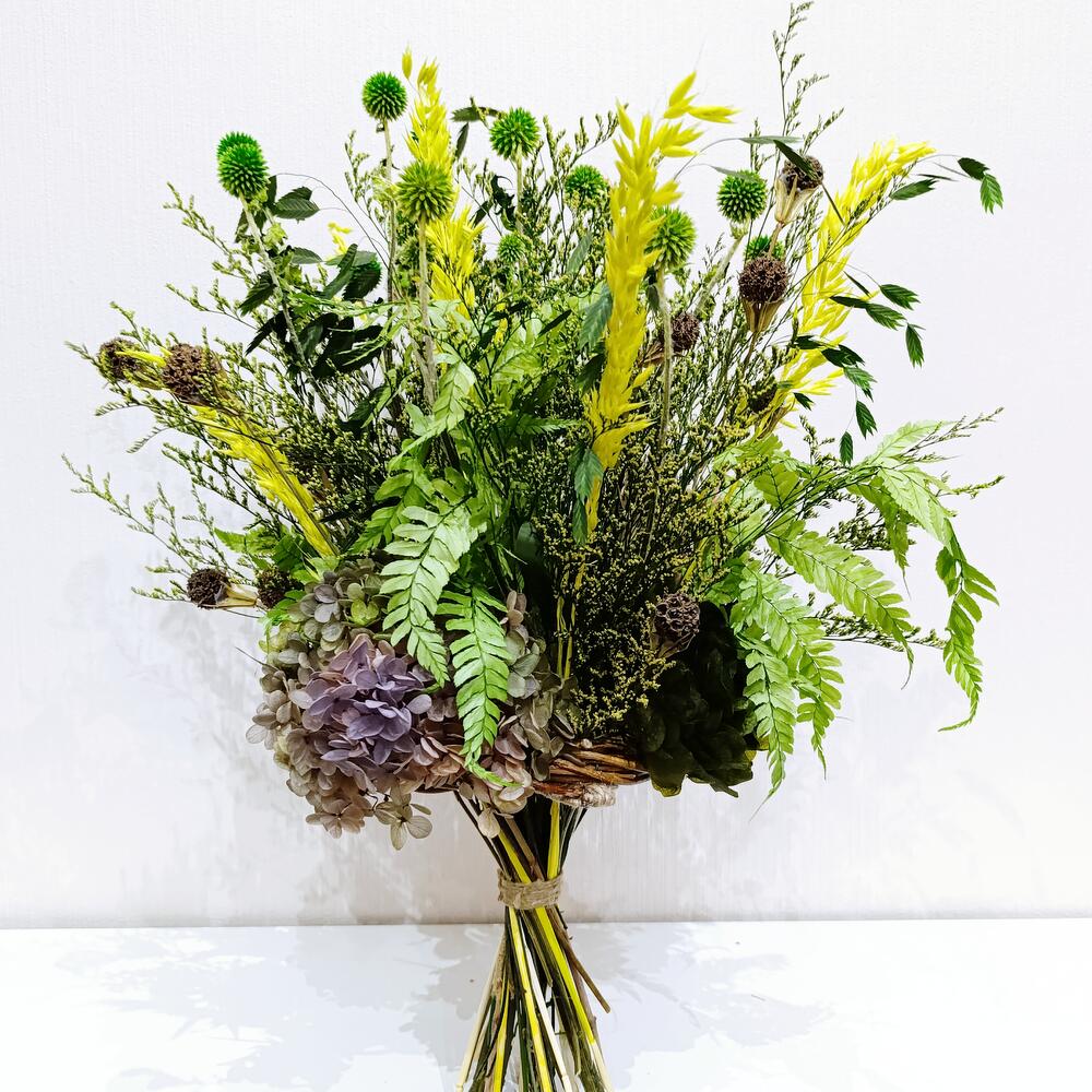 Гортензия - 2 шт. Лимониум - 5 шт. Папоротник - 4 шт. Нигелла - 5 шт. Овес - 10 шт. Хасмантиум - 5 шт. каркас ручной работы - 1 шт. мордовкик - 4 шт.