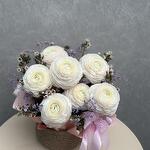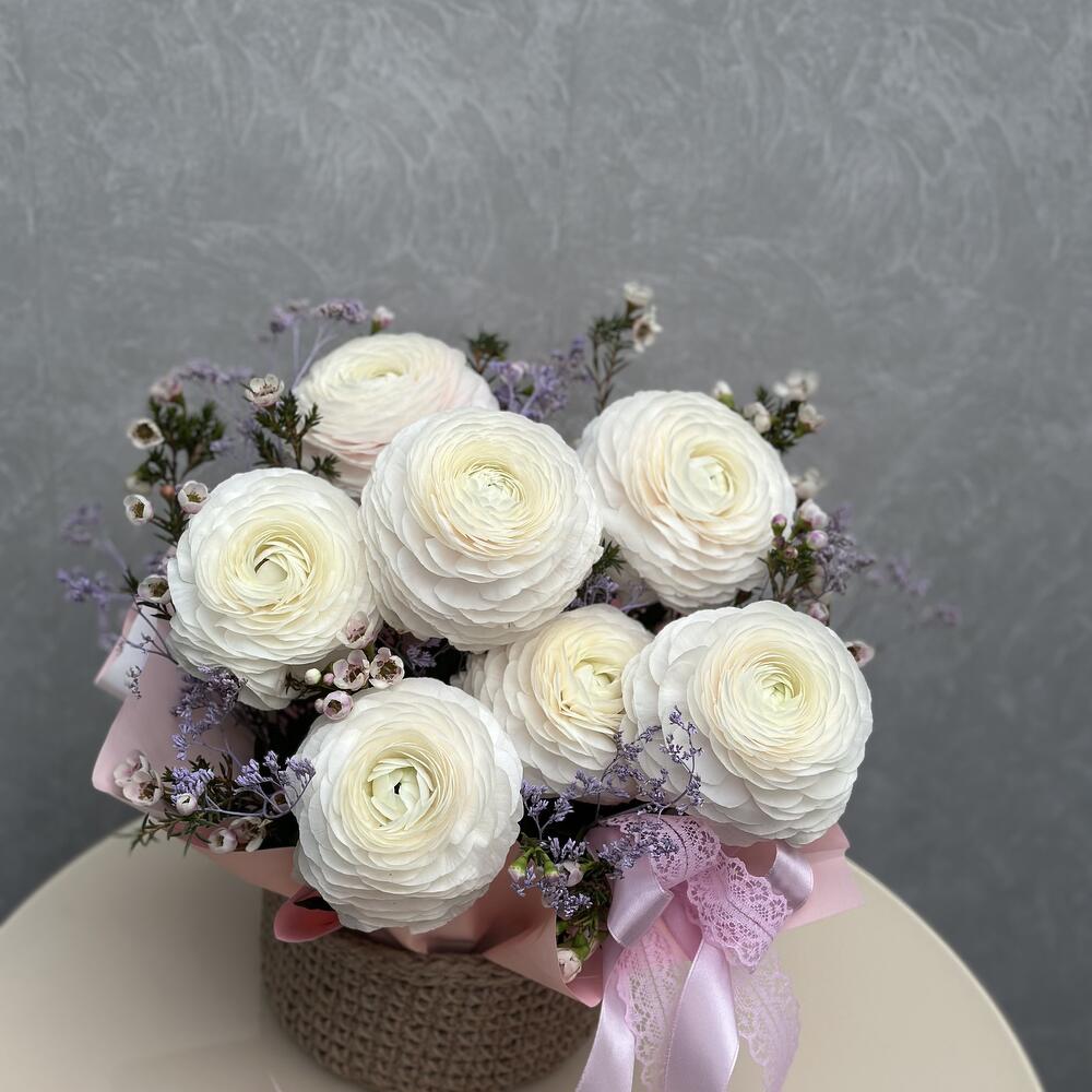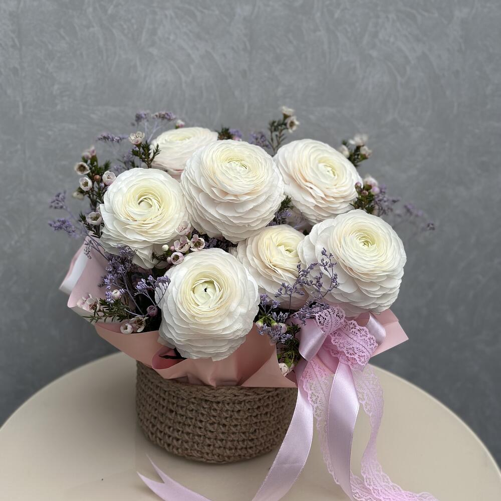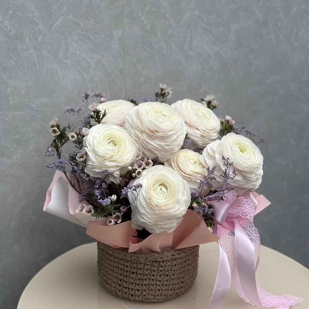 Лимониум - 1 шт. Писташ - 3 шт. Оазис - 5 шт. Хамелациум - 1 шт. Ранункулюс - 7 шт. корзина джутовая ручной работы - 1 шт. пленка матовая и лента - 1 шт.