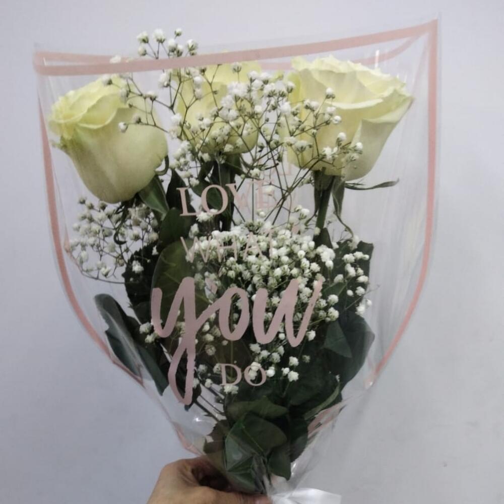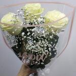 Гипсофила - 1 шт. Лента - 1 шт. Упаковка дизайнерская - 1 шт. мондиаль роза - 3 шт.