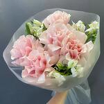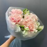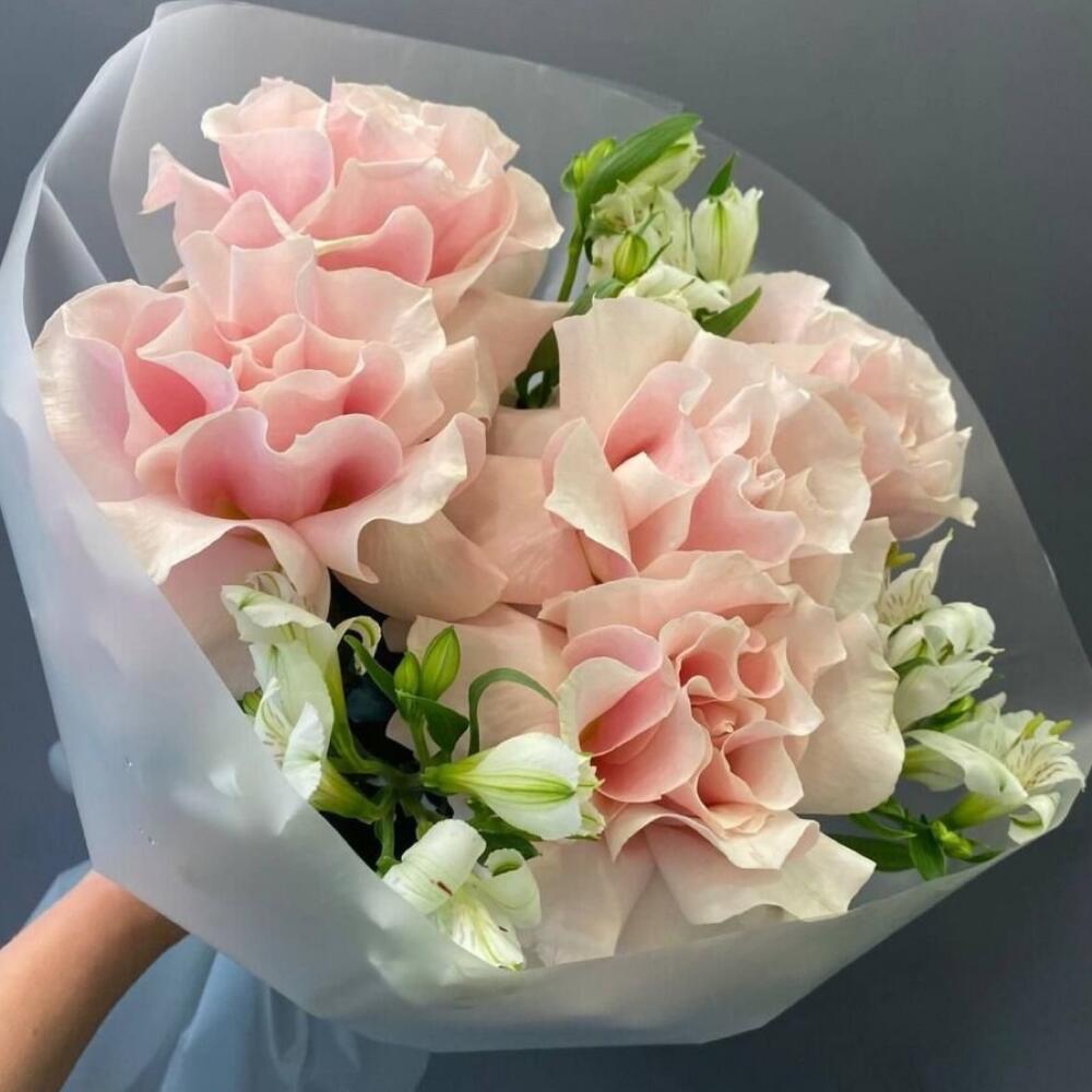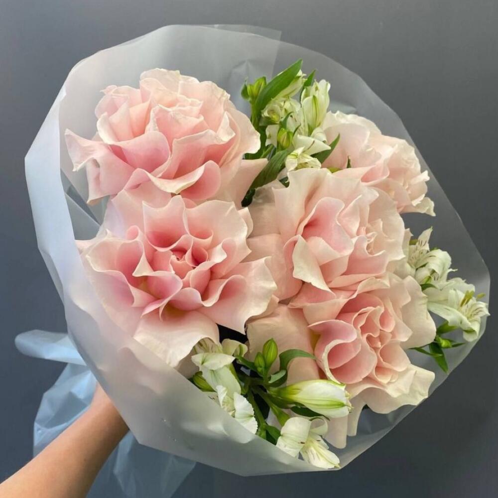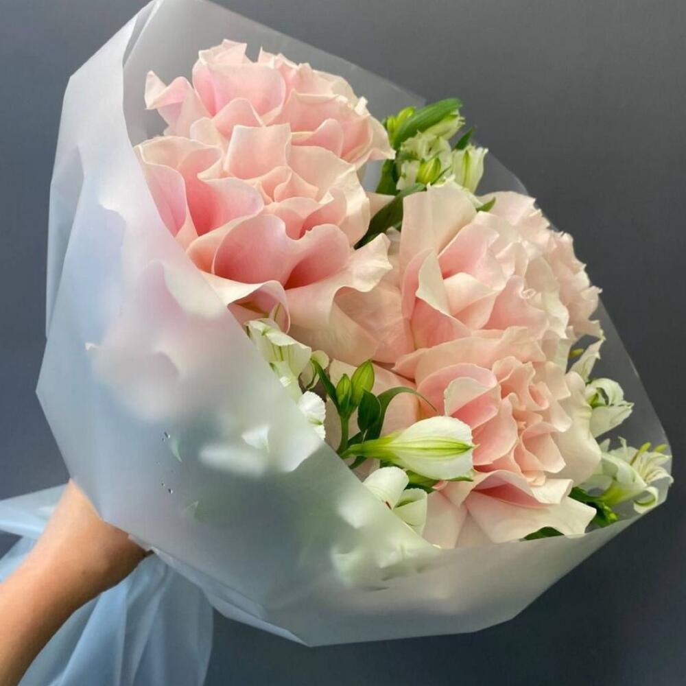 Альстромерия - 3 шт. Лента атласная - 1 шт. Упаковка дизайнерская - 1 шт. пинк мондиаль - 5 шт.