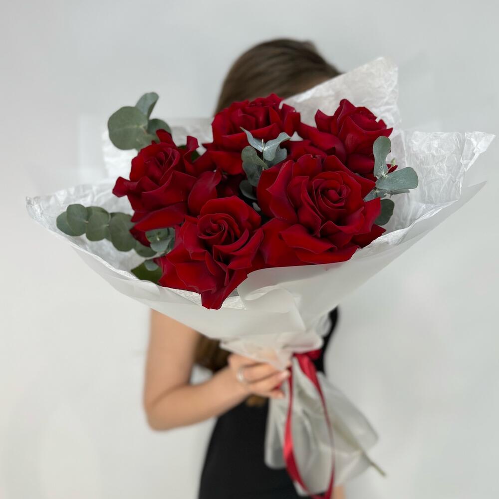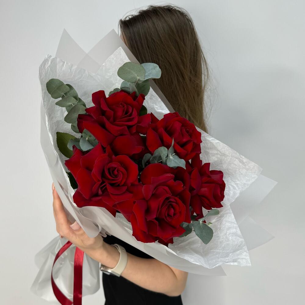 Эвкалипт - 2 шт. Лента атласная - 1 шт. Упаковка дизайнерская - 1 шт. Кризал (подкормка) - 1 шт. Открыточка с вашими пожеланиями - 1 шт. розы красные - 5 шт. рекомендация по уходу за цветами - 1 шт.