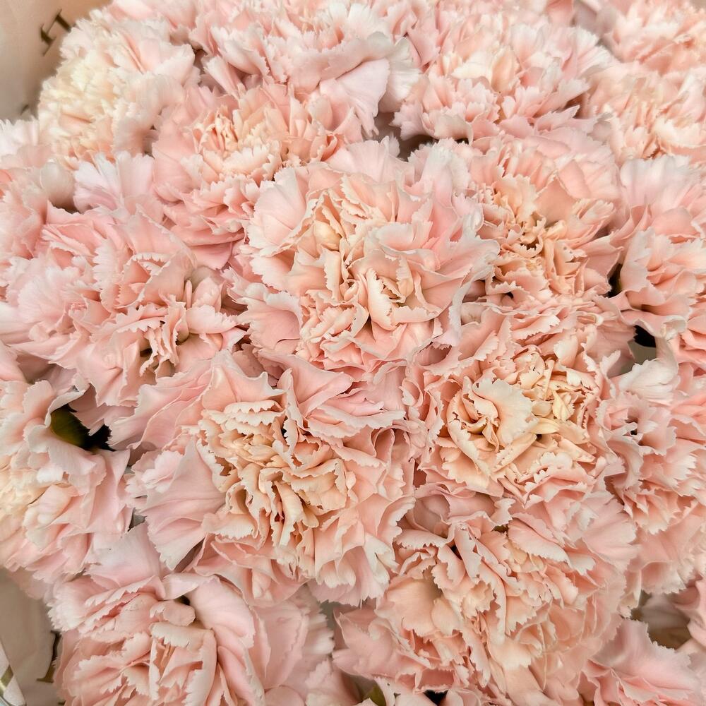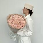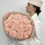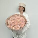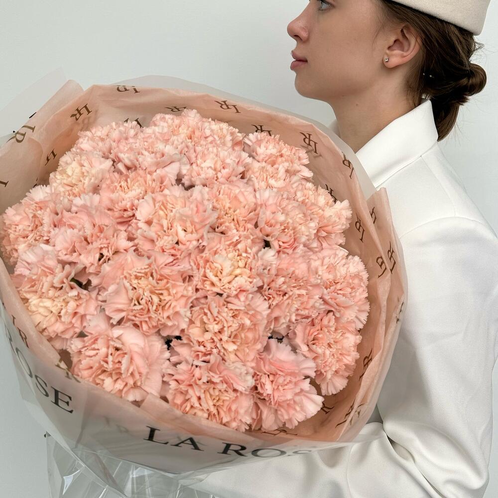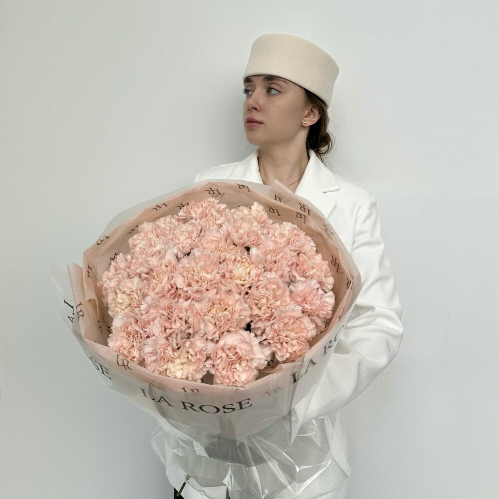 Не самый обычный выбор монобукета — гвоздики, представлены в новом прочтении. Крупный монобукет в дизайнерской бумаге в нежном цвете: идеальное и стойкое решение для вазы.