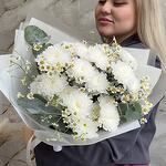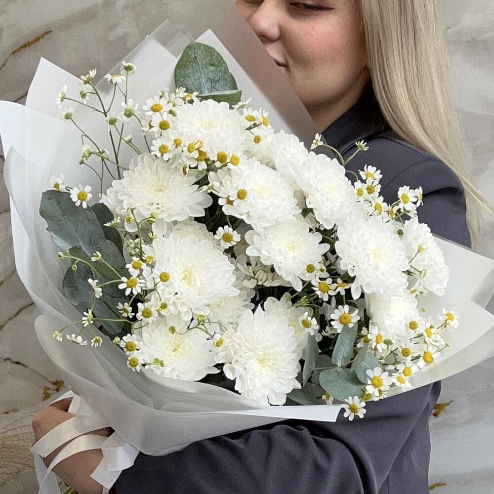Эвкалипт - 3 шт. Лента атласная - 1 шт. Ромашка кустовая - 4 шт. Упаковка дизайнерская - 1 шт. хризантема кустовая кружевная - 3 шт.