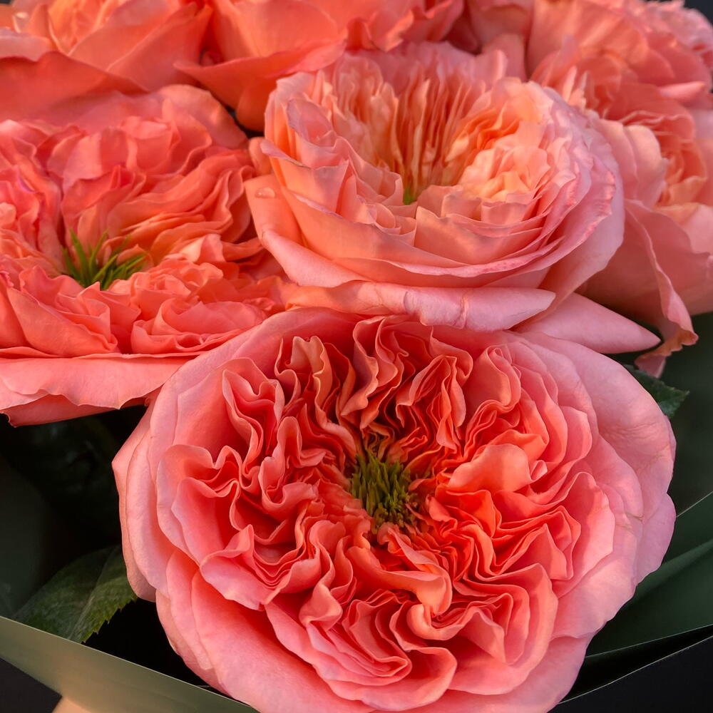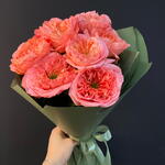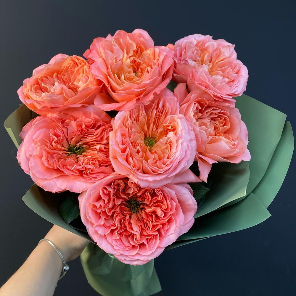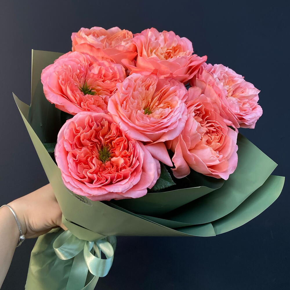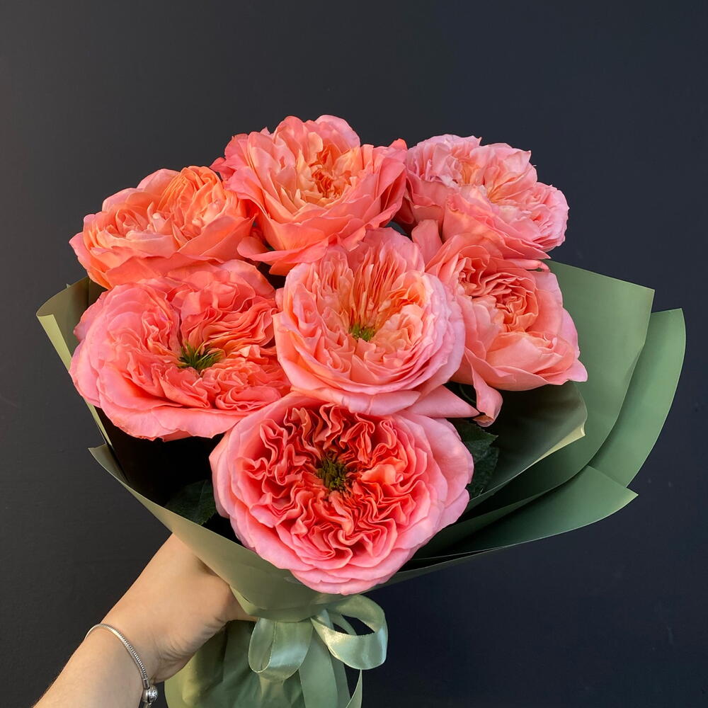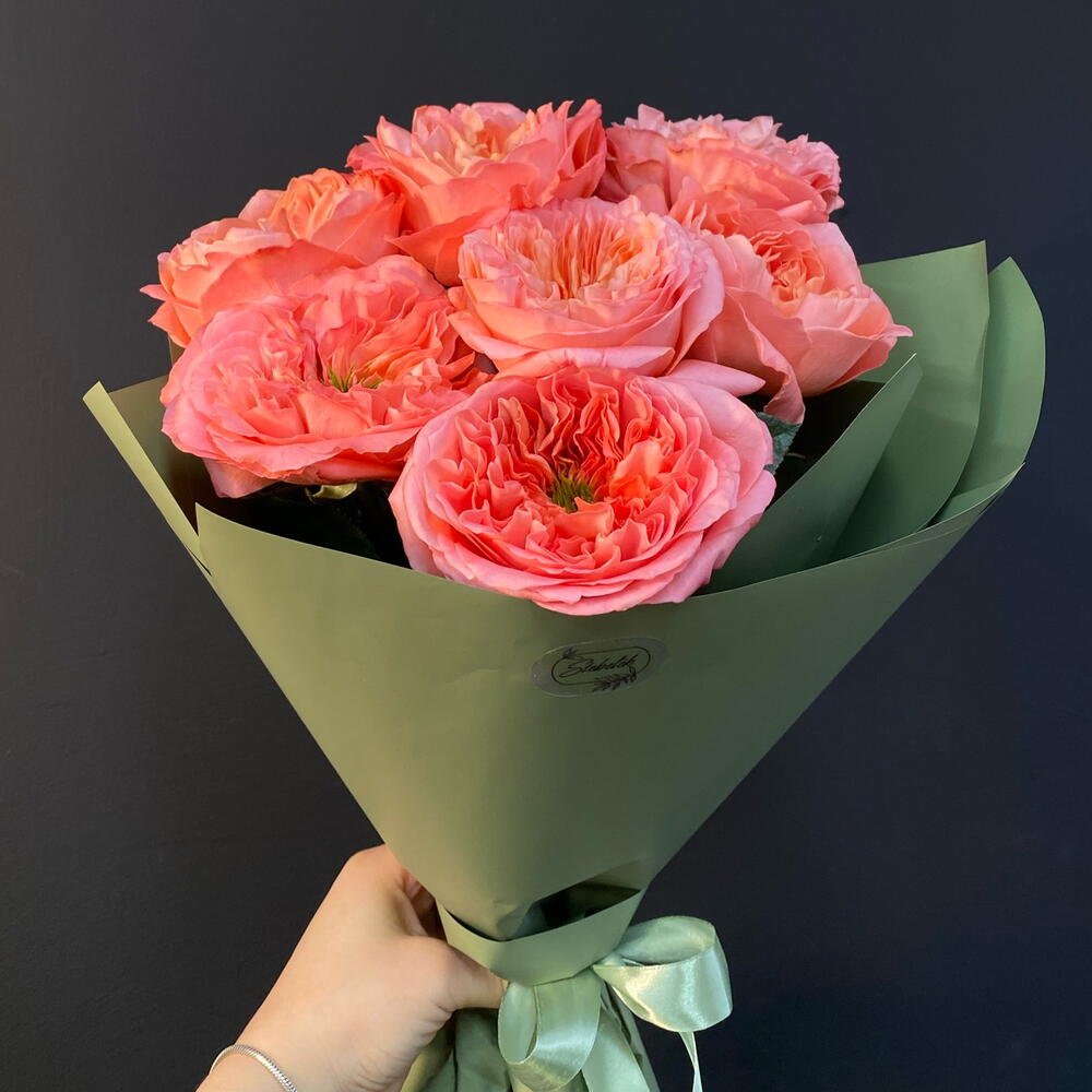 Лента атласная - 2 шт. Упаковка дизайнерская - 3 шт. роза «мандарин» пионовидная - 7 шт.
