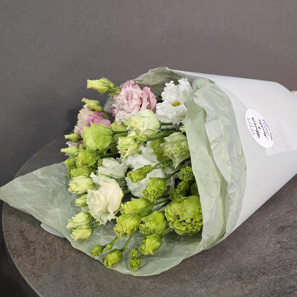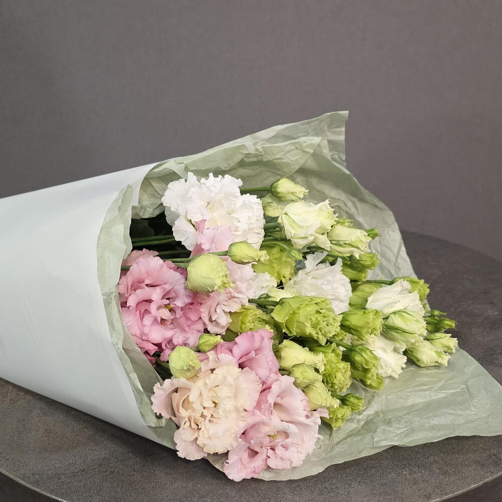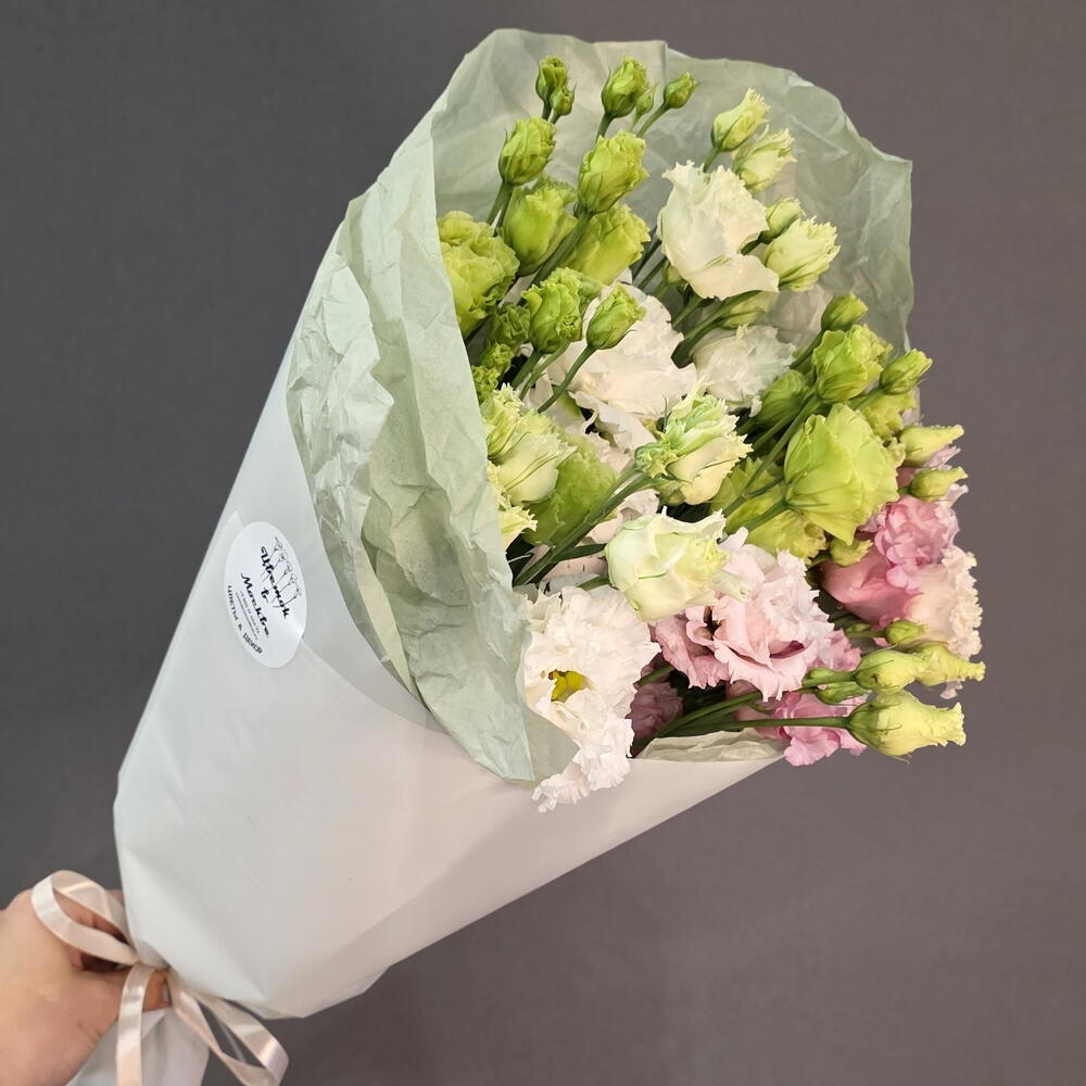 Лента атласная - 1 шт. Тишью - 1 шт. Упаковка дизайнерская - 1 шт. Эустома мохровая - 5 шт.